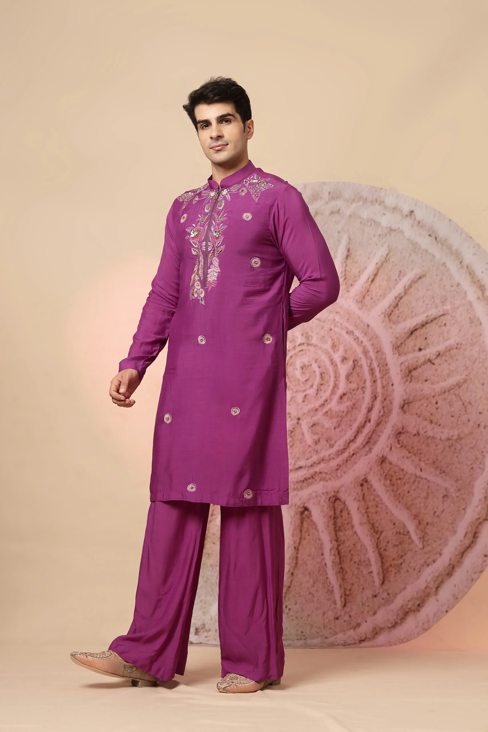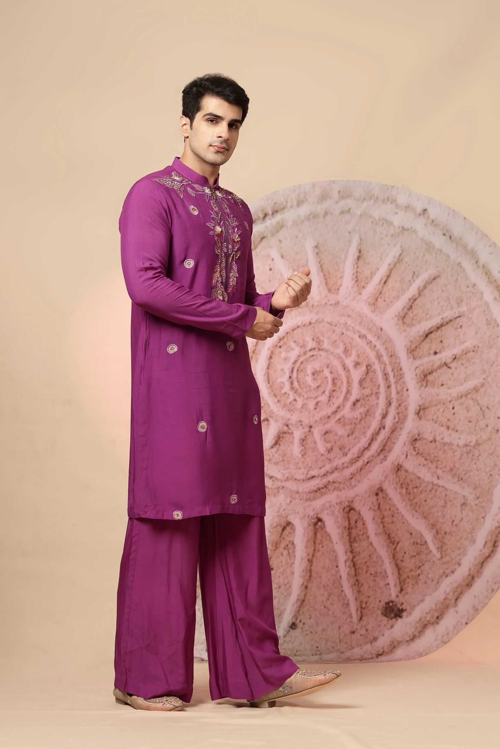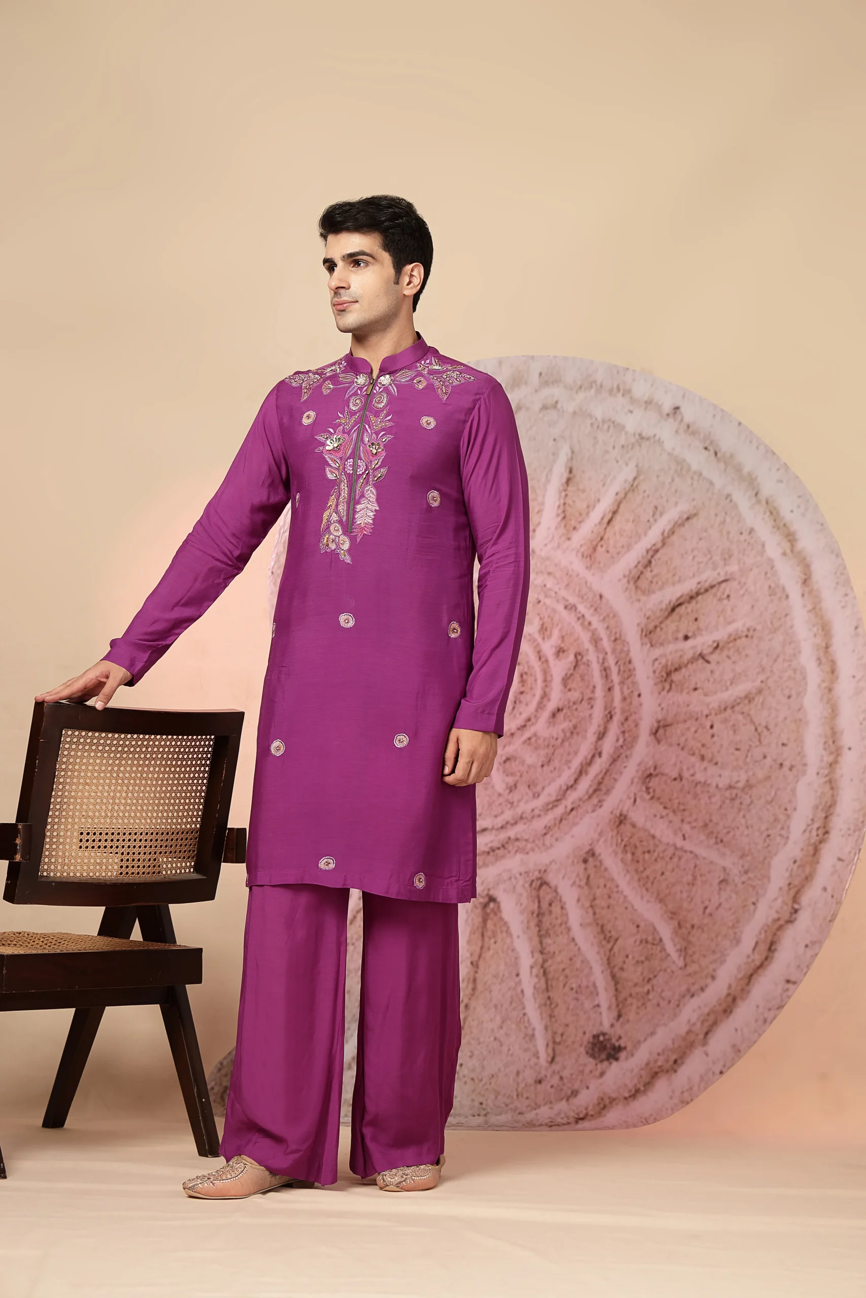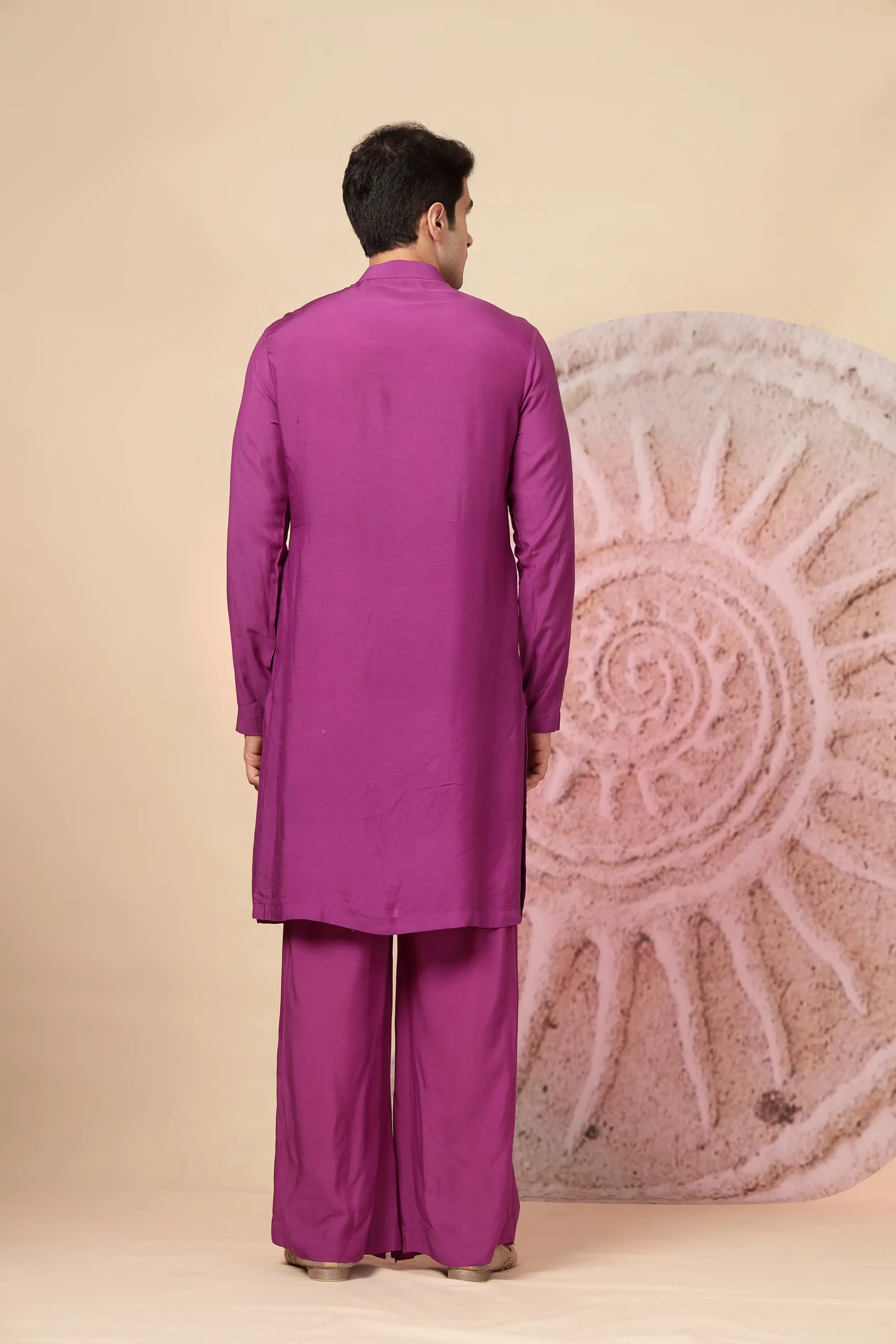 Introducing a refined Purple straight-cut kurta set designed for understated festive elegance. Crafted with a mandarin collar, the kurta is enhanced with tasteful mirror work along the placket and shoulders, offering subtle festive brilliance. Clean lines and a delicate vertical woven texture create a structured yet comfortable silhouette, making this ensemble an ideal choice for celebrations, cultural gatherings, and special occasions.