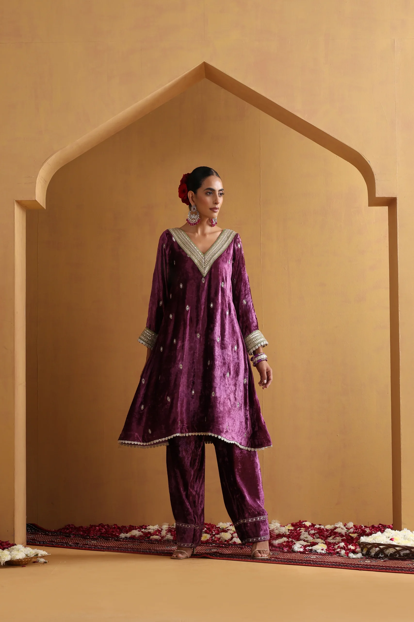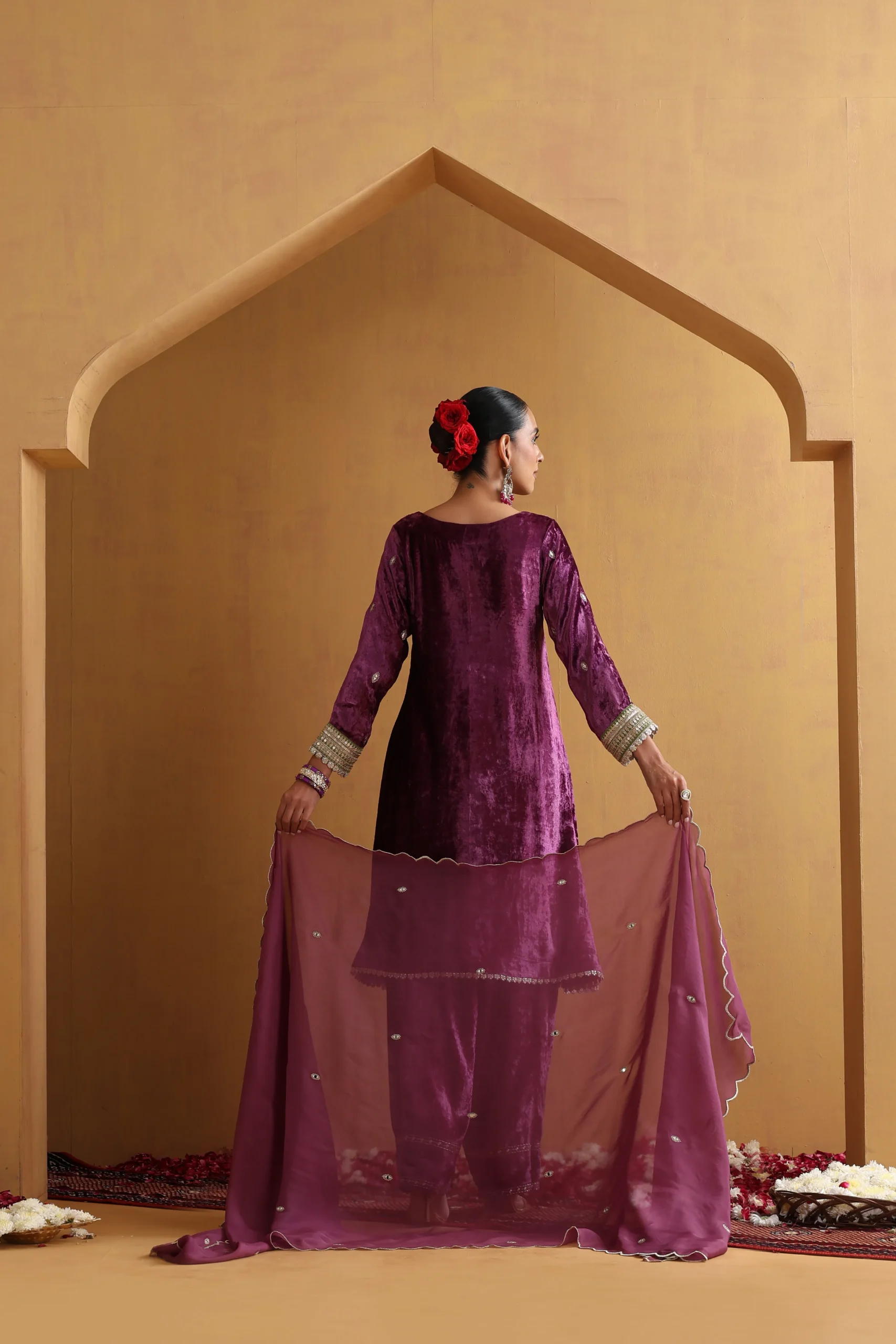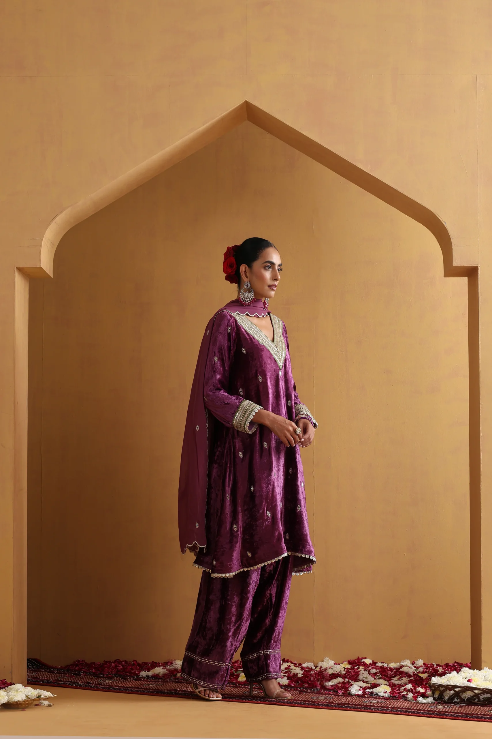 Introducing this luxurious purple velvet kurta set designed for rich festive and evening elegance. Crafted in a deep aubergine plum hue, it features a sophisticated V-neckline framed with heavy metallic embroidery in silver or light-gold zari or gota patti work. The kurta is enhanced with delicate scattered floral buttis across the front, adding subtle texture and charm. Paired with matching bottoms and a complementing dupatta, this ensemble is perfect for weddings, festive gatherings, and special celebrations.