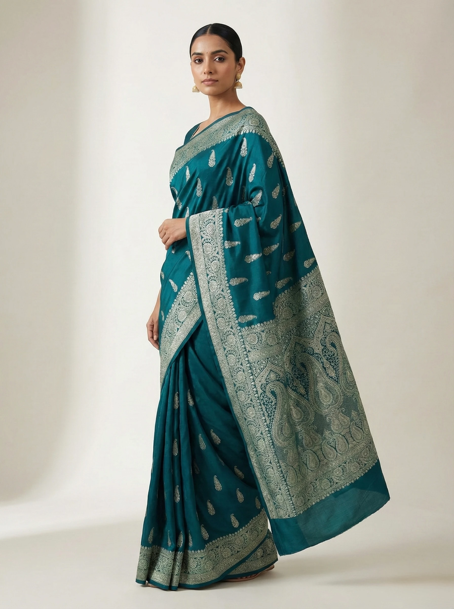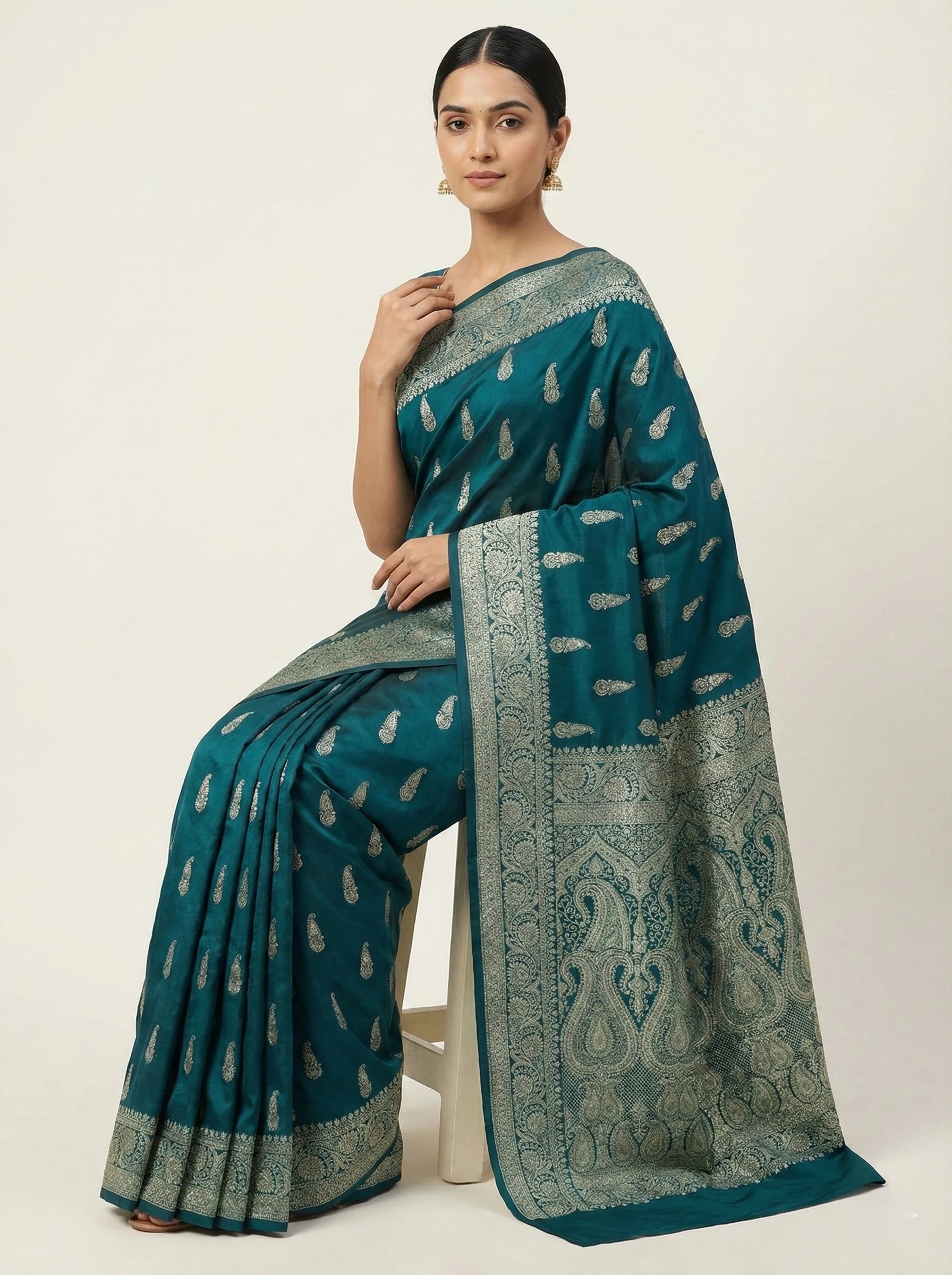 Pair with antique gold jhumkas or a kundan choker to highlight the Zari. Complete the look with a metallic gold potli bag or a silk embroidered clutch.