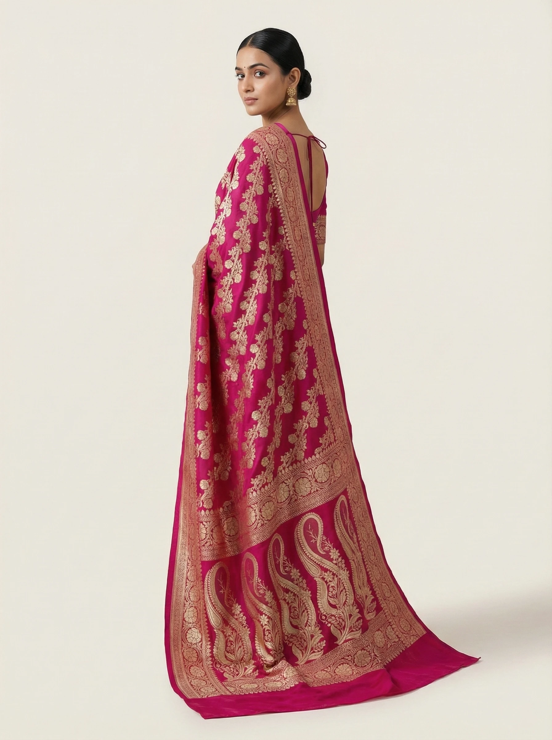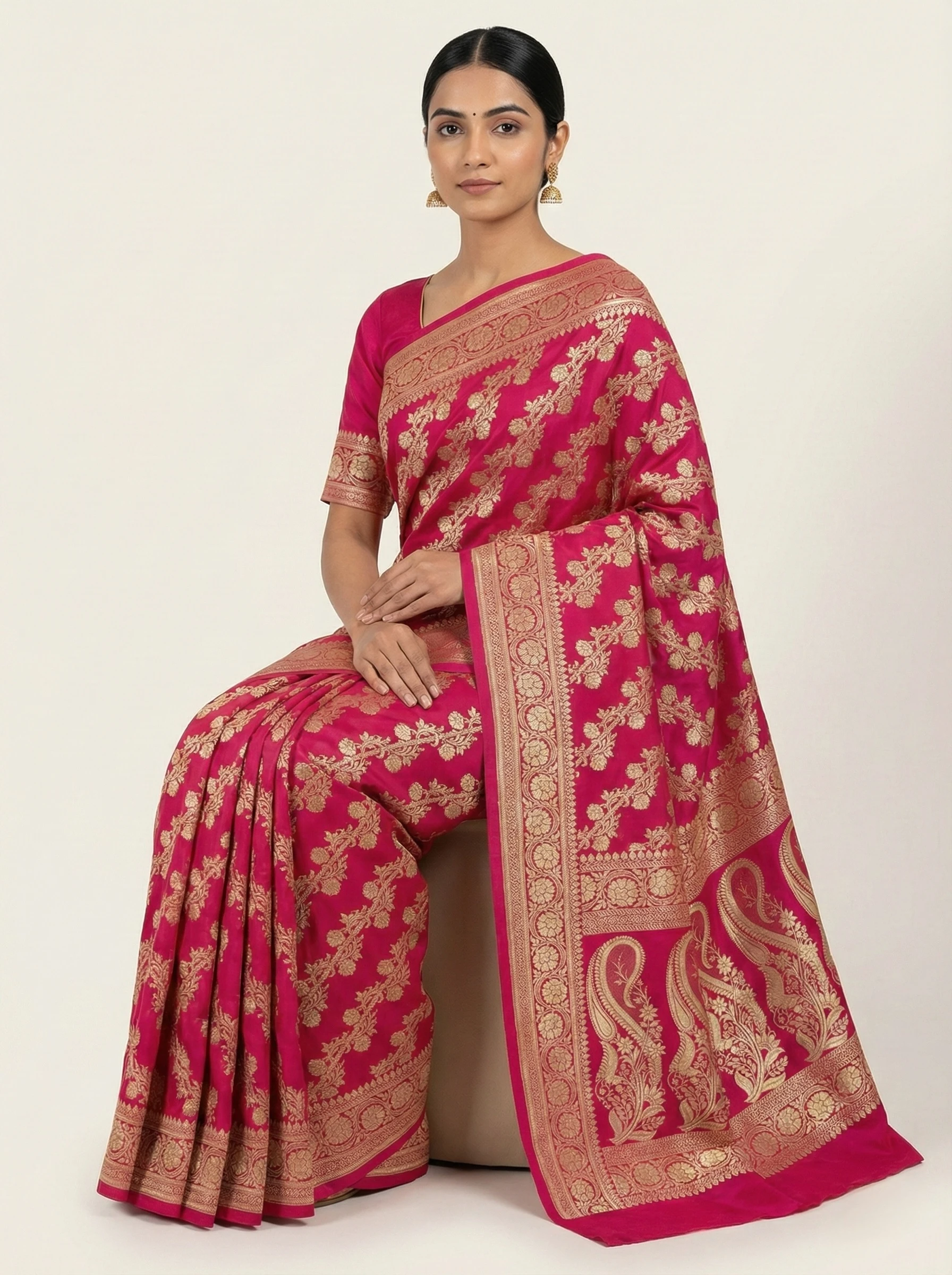 Pair with heavy gold jhumkas or a temple jewellery choker. Complete the look with a metallic gold potli bag or an embellished clutch for a regal festive finish.