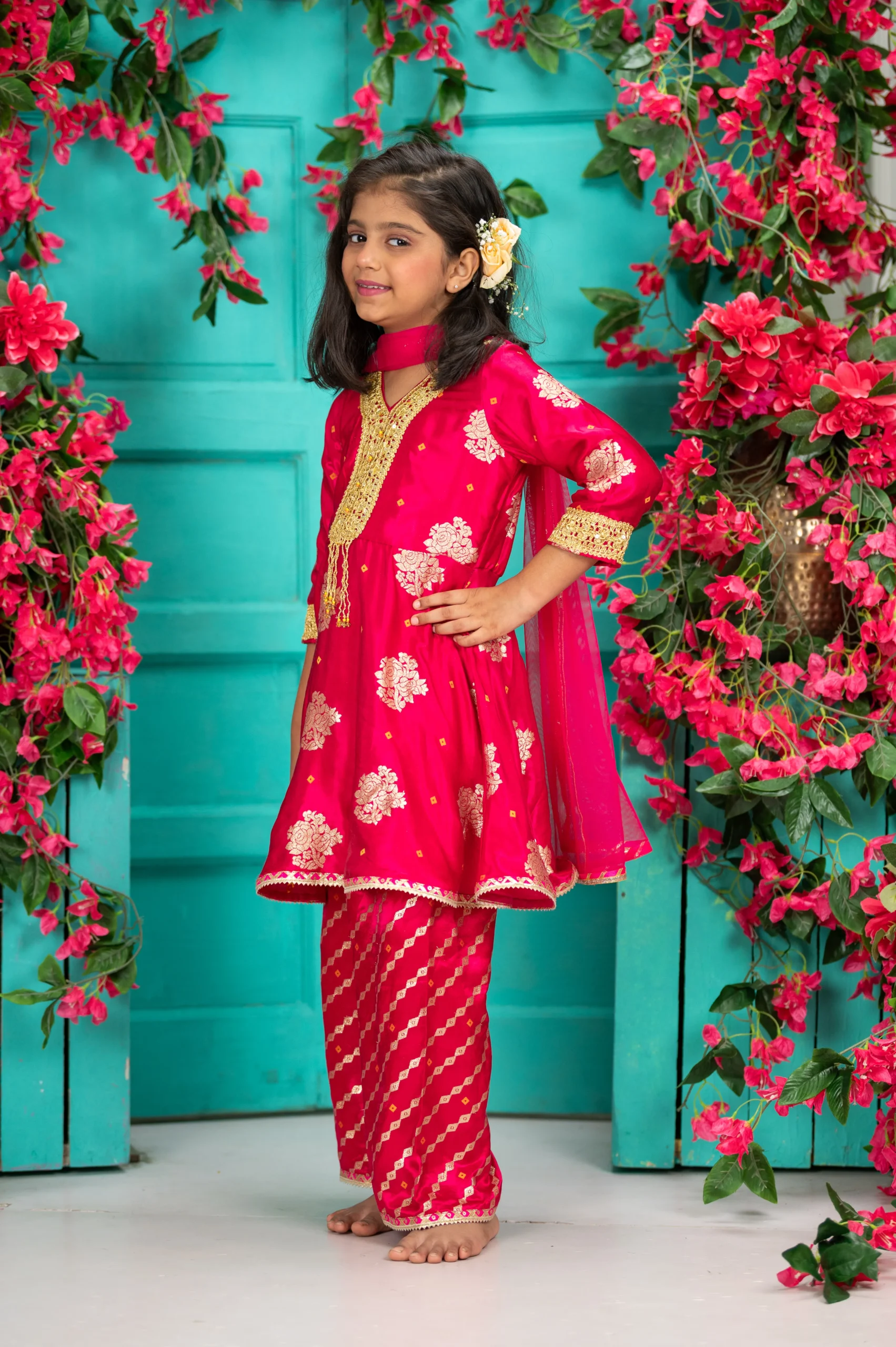 Style this vibrant Rani brocade peplum set with traditional juttis or embroidered mojaris and delicate gold jewelry to complement the gota borders and crochet lace neckline. Pair it with soft curls or a half-up hairstyle with a floral hair accessory for a festive look. Perfect for weddings, festive celebrations, and special occasions.