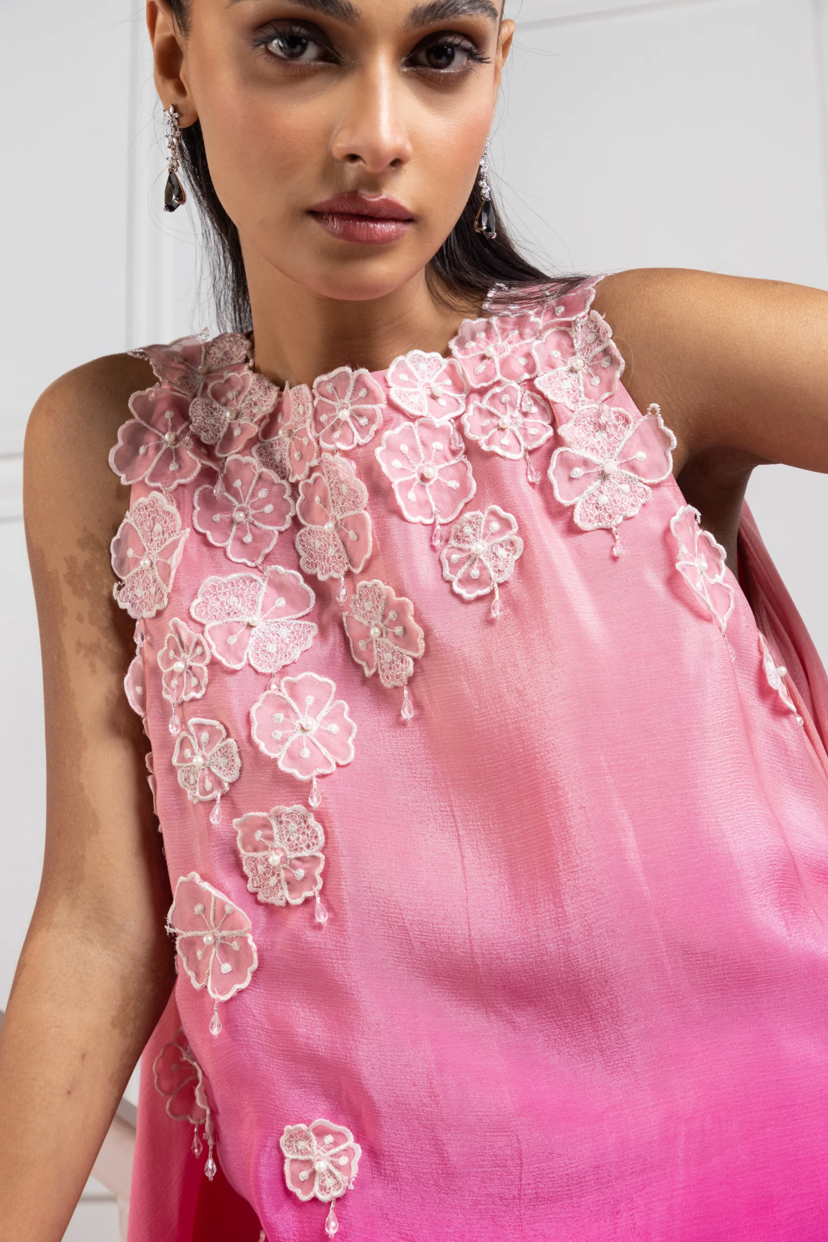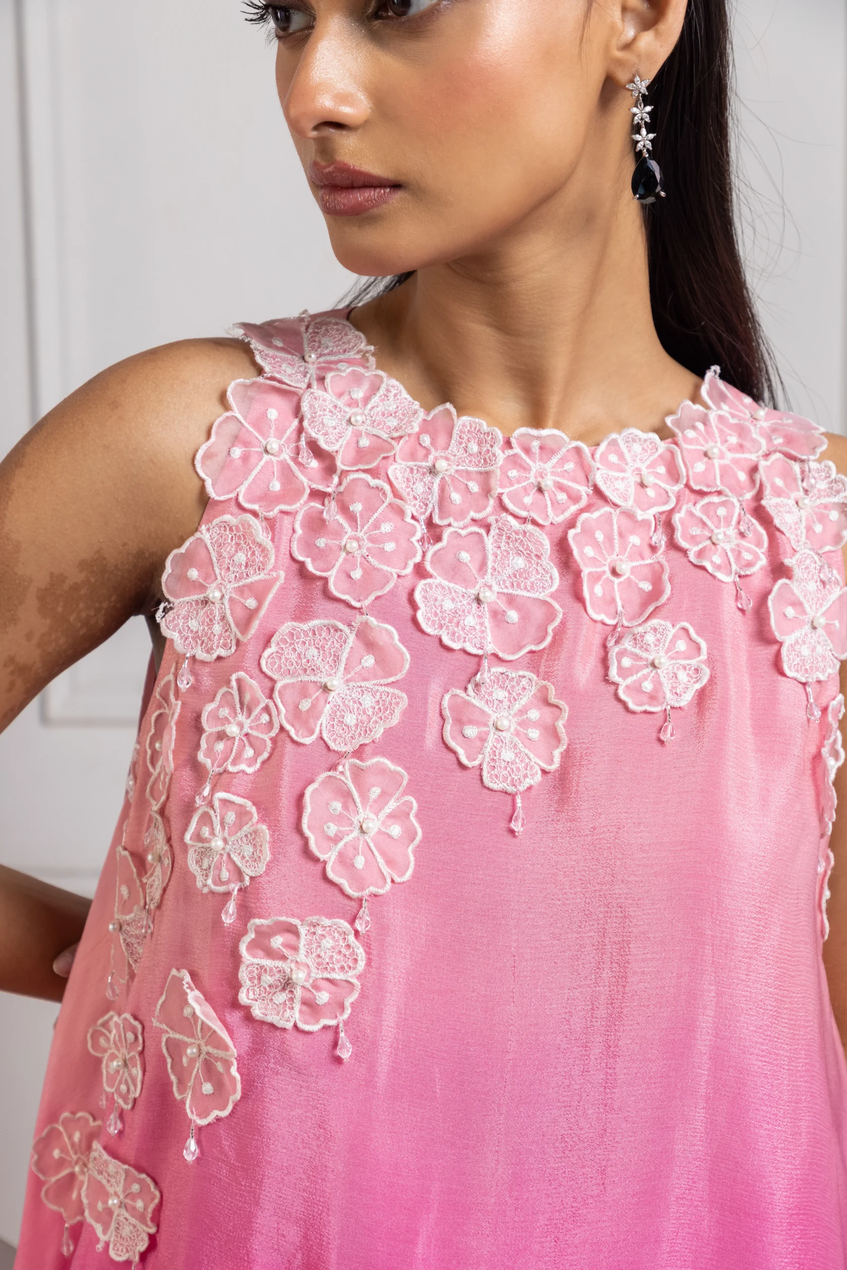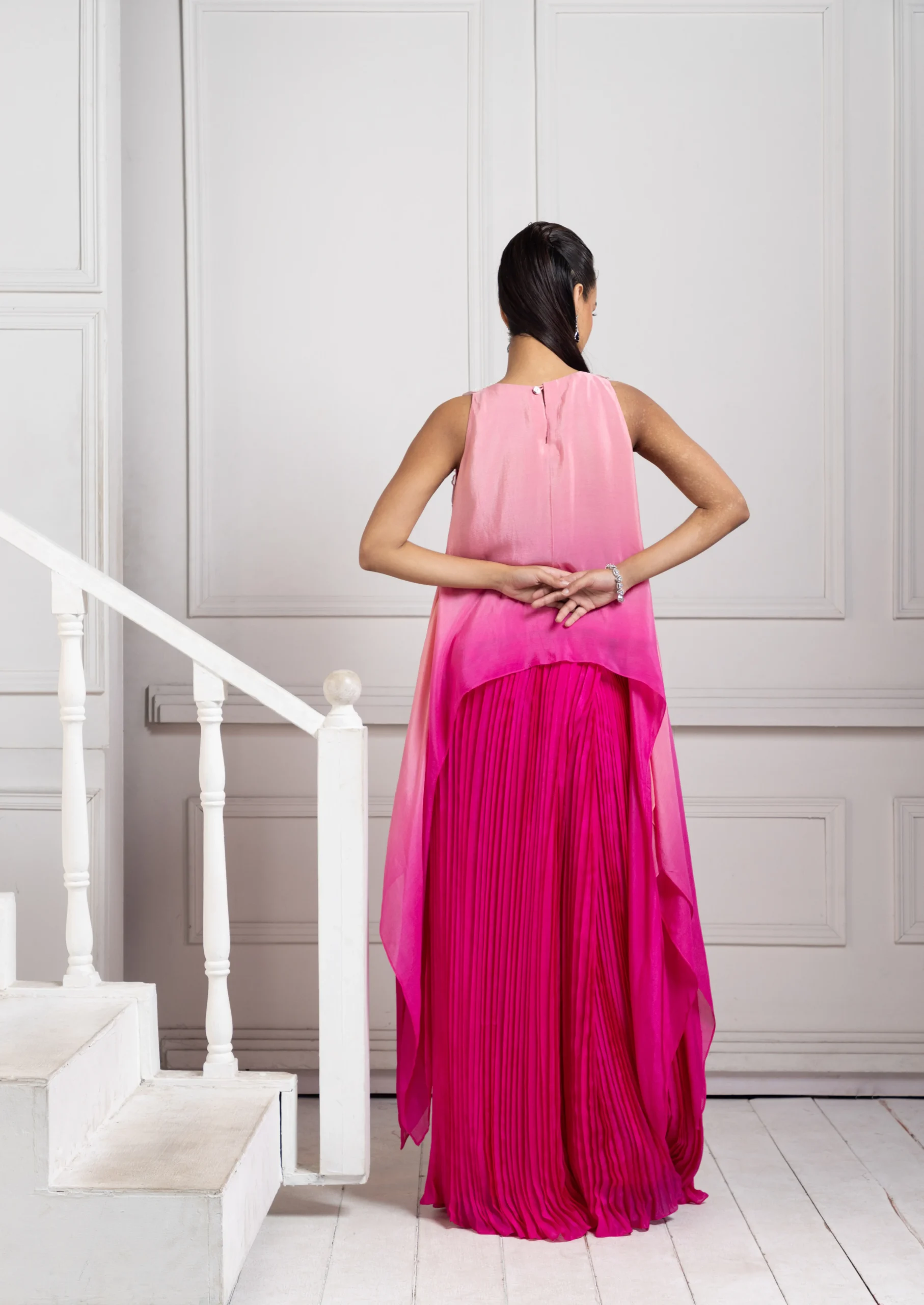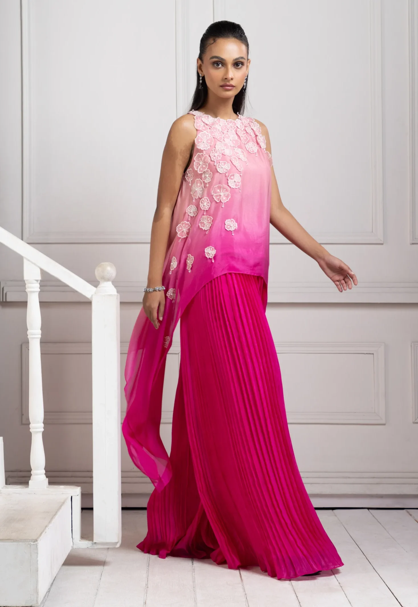 Style this rani pink asymmetric set with soft waves or a sleek ponytail to accentuate the floral bodice. Pair it with delicate statement earrings, strappy heels, and a chic clutch.