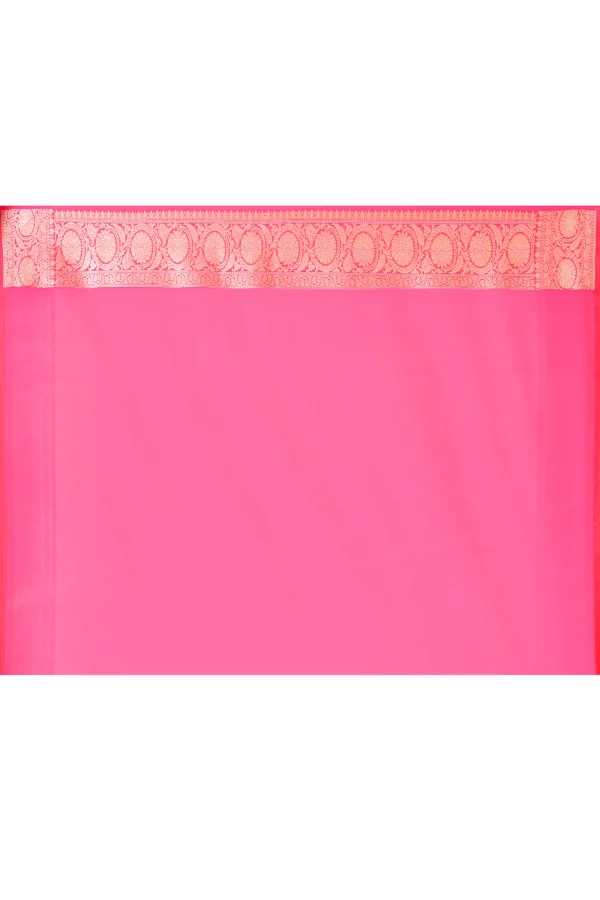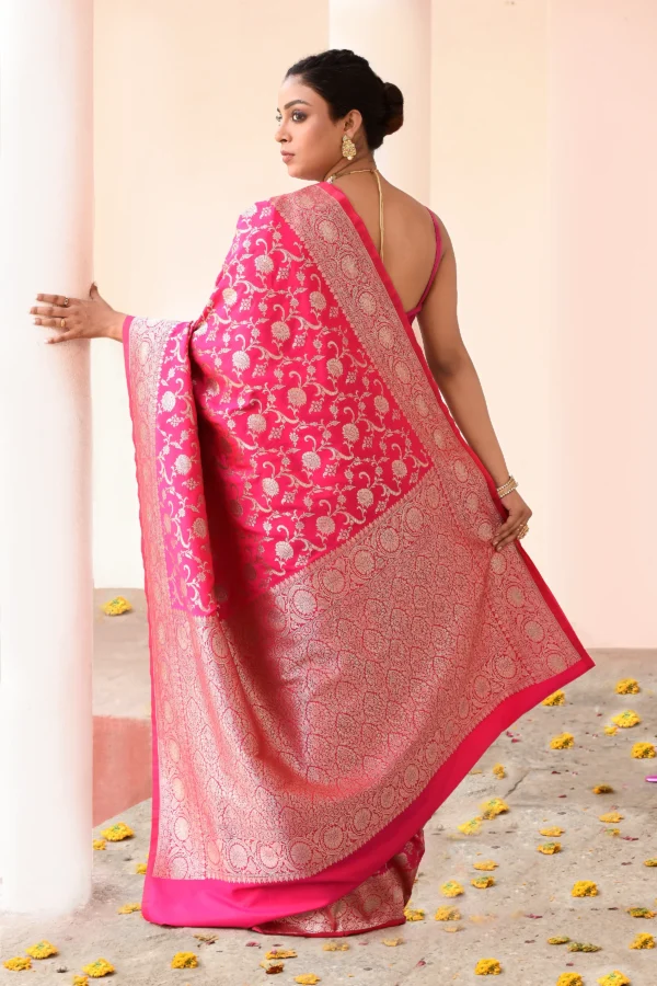 Introducing a Rani Pink Soft Silk saree that celebrates vibrant elegance and heritage craftsmanship. The rich base is adorned with intricate floral jaal motifs, complemented by a broad antique gold border and an ornately woven palla in classic Banarasi patterns, highlighted with antique gold zari. Comes with a matching running blouse piece.