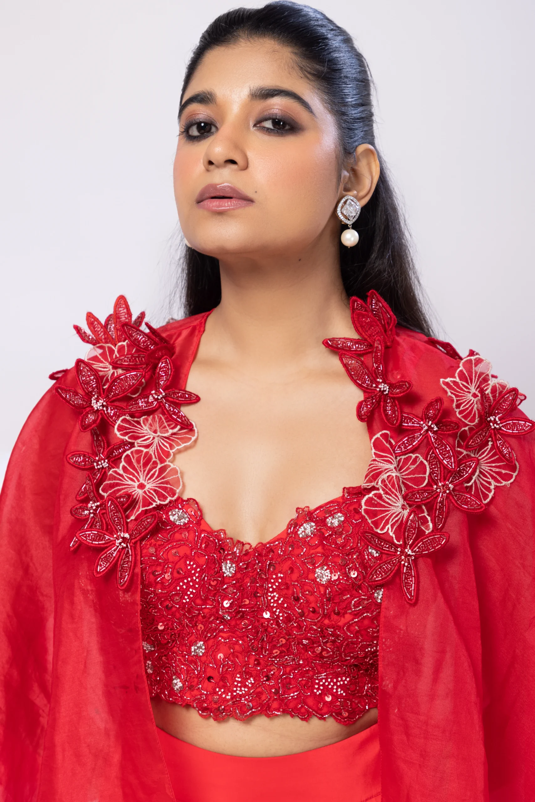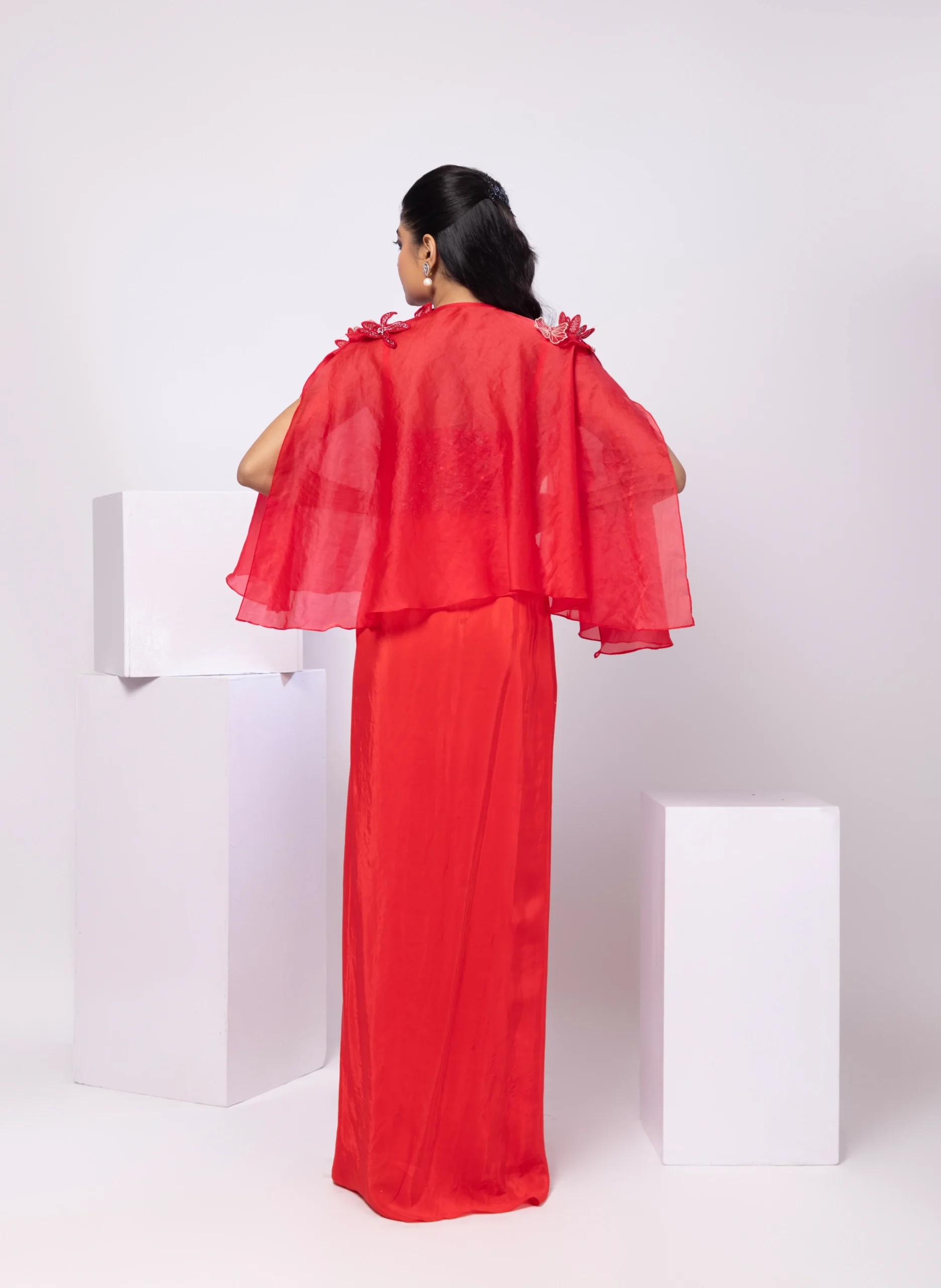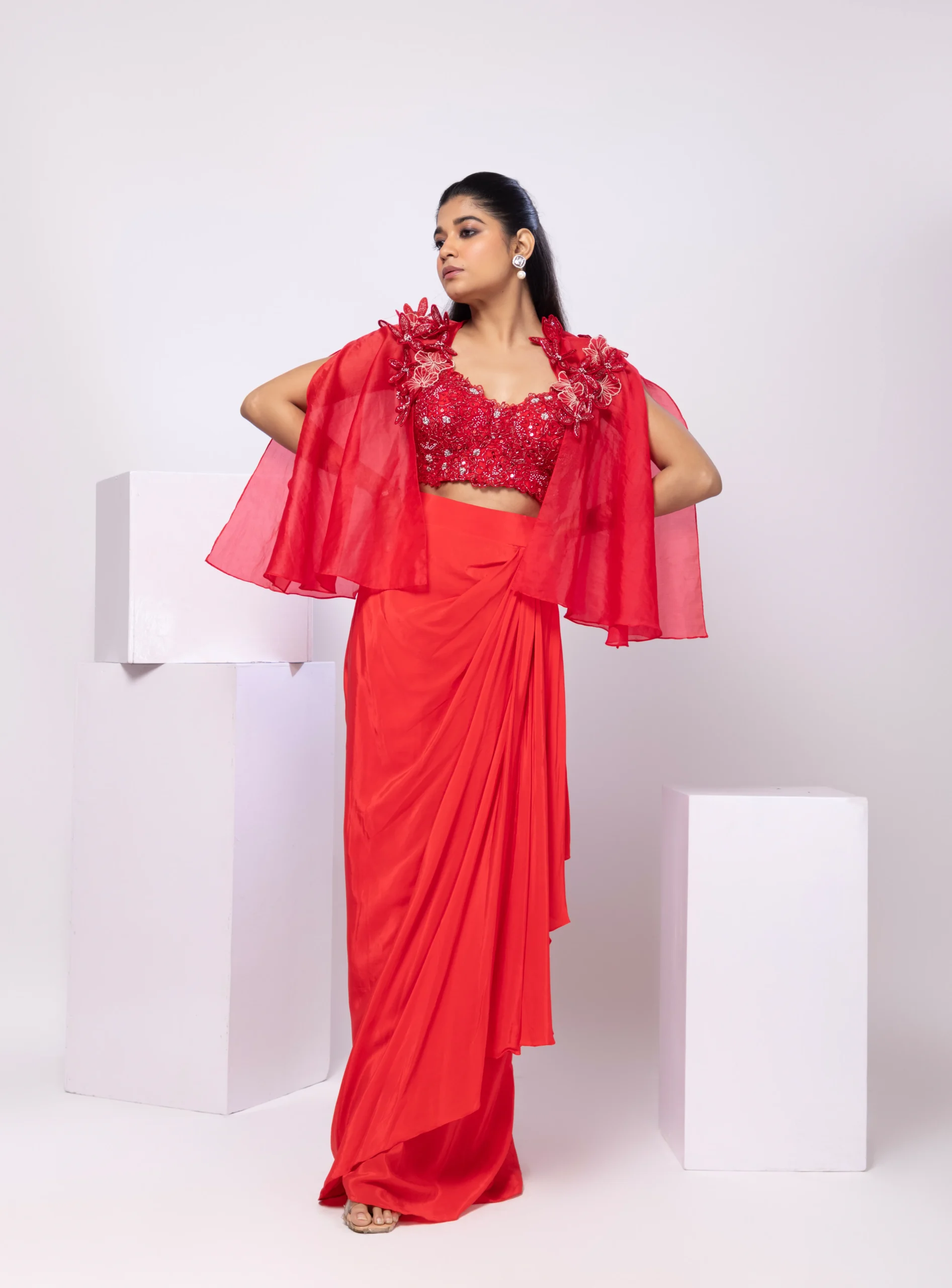 Style this look with statement chandelier earrings, sleek stilettos, and a metallic clutch for an elevated appeal. Opt for a sleek bun or soft waves with defined eyes and a classic red or nude lip. Keep accessories refined to highlight the appliqué detailing and the dramatic draped silhouette.