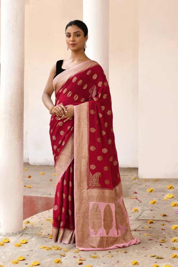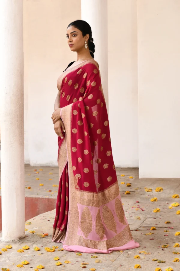 Red Banarasi Crepe Chiffon Silk Saree with Gold Zari Butas & Pink Palla