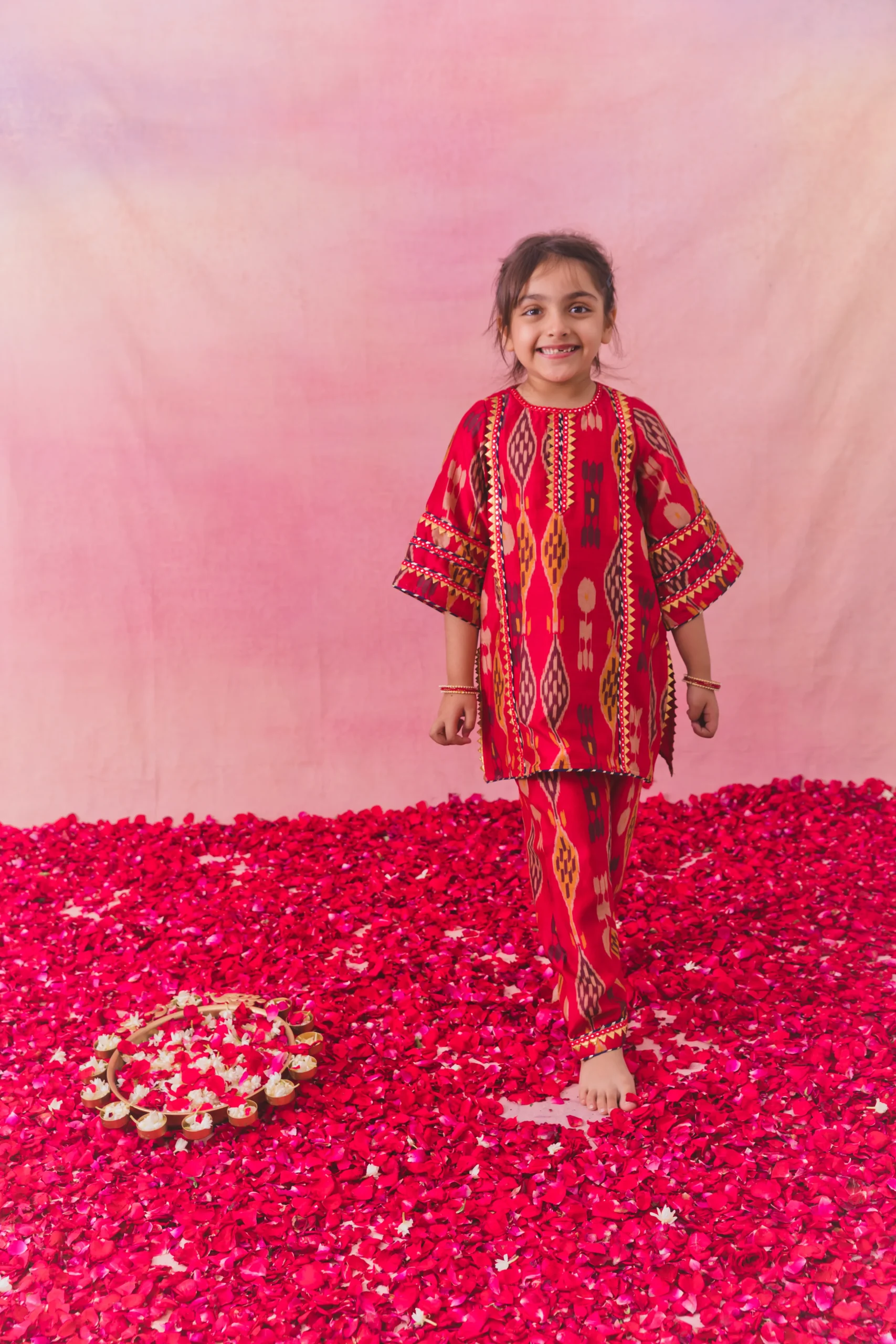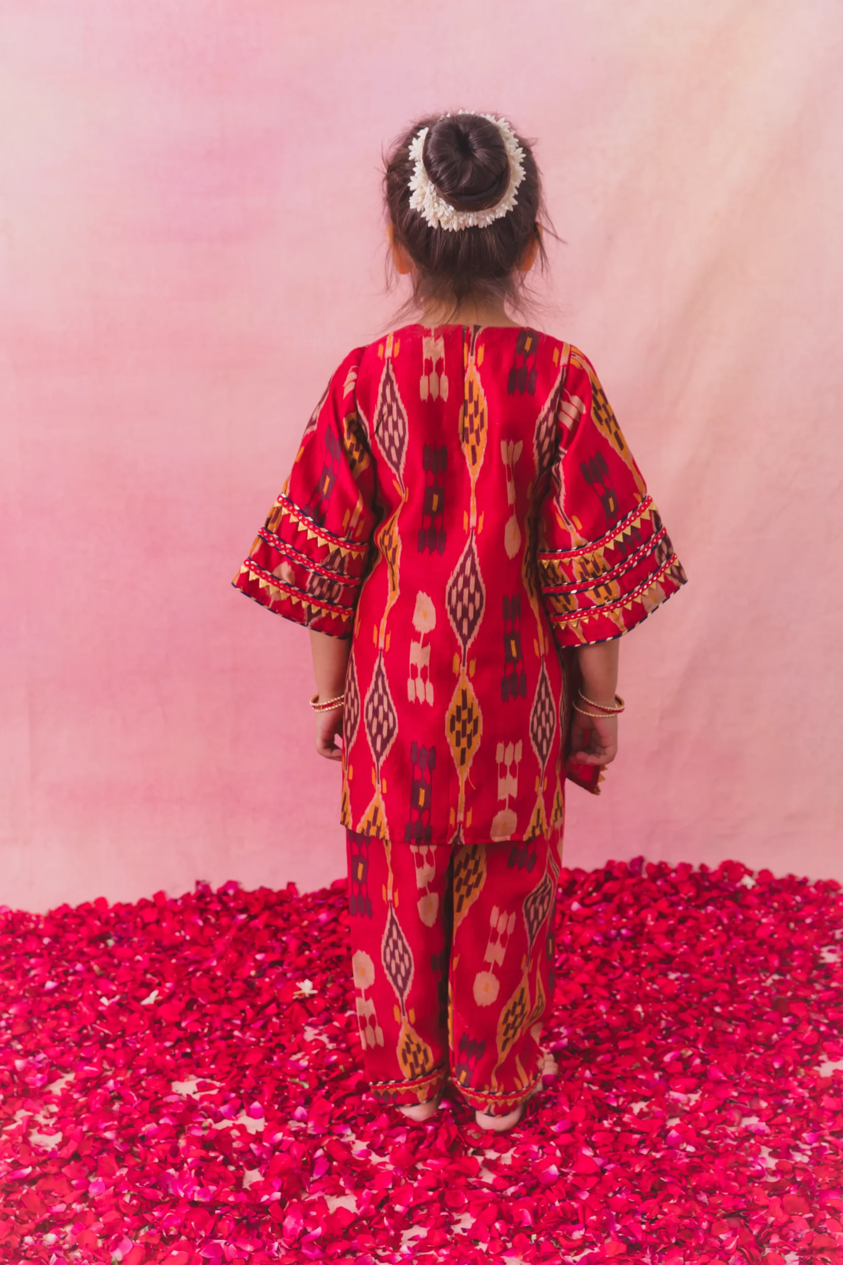 Red Chanderi Mirror Work Choga Set with Ikat Salwar for Girls