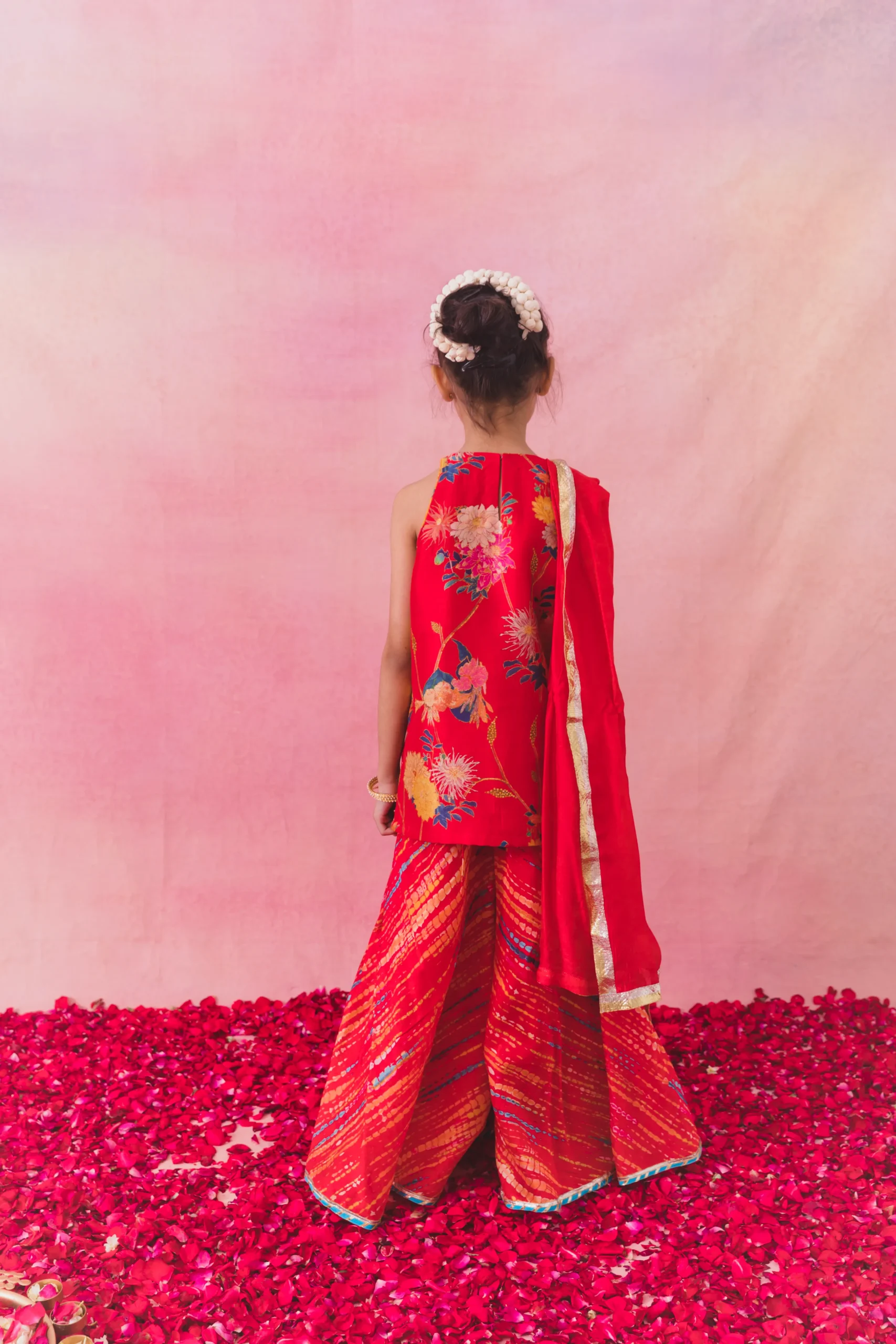 Introducing our Red Chanderi Sharara Set, a radiant ensemble crafted for festive elegance. The lightweight chanderi kurta is adorned with gota and metallic coin detailing, complemented by delicate coin work at the hem. Paired with a matching sharara and a dupatta enhanced with gota accents, this set is finished with soft mulmul lining for a comfortable and graceful fit.