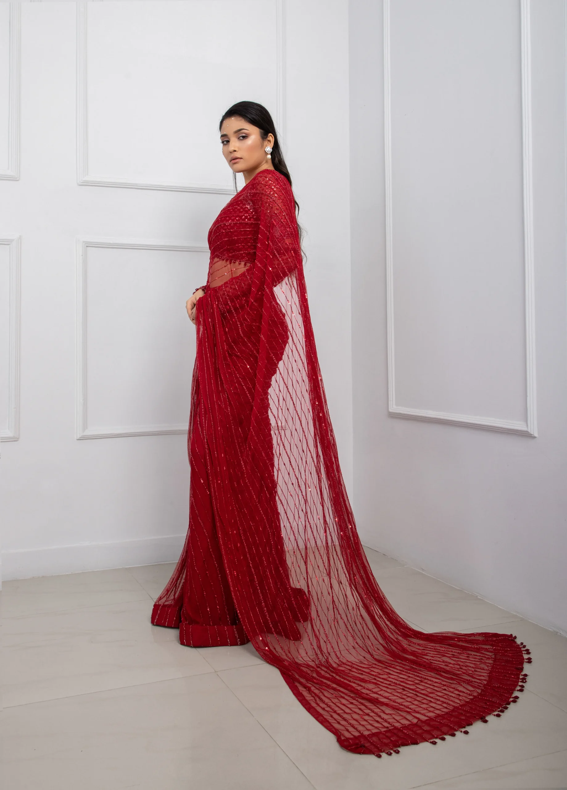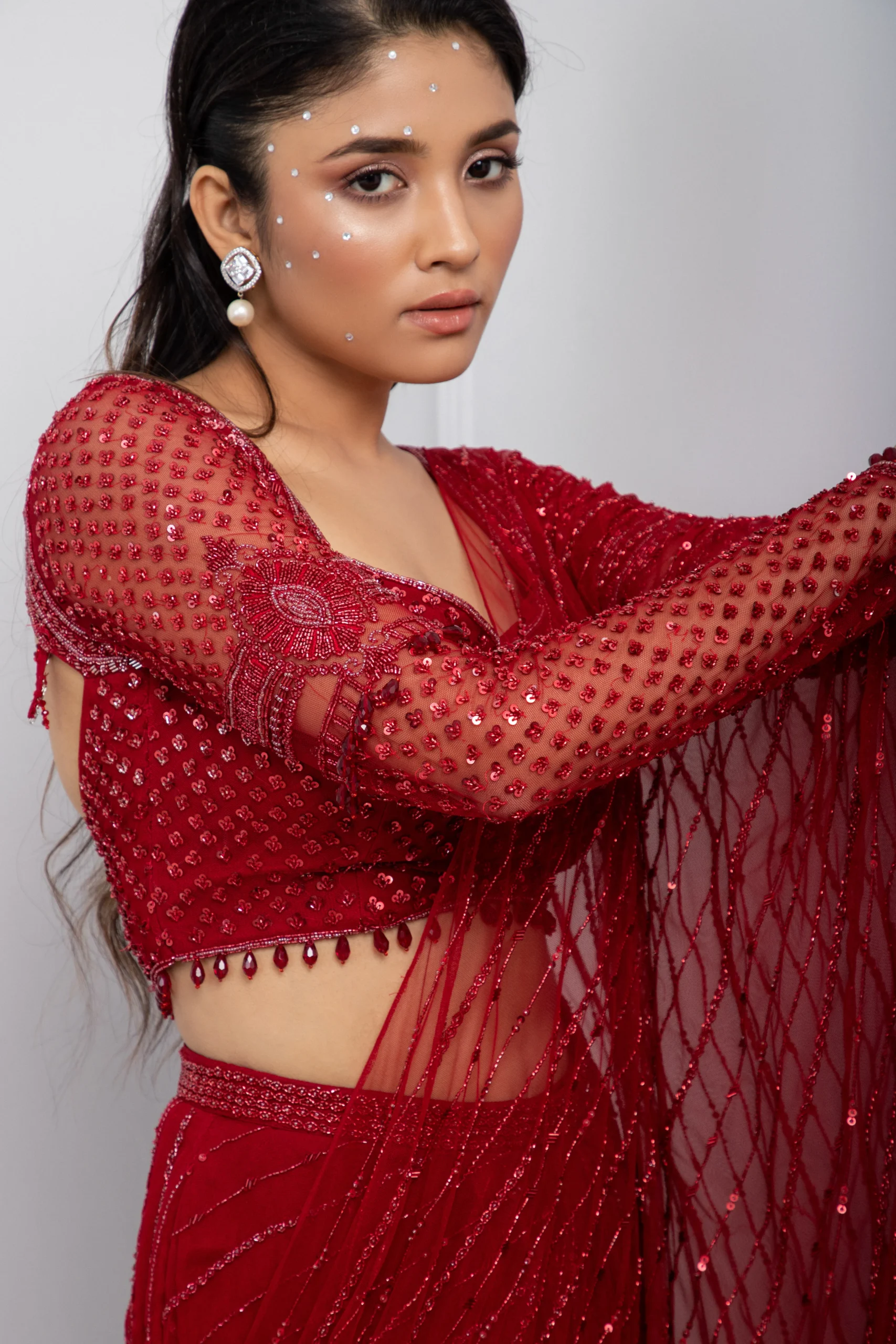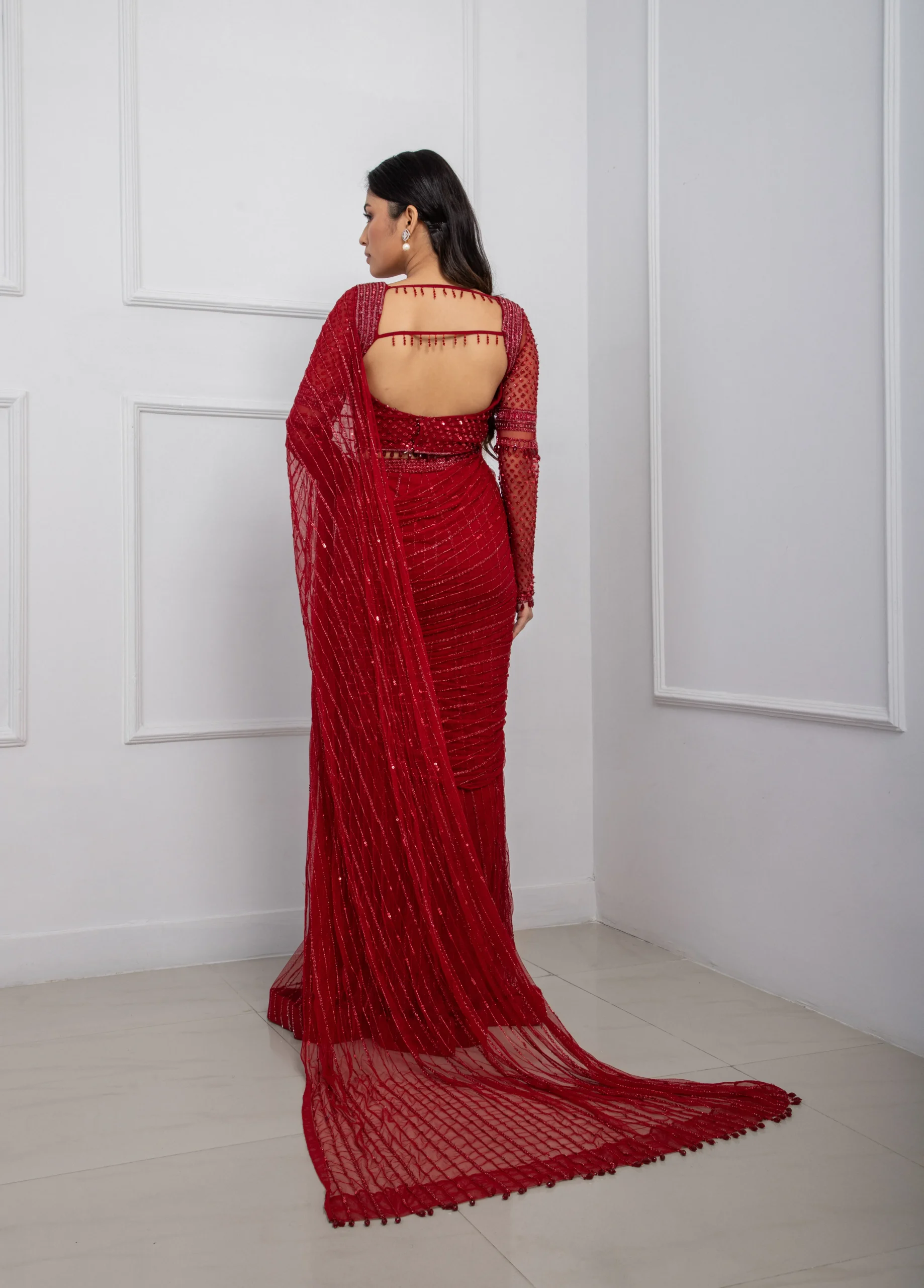 Introducing a red crepe, net embellished draped saree set. This elegant ensemble features a fluid drape saree paired with a full-sleeve blouse intricately embellished for a refined, statement look. Finished with delicate beaded tassels in a matching ruby hue, the blouse adds graceful movement and detail. Striking yet timeless, this saree set beautifully complements all skin tones and is perfect for evening celebrations, festive occasions, and glamorous events.
