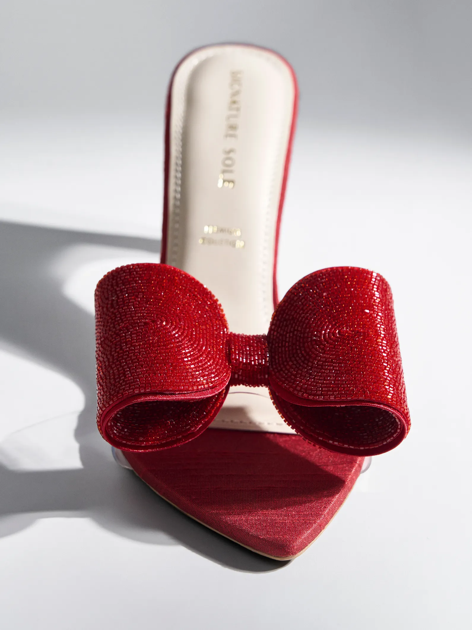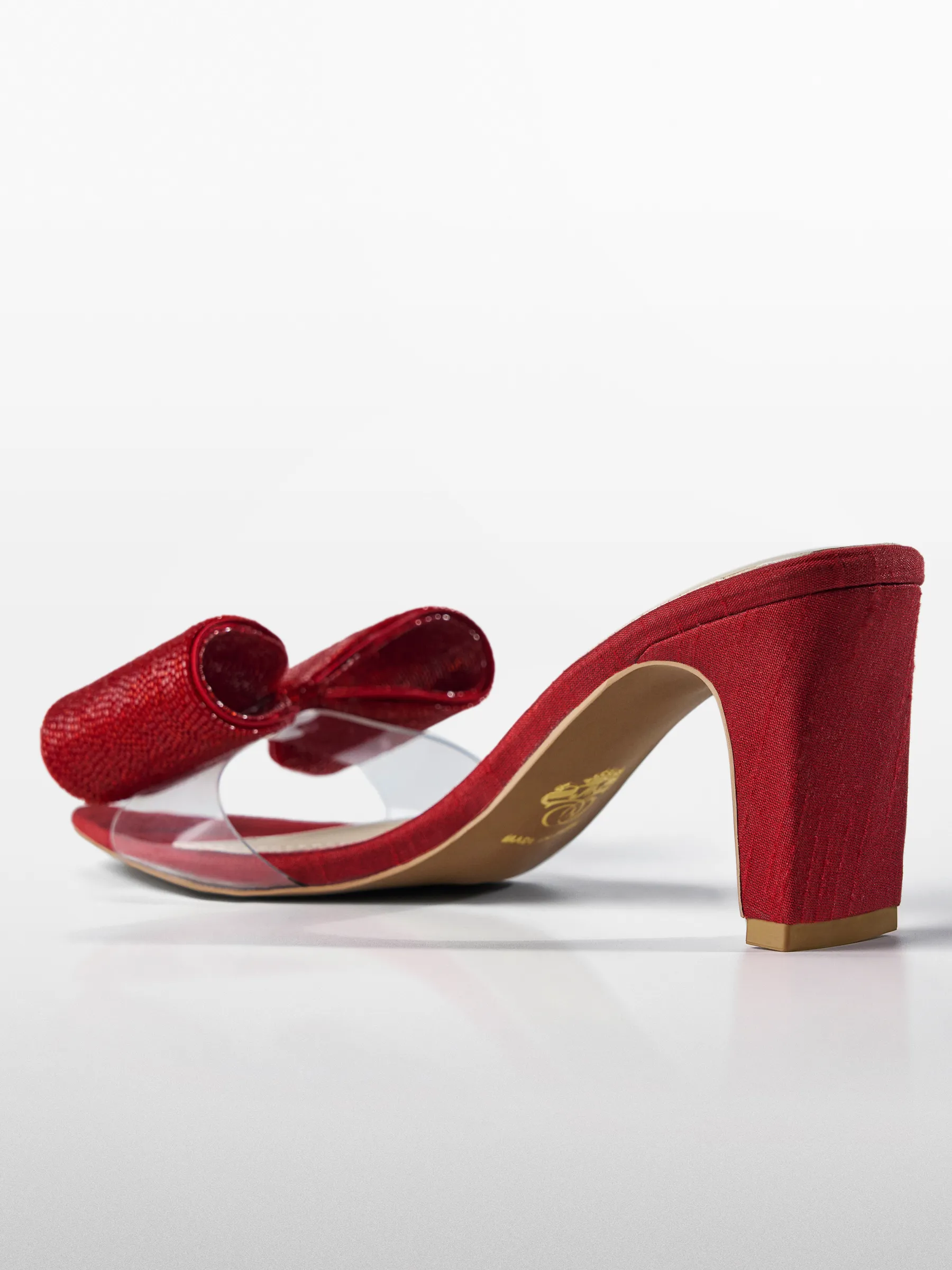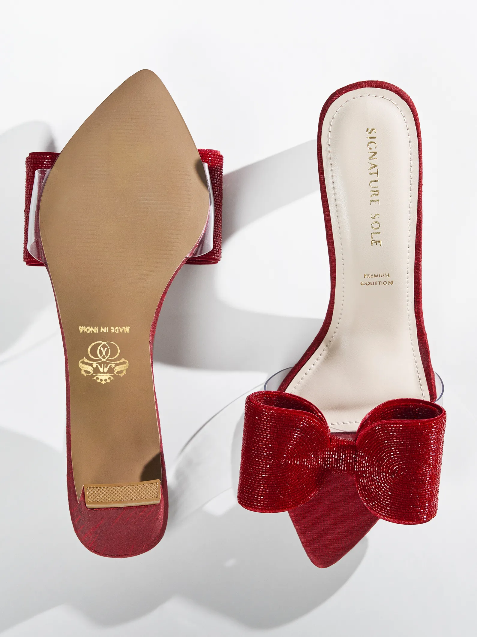 Featuring oversized 3D bow fully encrusted with micro-rhinestones with satin body and toe in fabric on faux leather, this Red Crystal Bow Satin Kitten Heel is a showstopper.