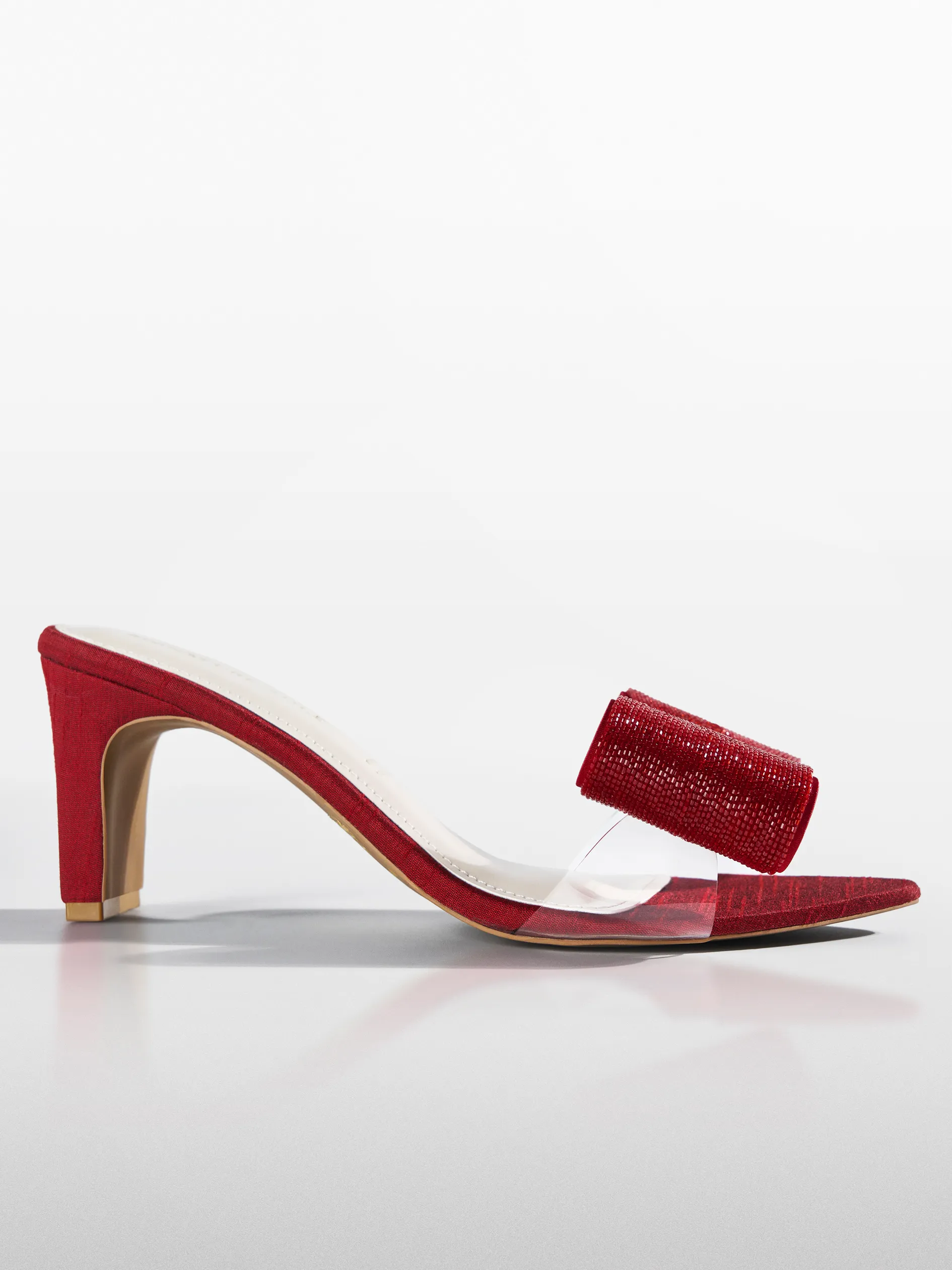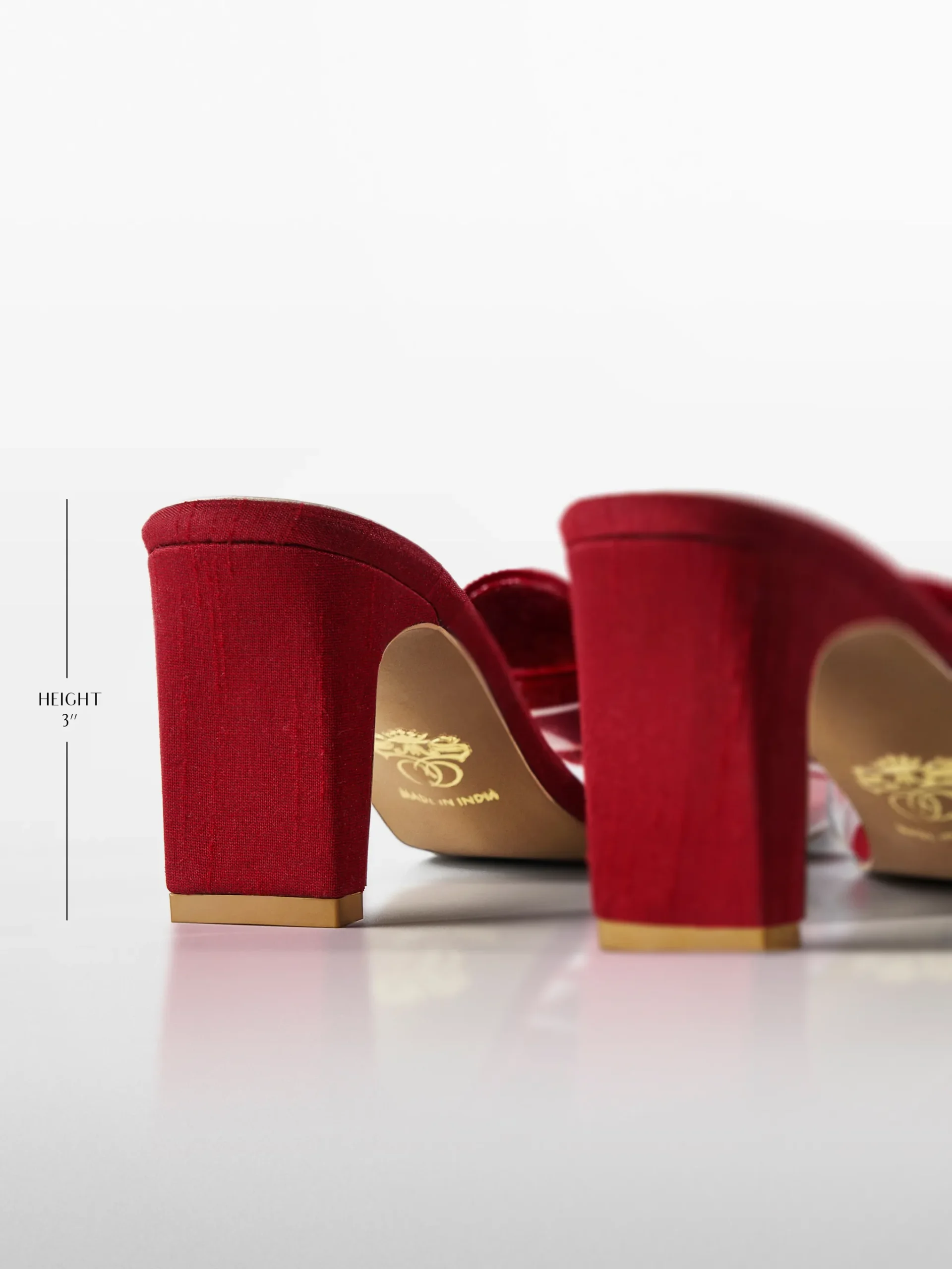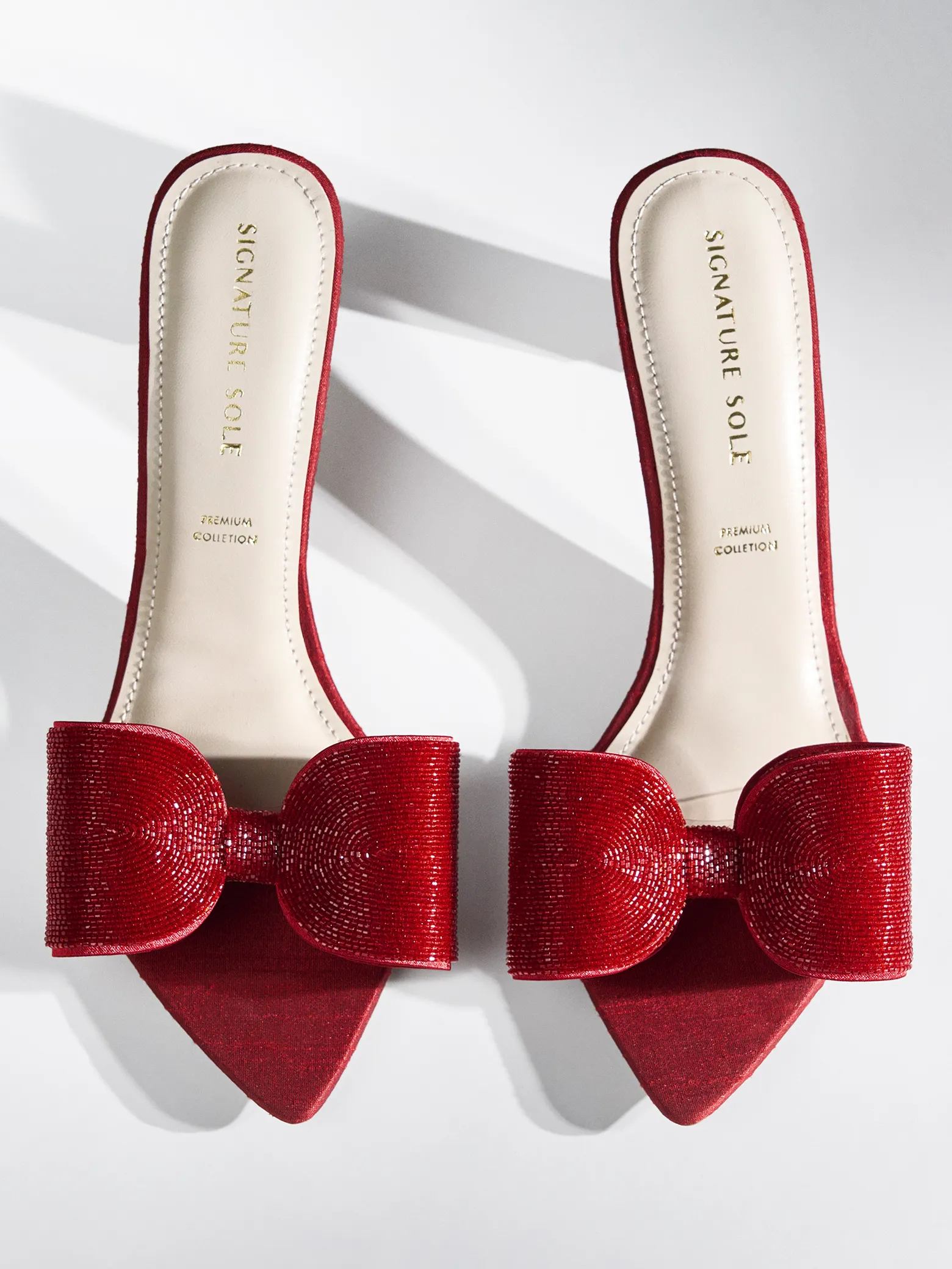 Featuring oversized 3D bow fully encrusted with micro-rhinestones with satin body and toe in fabric on faux leather, this Red Crystal Bow Satin Kitten Heel is a showstopper.