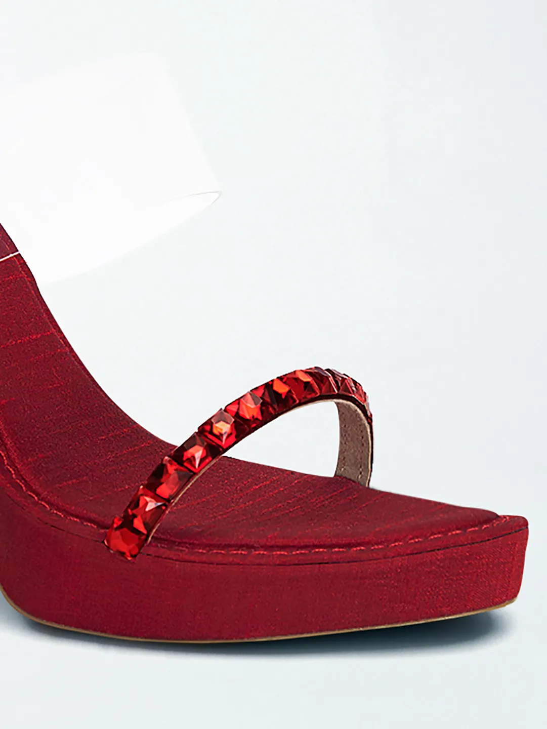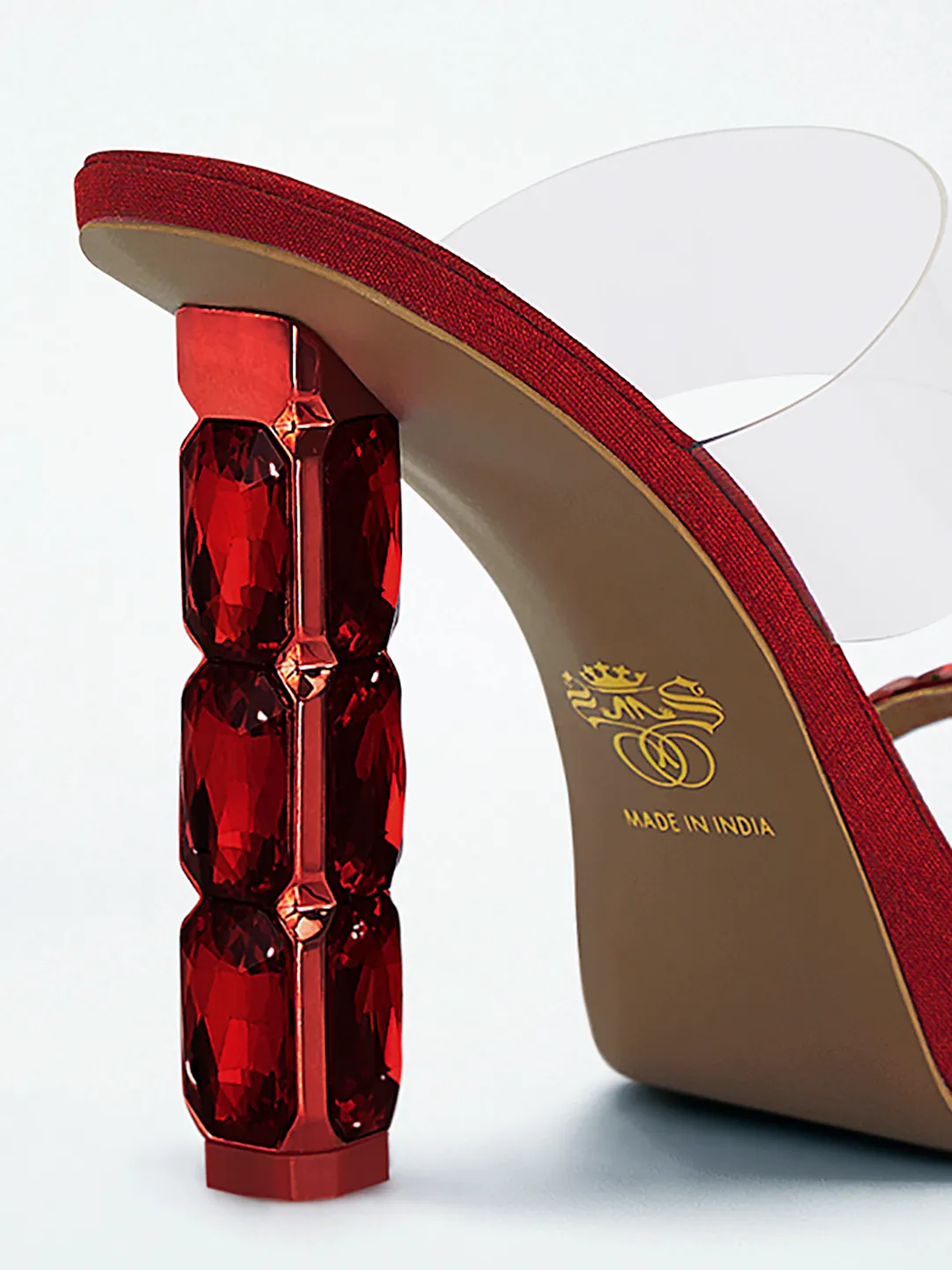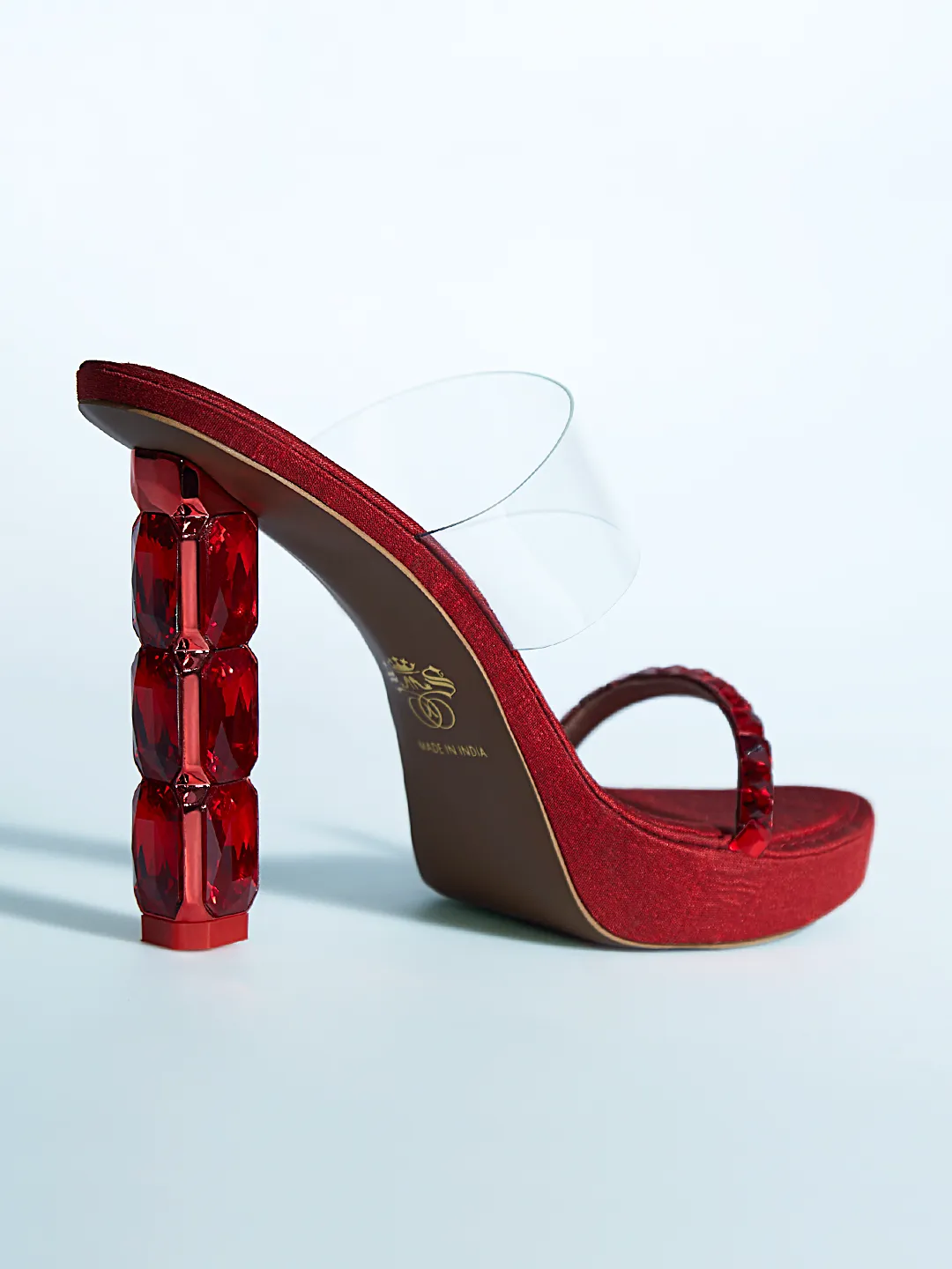 Craft : Faceted crystal-stacked sculptural heel | Clear transparent upper strap | Crystal-studded lower strapMaterial : Faux leatherWork of : Hours