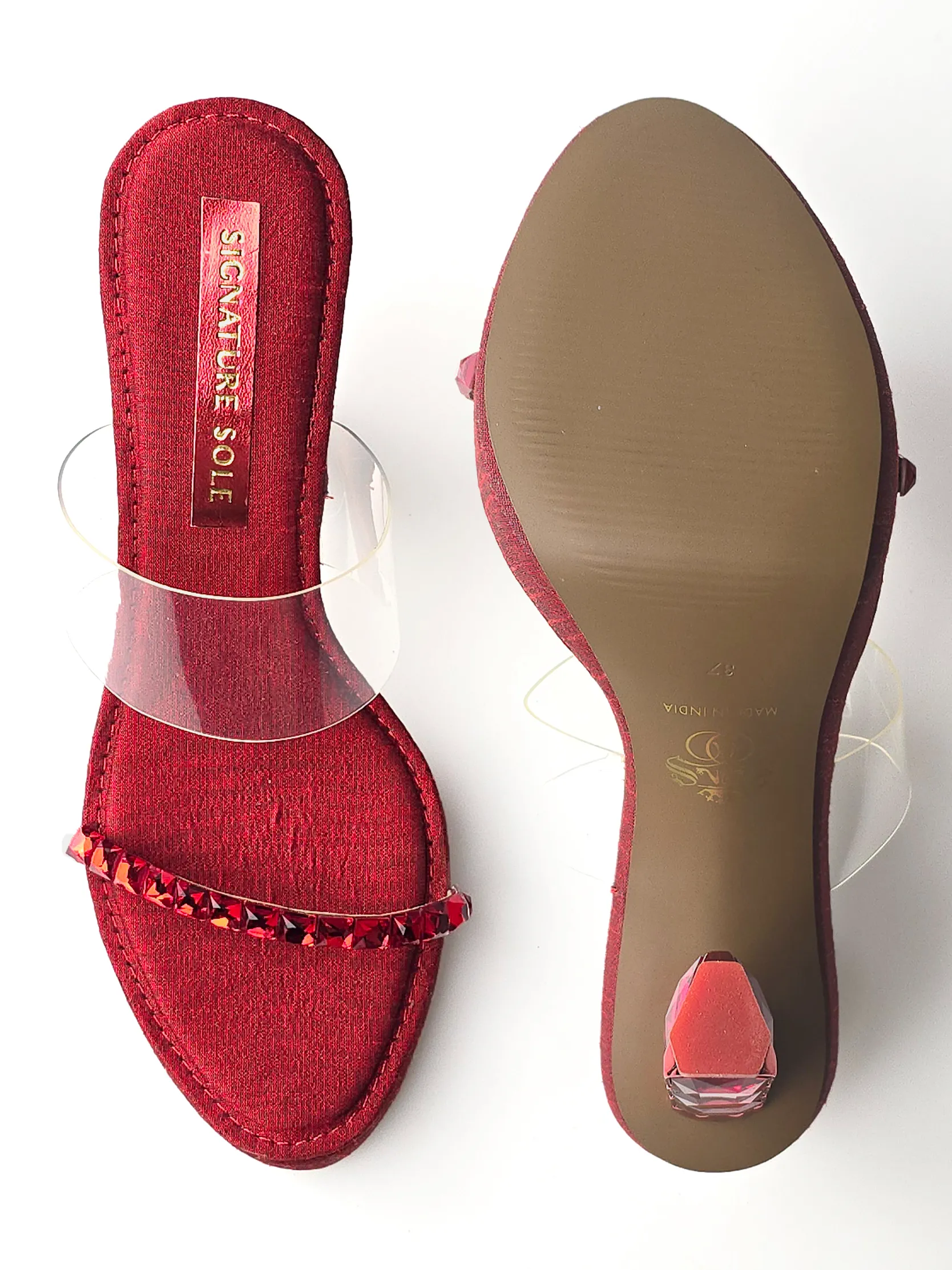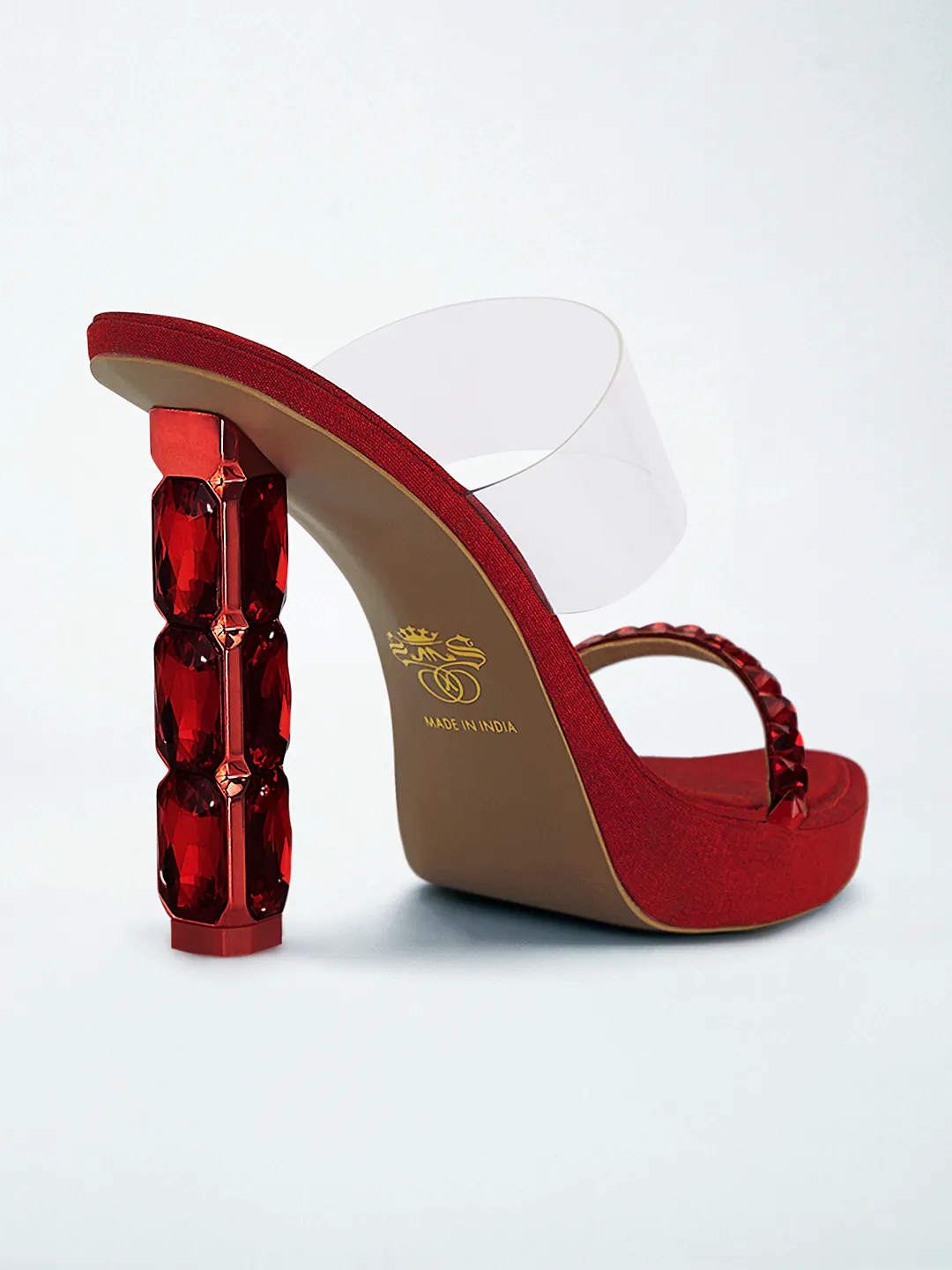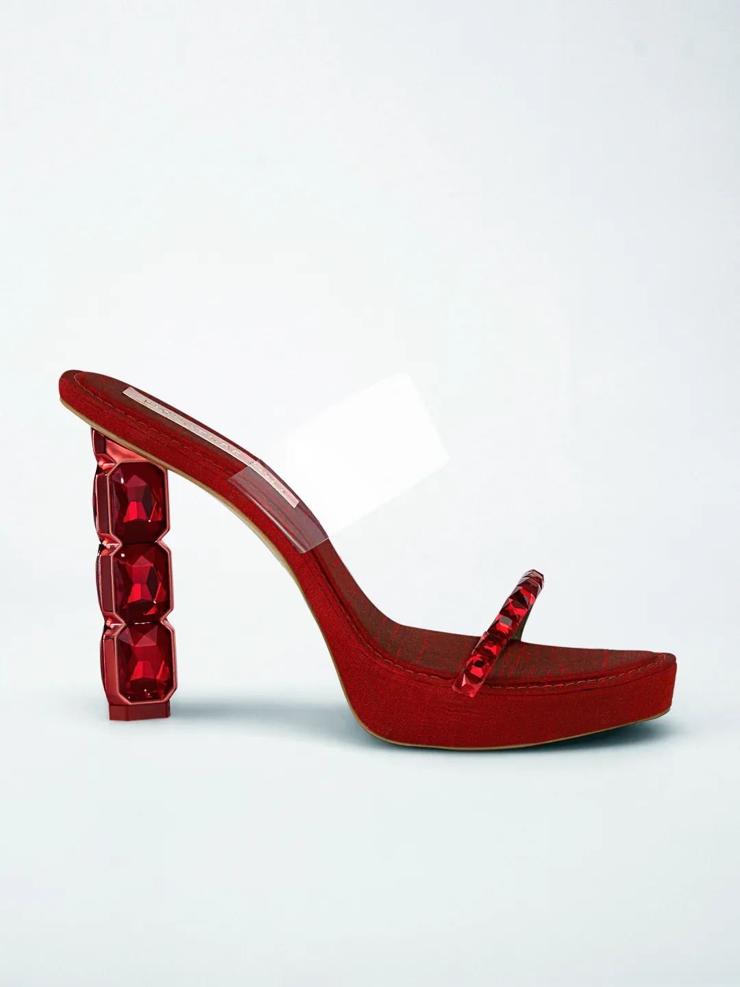 Showcasing faceted crystal-stacked sculptural heel, clear transparent upper strap and crystal-studded lower strap in faux leather, this Red Crystal Jewel Heel Wedge Mule is dramatically luxurious.