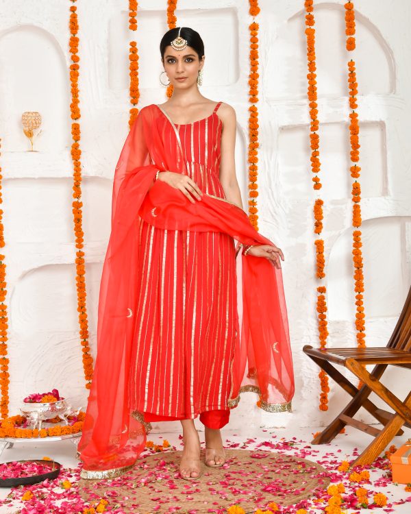 Introducing a red georgette lurex embroidered straight kurta set. Crafted in red lurex fabric, the kurta features a scoop neckline with noodle straps, paired with solid red pants and a matching dupatta adorned with hand embroidery and lace detailing at the hem.