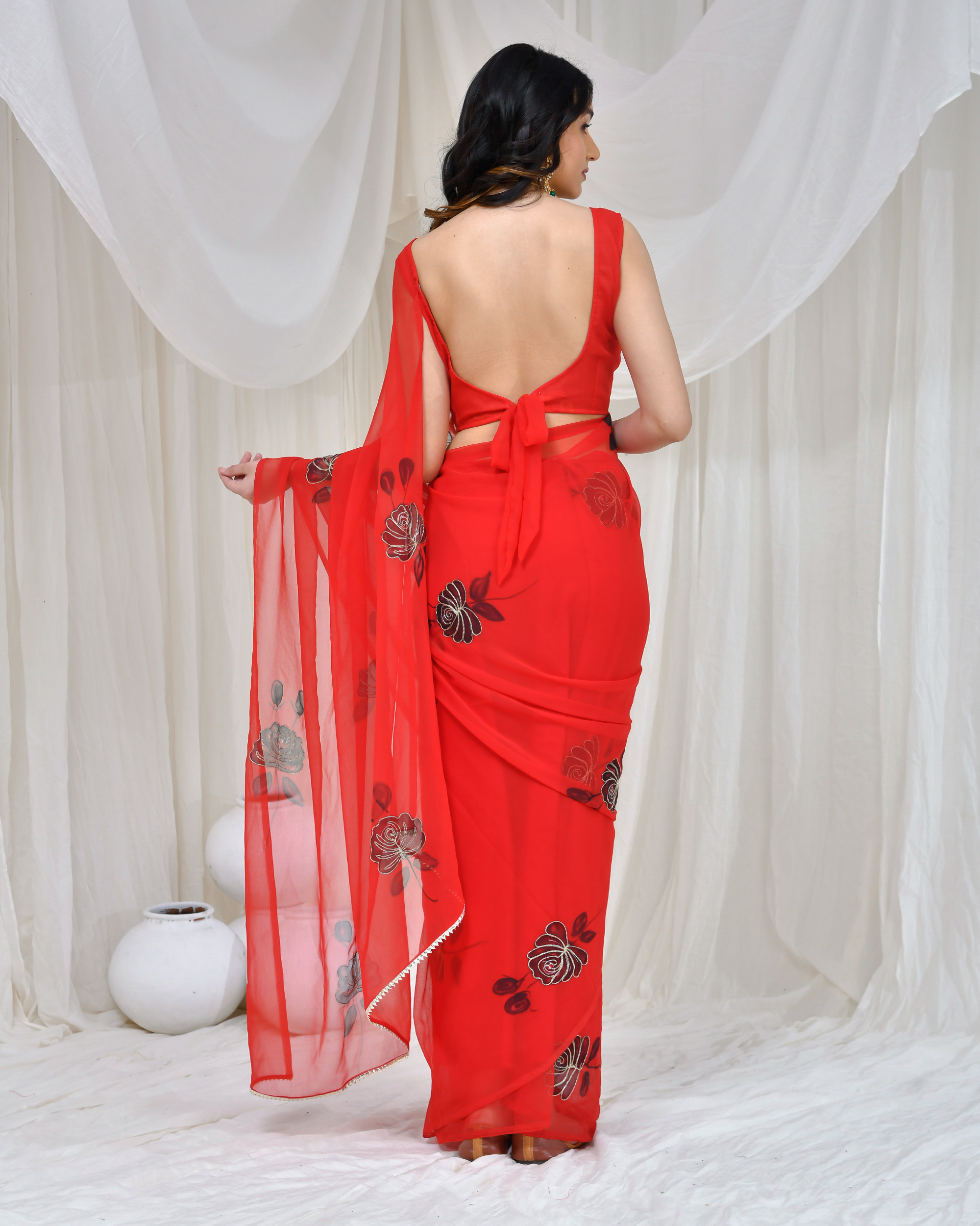 Red Hand-Painted Georgette Saree with Aari Embroidery