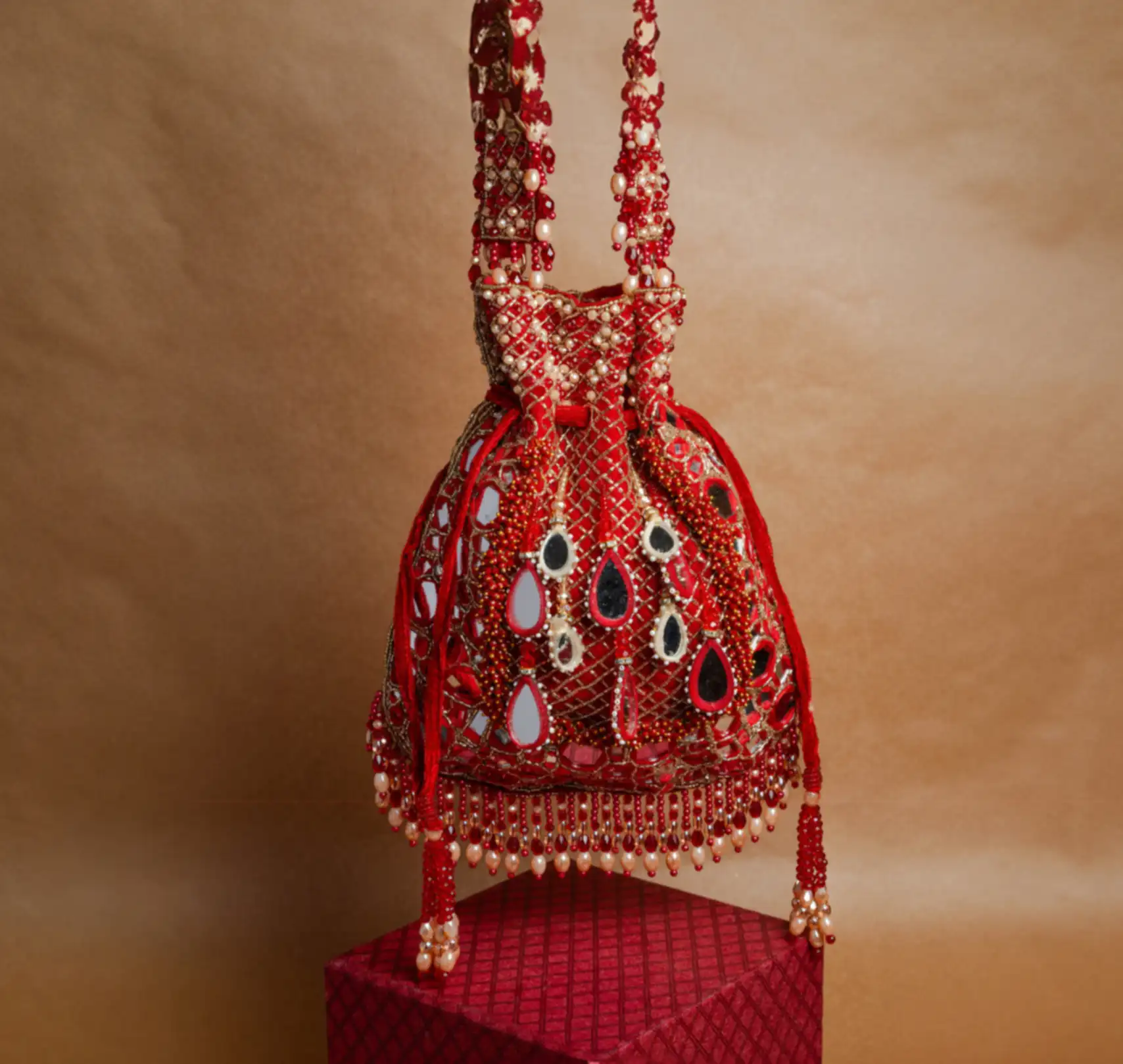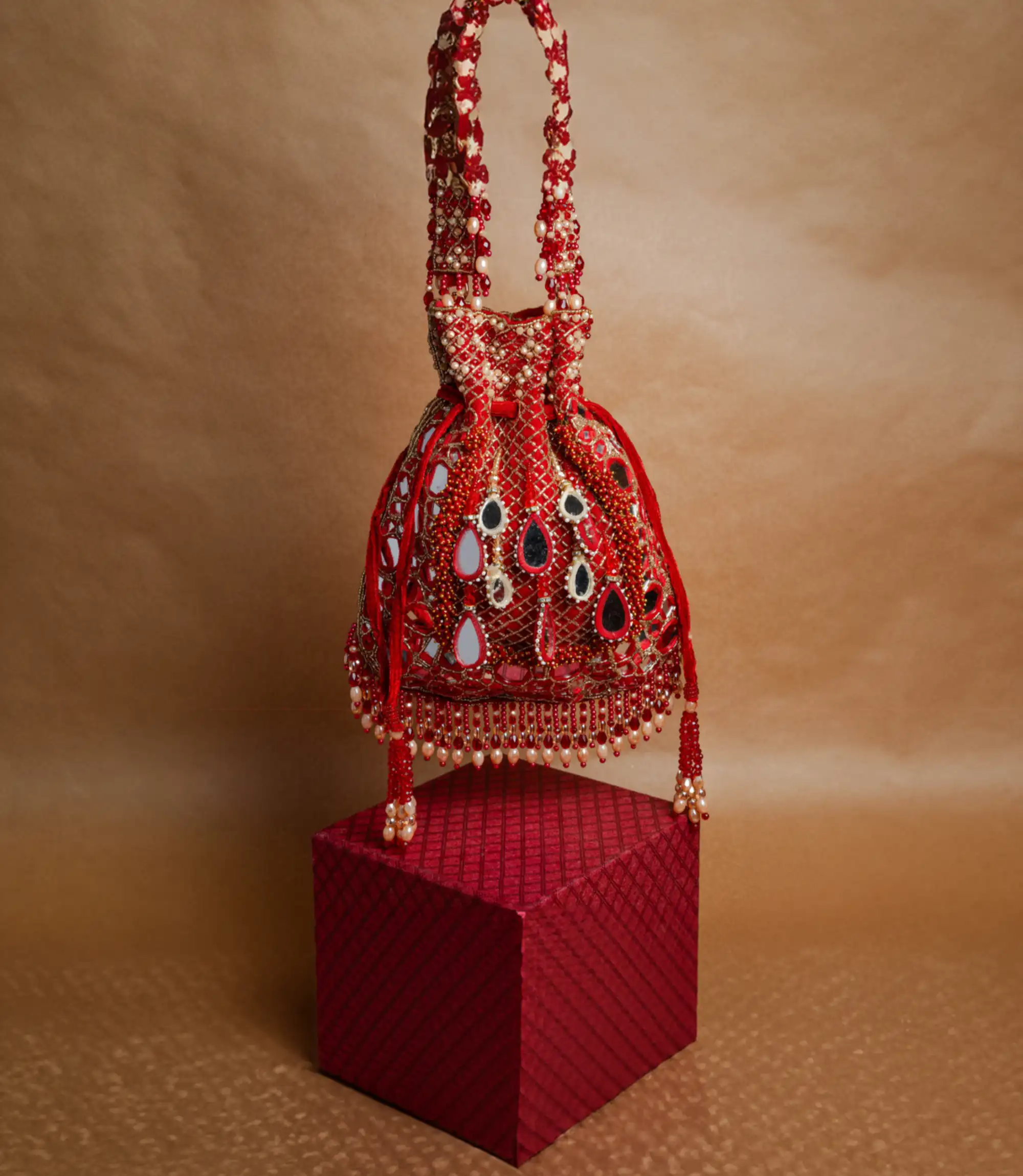 Red Mirror and Abla Work Potli with Pearl Finish and Tassel Detail