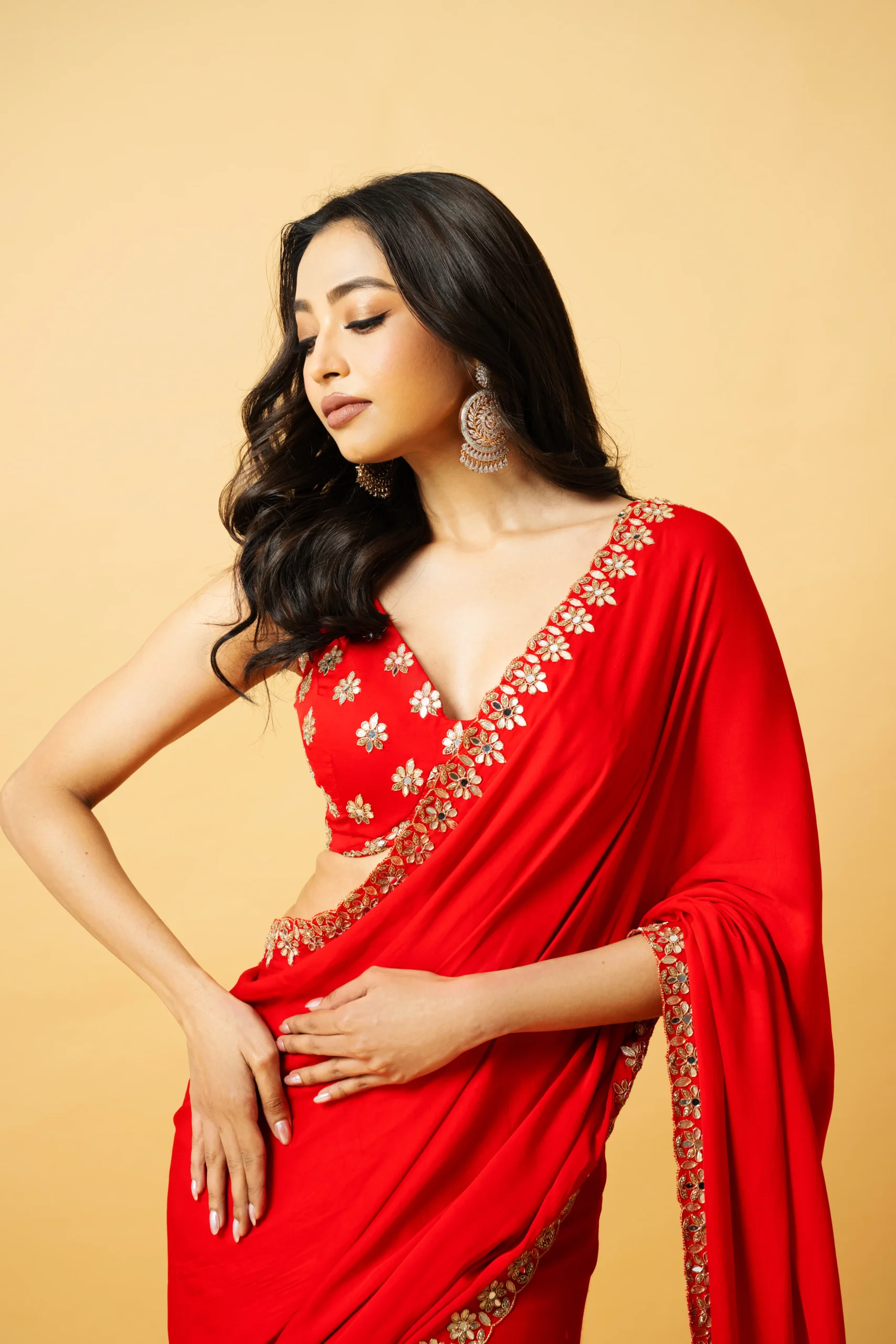 Style this elegant red saree with statement mirror or kundan earrings to complement the intricate blouse detailing. Pair it with metallic heels or classic stilettos to enhance the sleek pre-draped silhouette.
