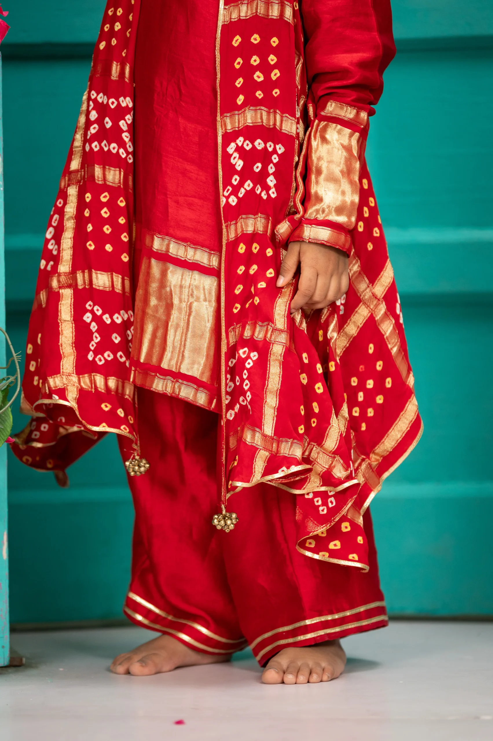 Style this elegant red silk kurta and palazzo set with traditional juttis or mojaris and delicate gold accessories for a festive look. The Gadjola jacket-style cape adds a graceful layered touch, so keep the styling minimal to highlight the rich silk fabric and traditional bandhej detailing. Perfect for festive occasions, weddings, and cultural celebrations.