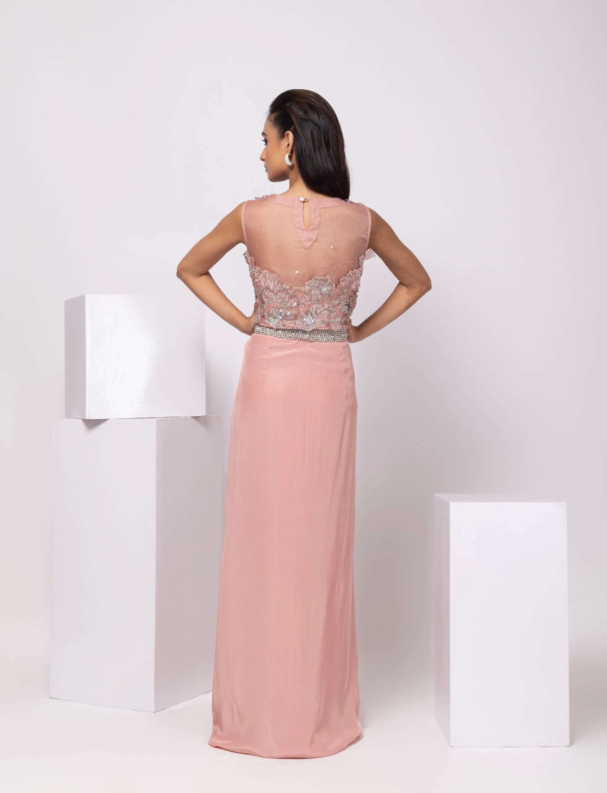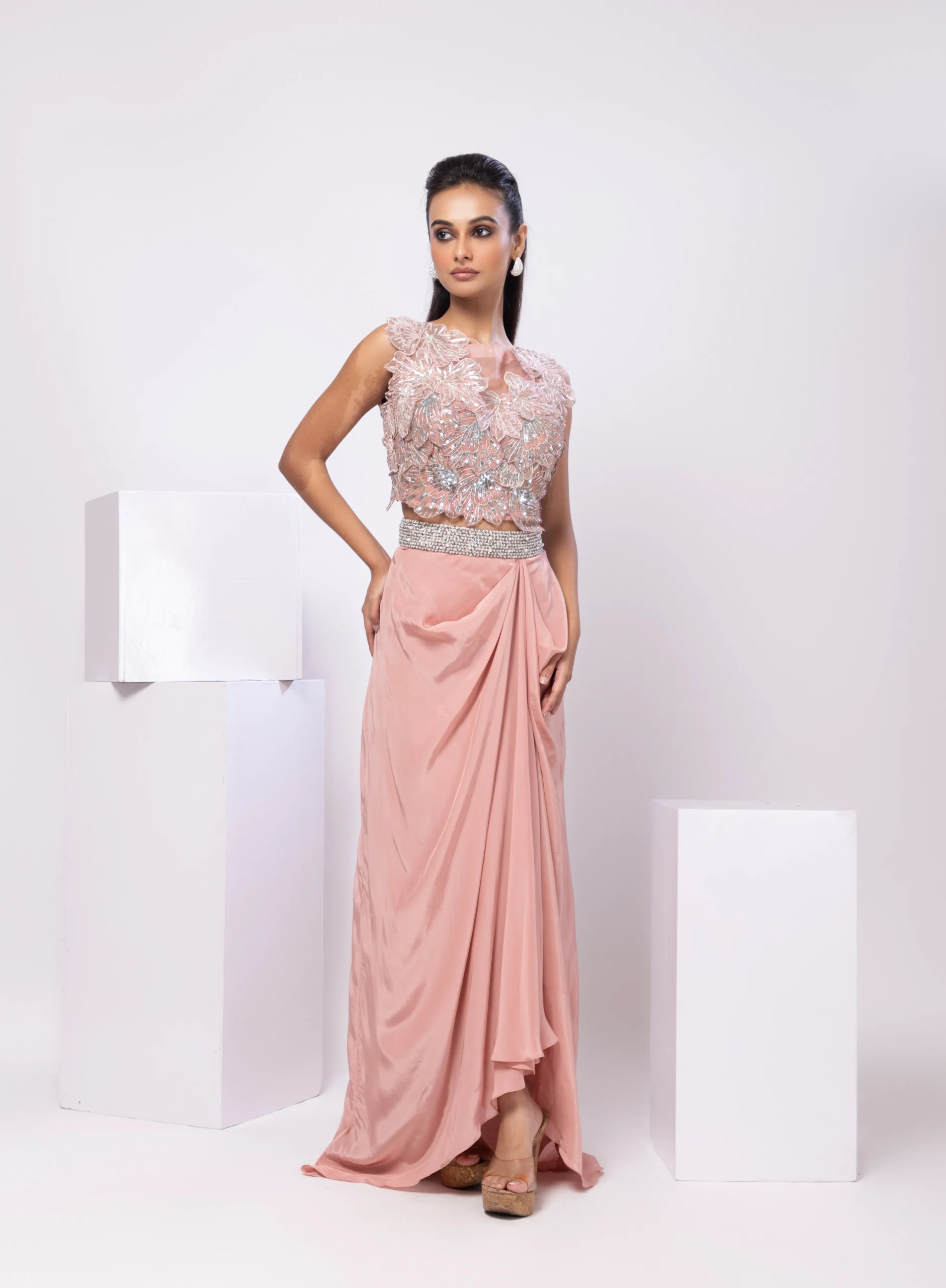 Introducing the Rose Gold Pink Shimmer Drape Skirt Set, a radiant expression of modern elegance and festive glamour. The intricately embroidered blouse is enhanced with blooming 3D floral accents that add texture and dimensional charm. Paired with a fluid rose gold pink drape skirt that moves gracefully, this ensemble is perfect for receptions, cocktail soirees, and celebratory evenings.