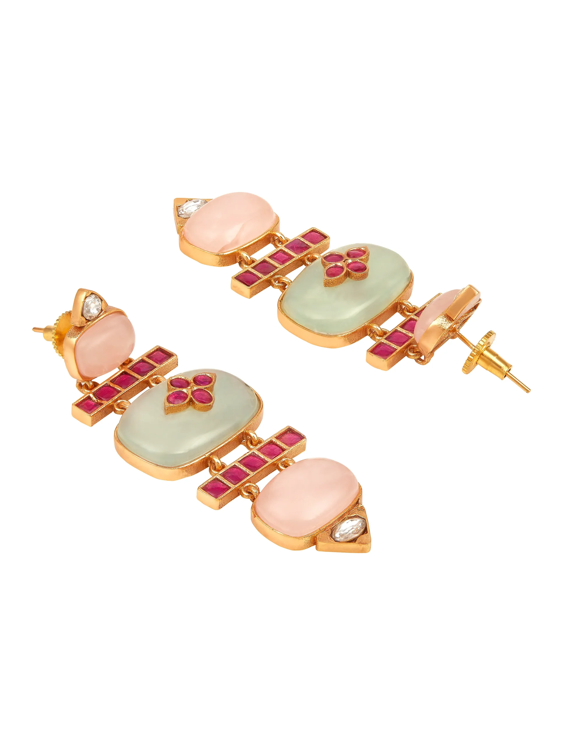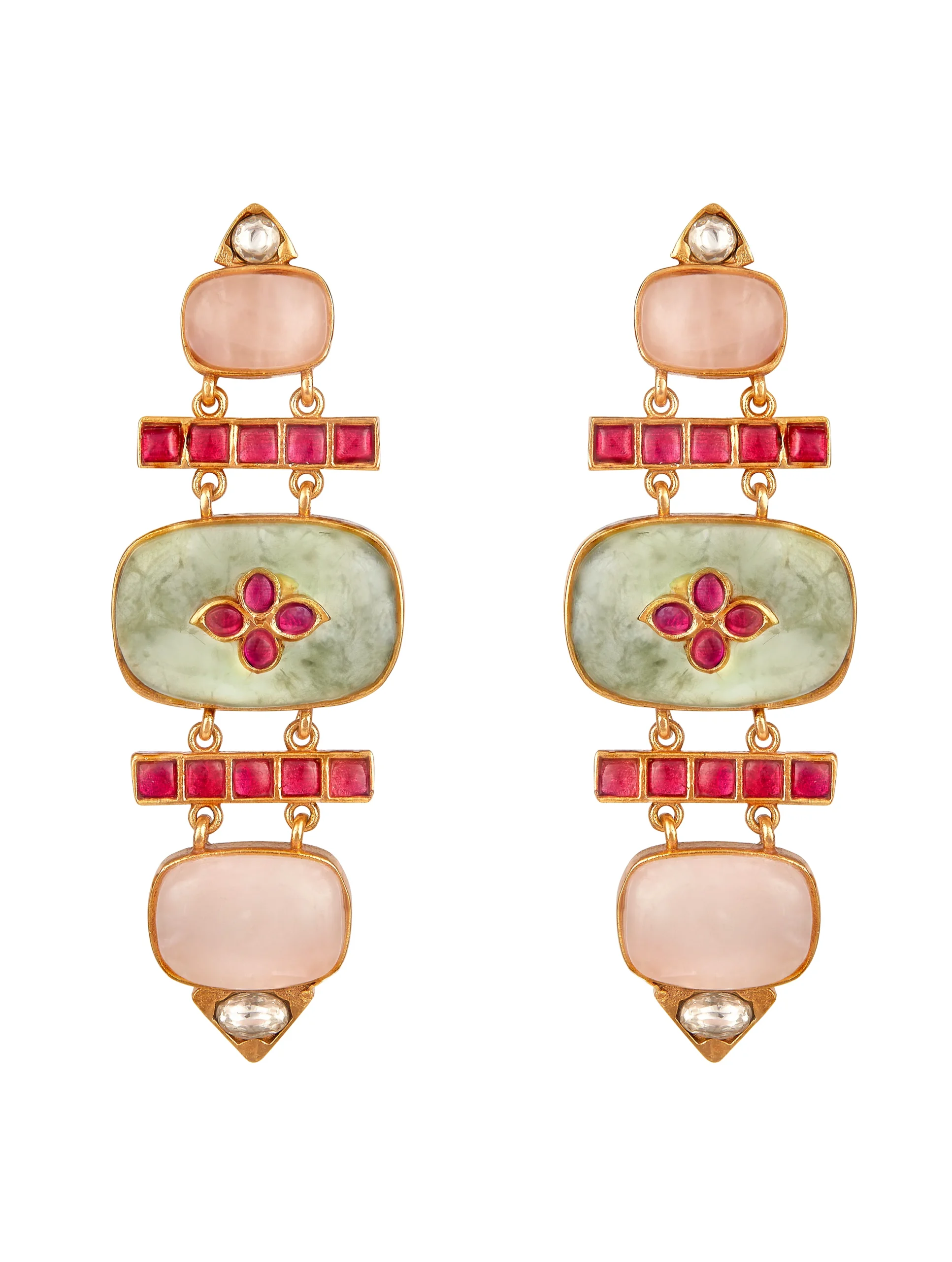 Style these elegant earrings with pastel sarees, organza lehengas, or embroidered kurta sets for weddings and festive gatherings. The soft rose quartz and jade tones pair beautifully with blush pink, ivory, mint, or gold outfits, while the ruby accents add a vibrant touch to elevate both traditional and fusion ensembles.