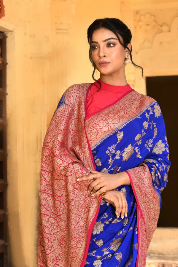 Royal Blue Banarasi Silk Saree with Rani Pink Border & Gold Zari Jaal