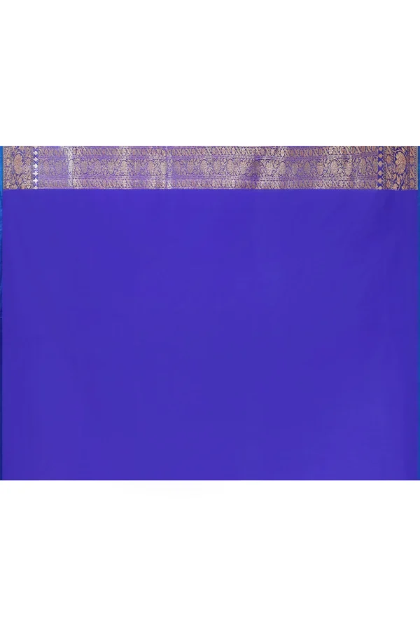 Style this royal blue Banarasi soft silk saree with statement silver, diamond, or pearl jewelry to complement its lustrous silver zari floral jaal and traditional border. Pair with silver or navy-toned heels or embellished juttis, and complete the look with a metallic clutch