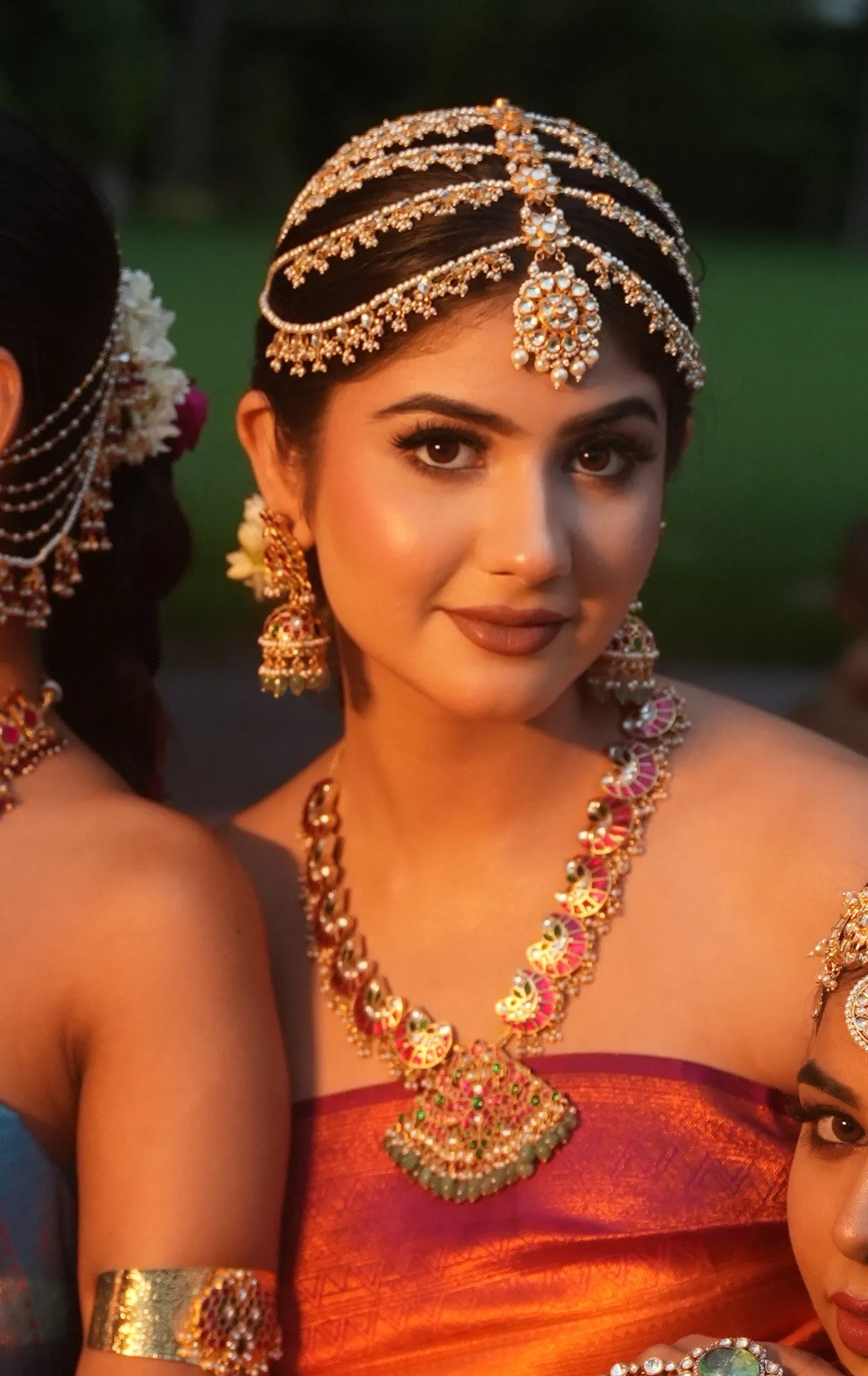Style this mathapatti with bridal lehengas, silk sarees, or heavily embroidered ensembles for weddings, receptions, and traditional ceremonies. Pair with statement earrings and a choker necklace. A sleek bun or braided hairstyle beautifully highlights the layered pearl strings and teeka.