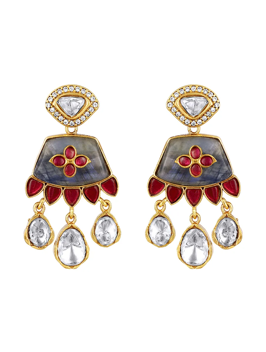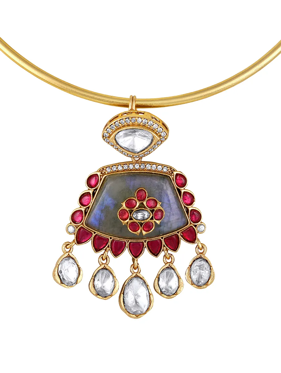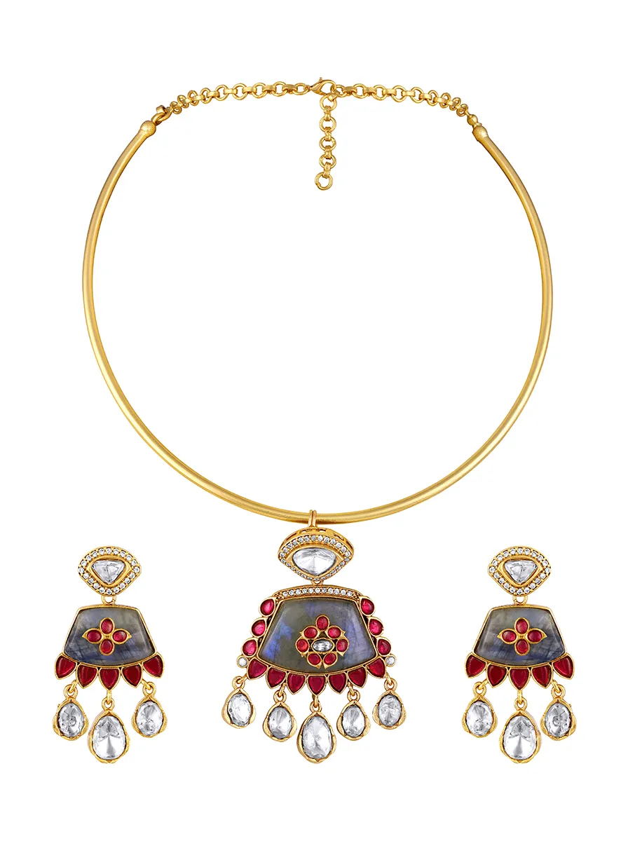 Introducing Ruby Enamel Kundan Polki Necklace Set with CZ Diamonds in Micron Gold Finish, a refined handcrafted design set in micron gold polished brass. Adorned with shimmering moissanite kundan polki, vibrant ruby enamel accents, and sparkling CZ diamonds, this elegant necklace set brings regal charm and festive brilliance to weddings and special occasions.