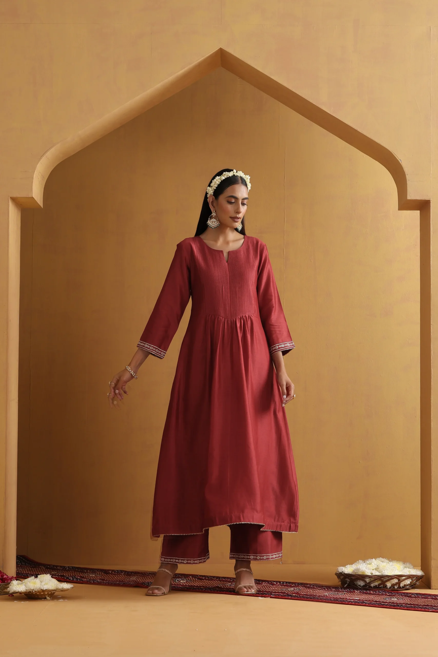 Introducing this elegant Rust colored ethnic suit set, designed to reflect classic tradition with refined festive sophistication. The ensemble features a graceful, structured silhouette paired with matching bottoms and a coordinated dupatta for a complete look. It is usually detailed with intricate embroidery on the yoke, neckline, and sleeves, with select elements enhanced using subtle sequins or Moti (pearl) work for added richness.