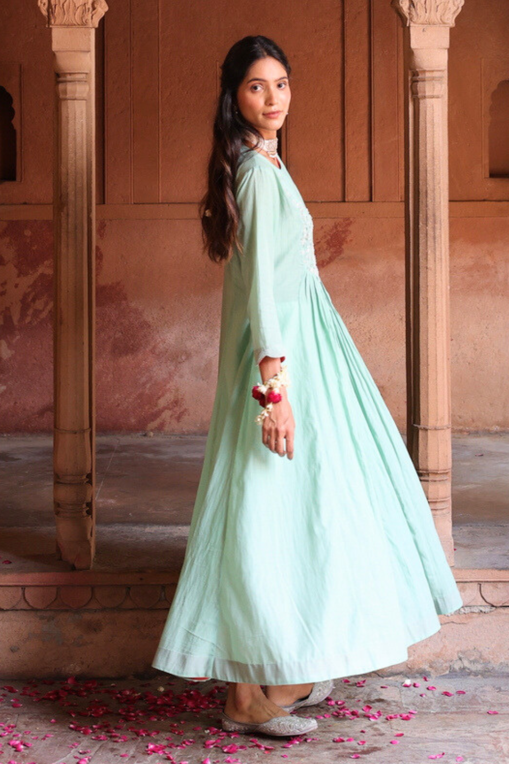 Enhance this kurta set with traditional gold or antique finish jewelry to complement its vibrant hue. Opt for statement earrings or delicate jhumkas to draw attention to the hand embroidery neckline. Pair with embellished juttis or strappy sandals in neutral or gold tonea for q cohesive finish.