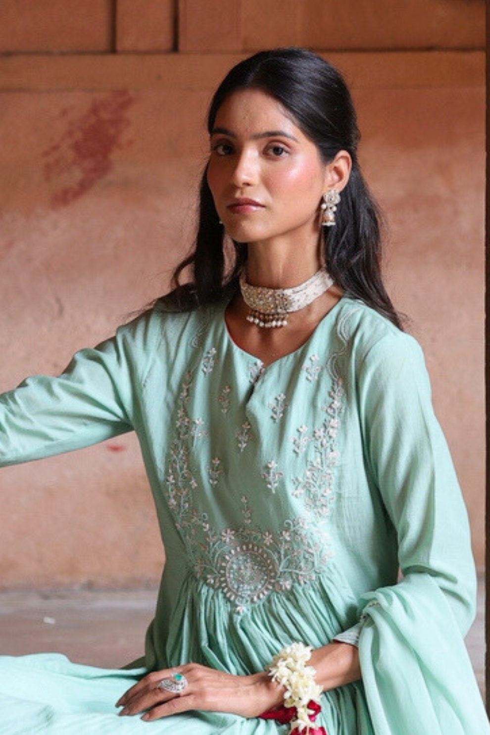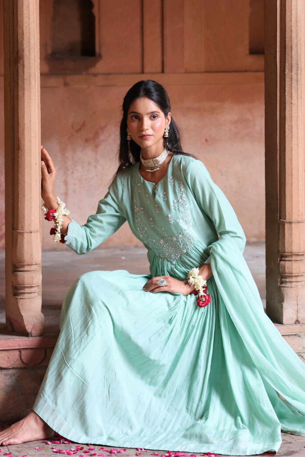 Introducing sage green two-piece kurta set, crafted in pure mul chanderi. The flowing, full-length kurta features a beautifully defined bodice adorned with delicate hand-embroidered detailing around the neckline. The center-gathered skirt falls gracefully into soft folds from the waist, creating an elegant silhouette. Completed with a matching dupatta, this ensemble offers a refined and vibrant look, perfect for festive occasions and daytime celebrations.