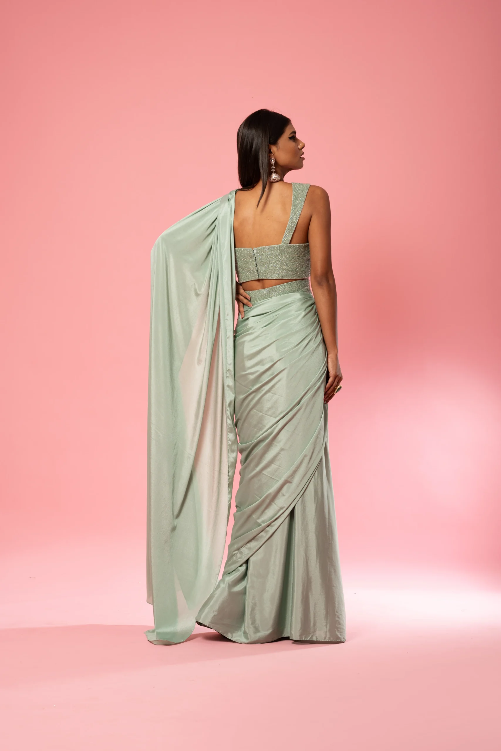 Sage Green Crepe Silk Pre-Stitched Saree with Embroidered Blouse and Belt