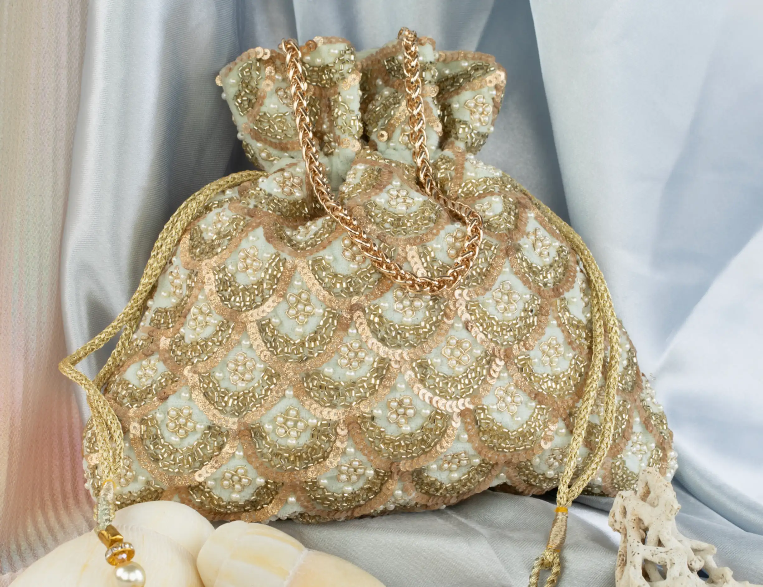 Sea Green and Gold Sequins Scalloped Potli with Delicate Pearl Work