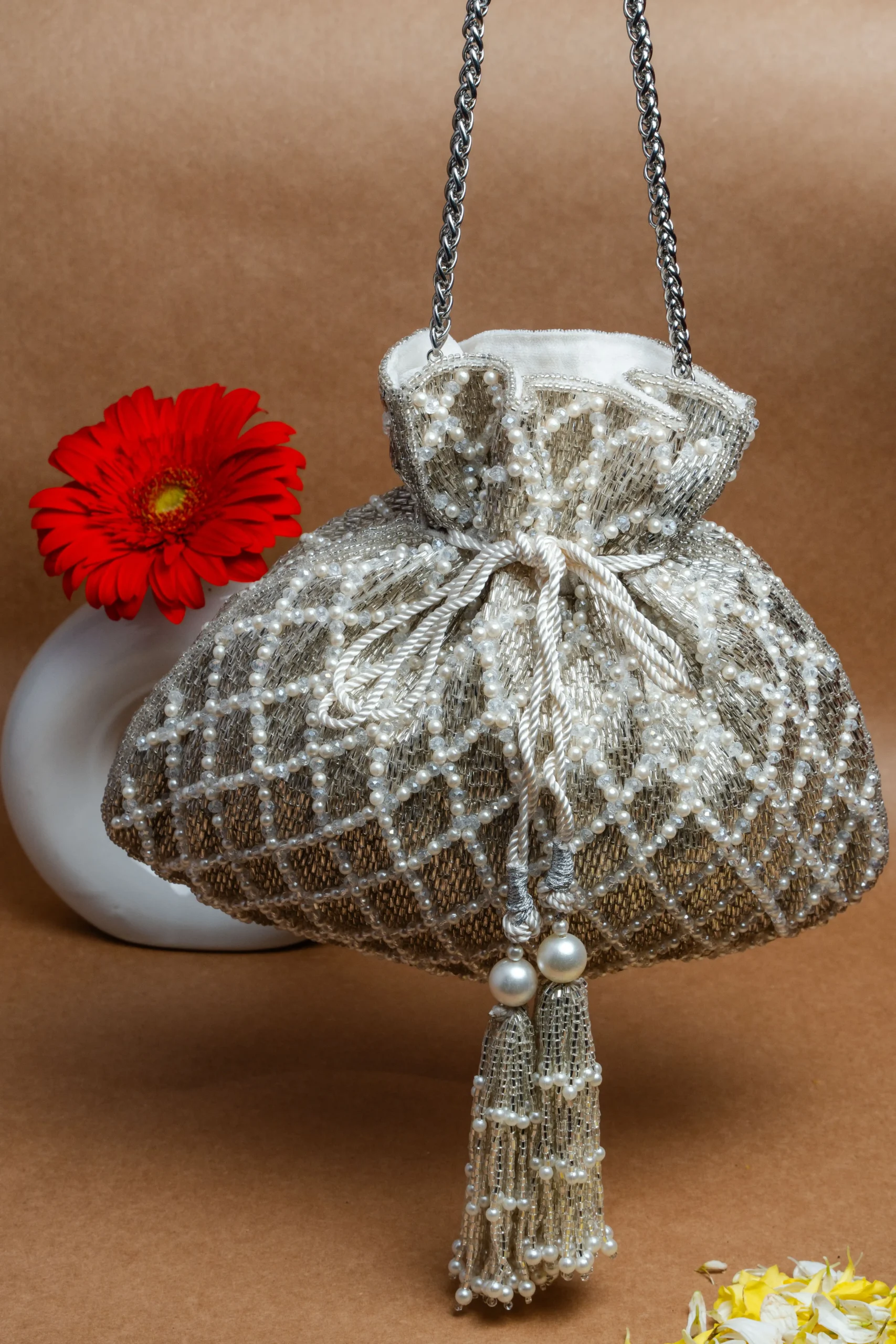 Shaded White & Silver Potli with Criss-Cross Delicate Pearl Embellishment