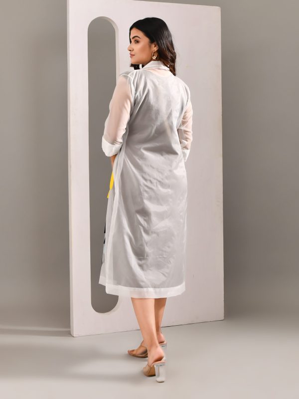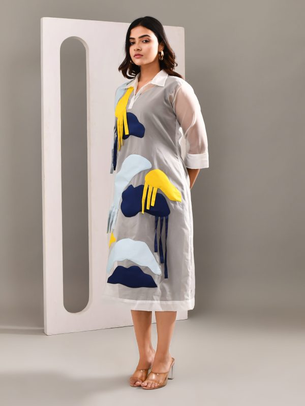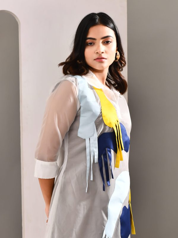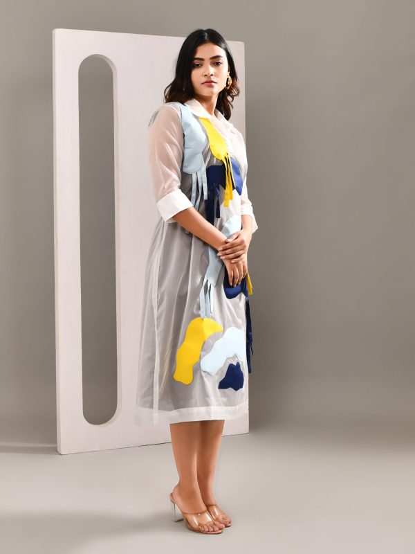 Let your clothes do the talking when your words fall short. With this sheer organza multicolour patched dress, over a neutral hue sleeveless dress.
