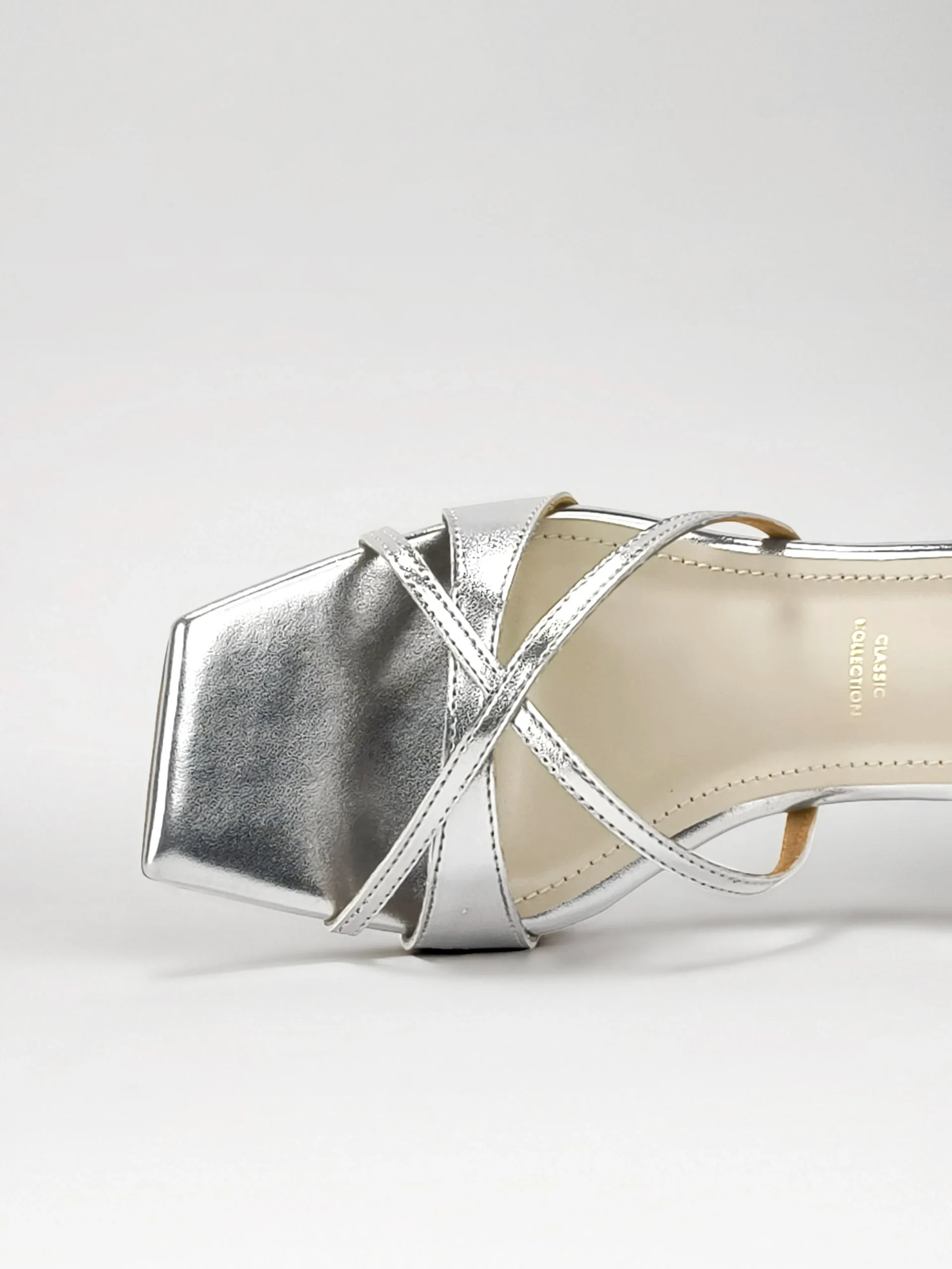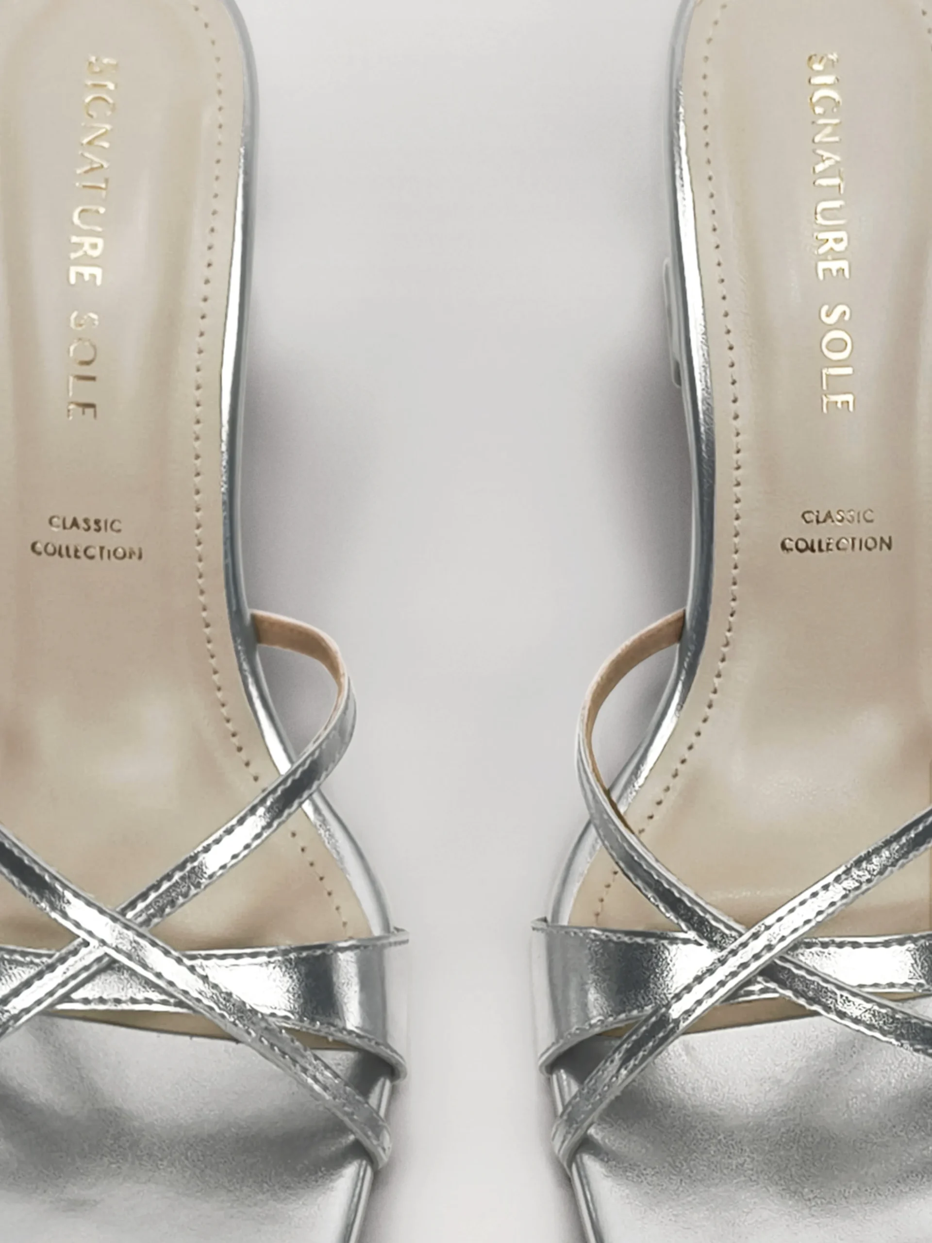 Featuring two thin diagonal straps forming an X cross with tonal construction in metallic faux leather, this Silver Cross-Strap Block Heel Mule shines with subtle metallic glow.