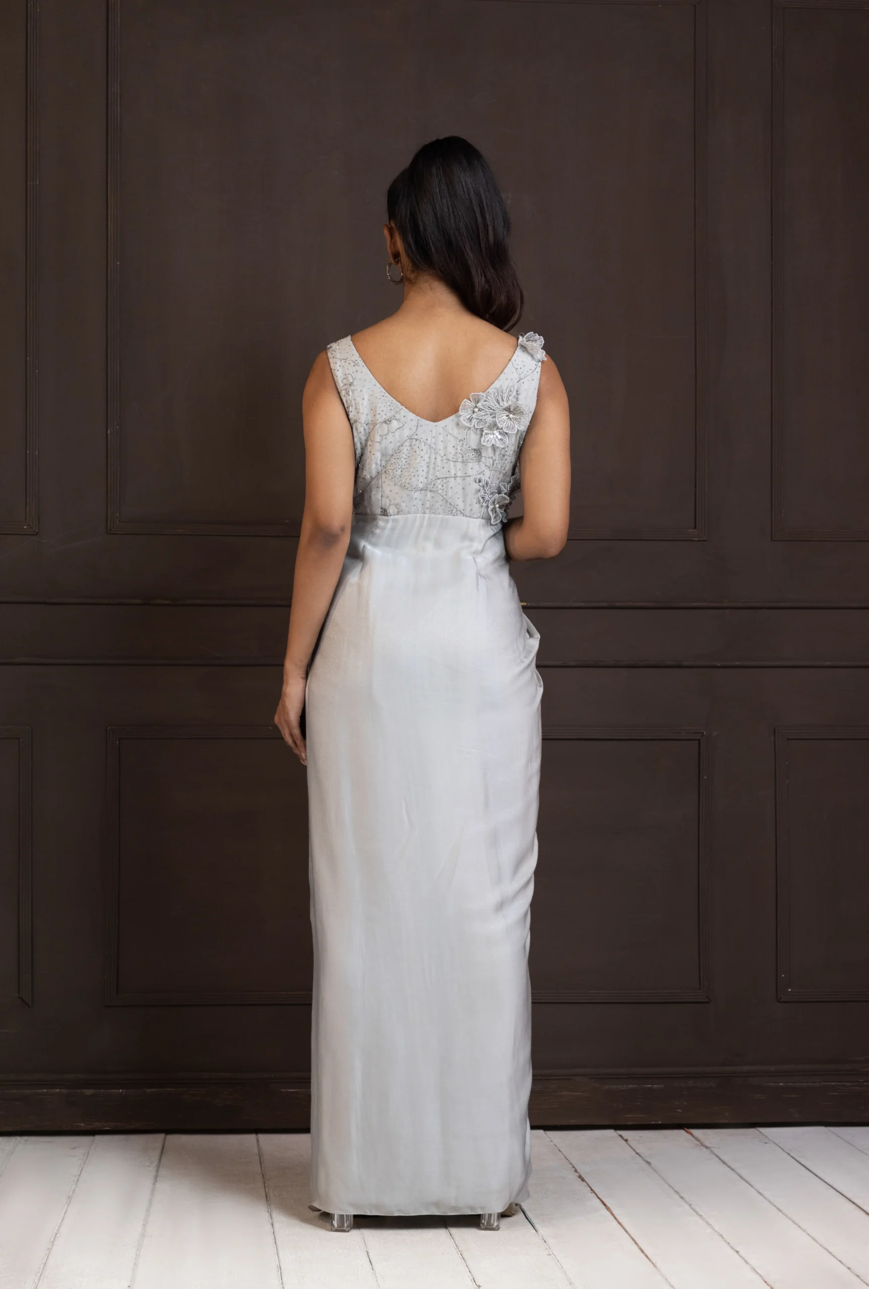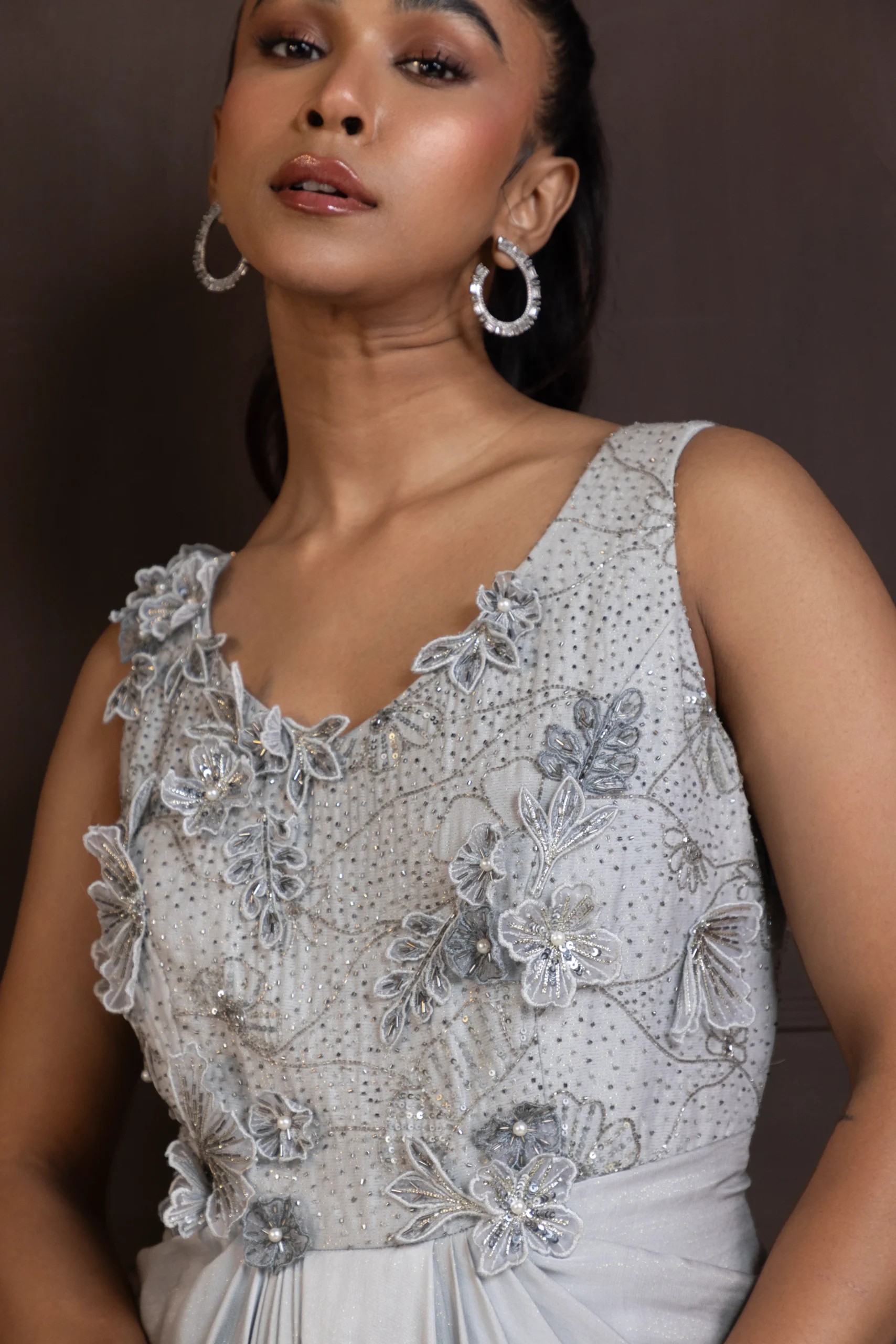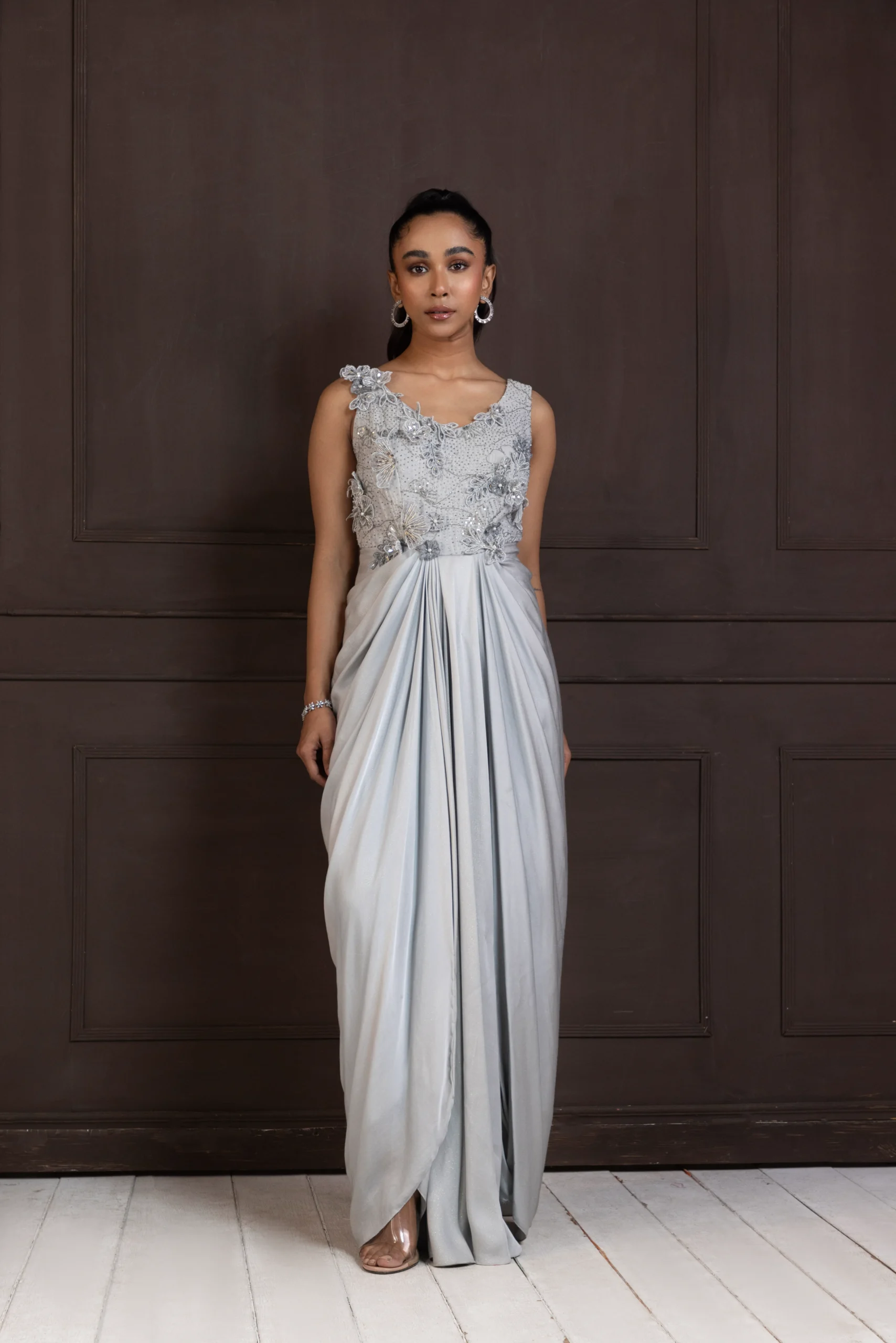 Introducing a stunning silver gown that embodies grace and glamour. Featuring a sleeveless silhouette, the bodice is richly embellished with shimmering sequins and beadwork. The lightweight, draped skirt cascades fluidly to enhance the silhouette, making it an ideal choice for elegant evenings, formal events, and statement occasions.