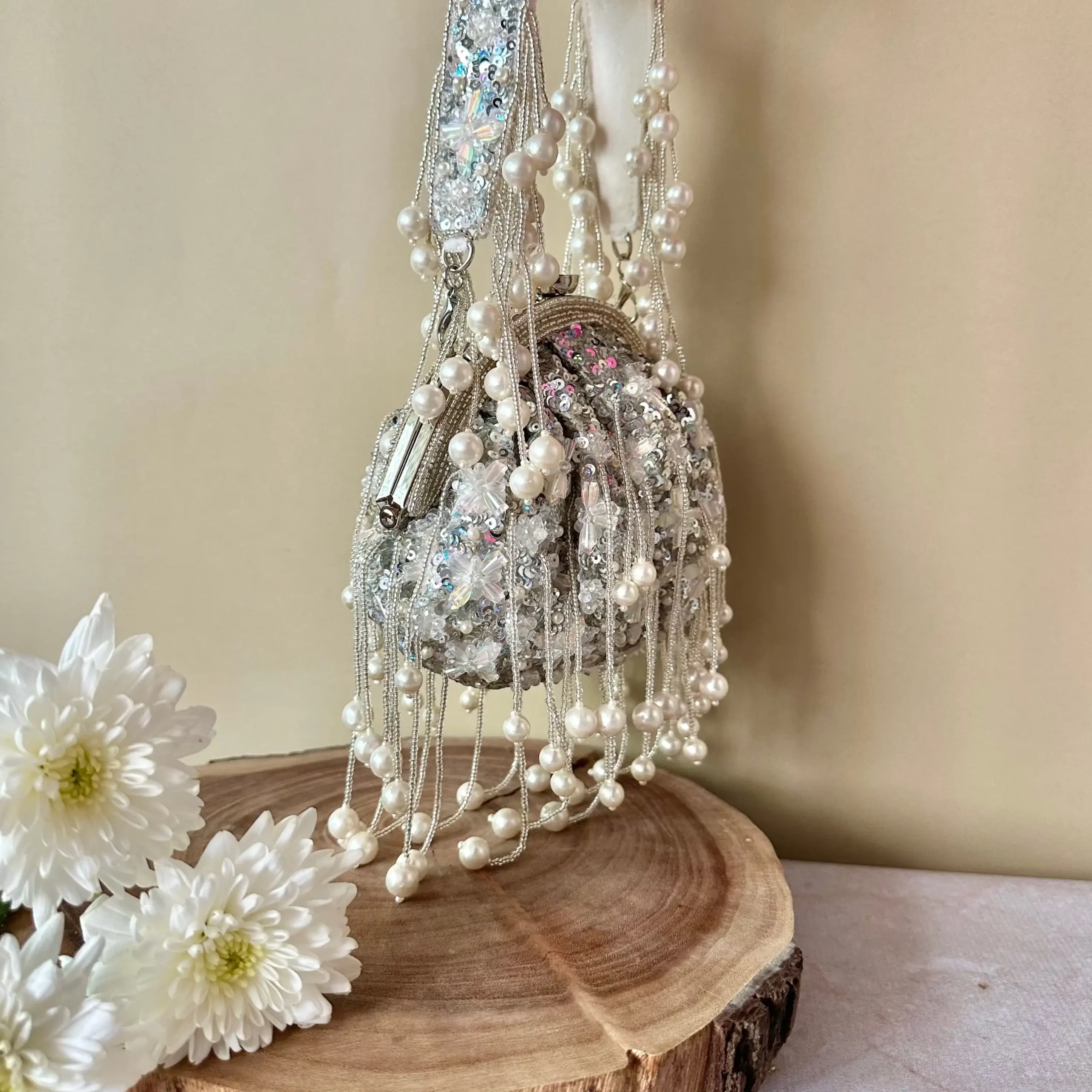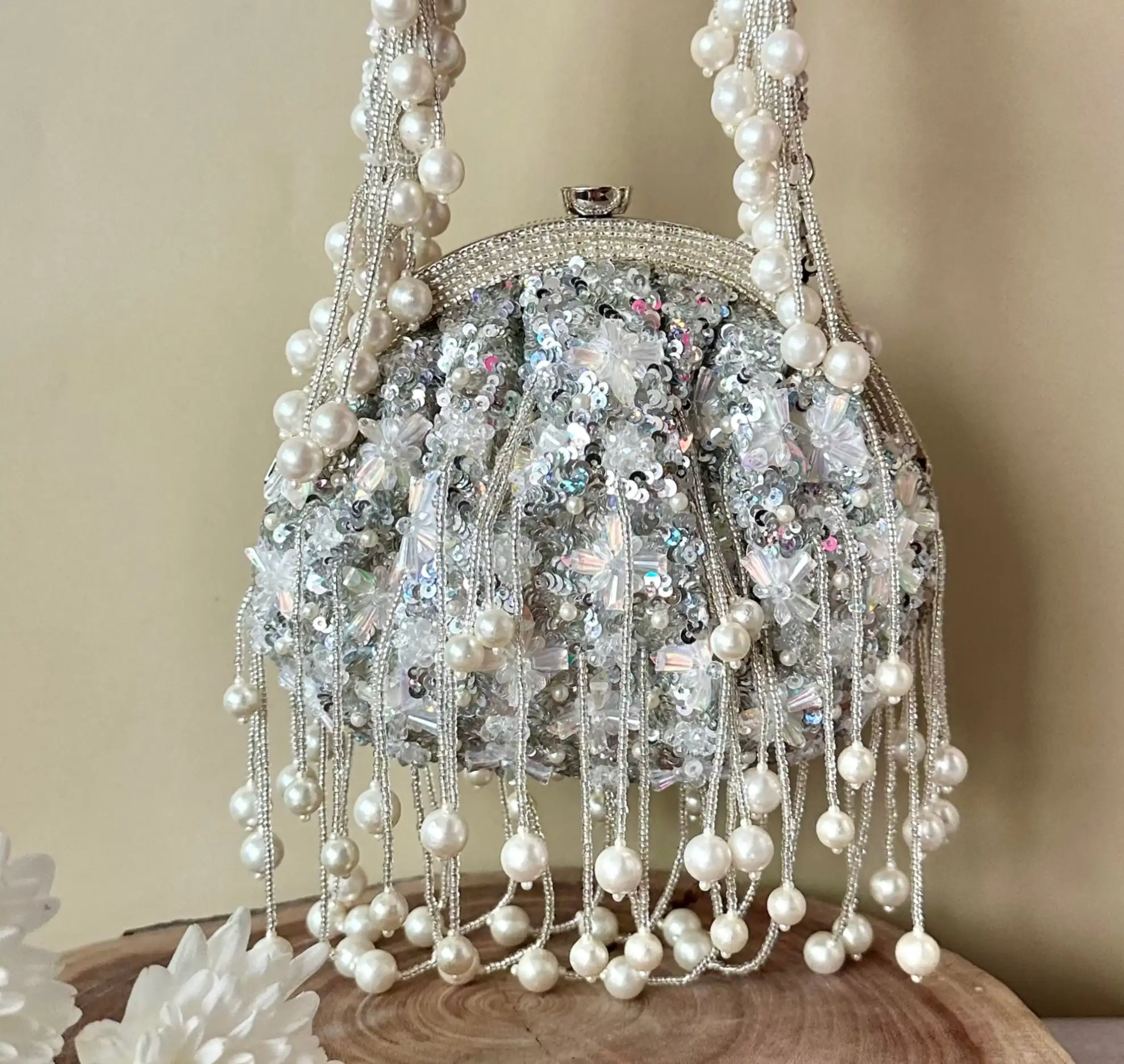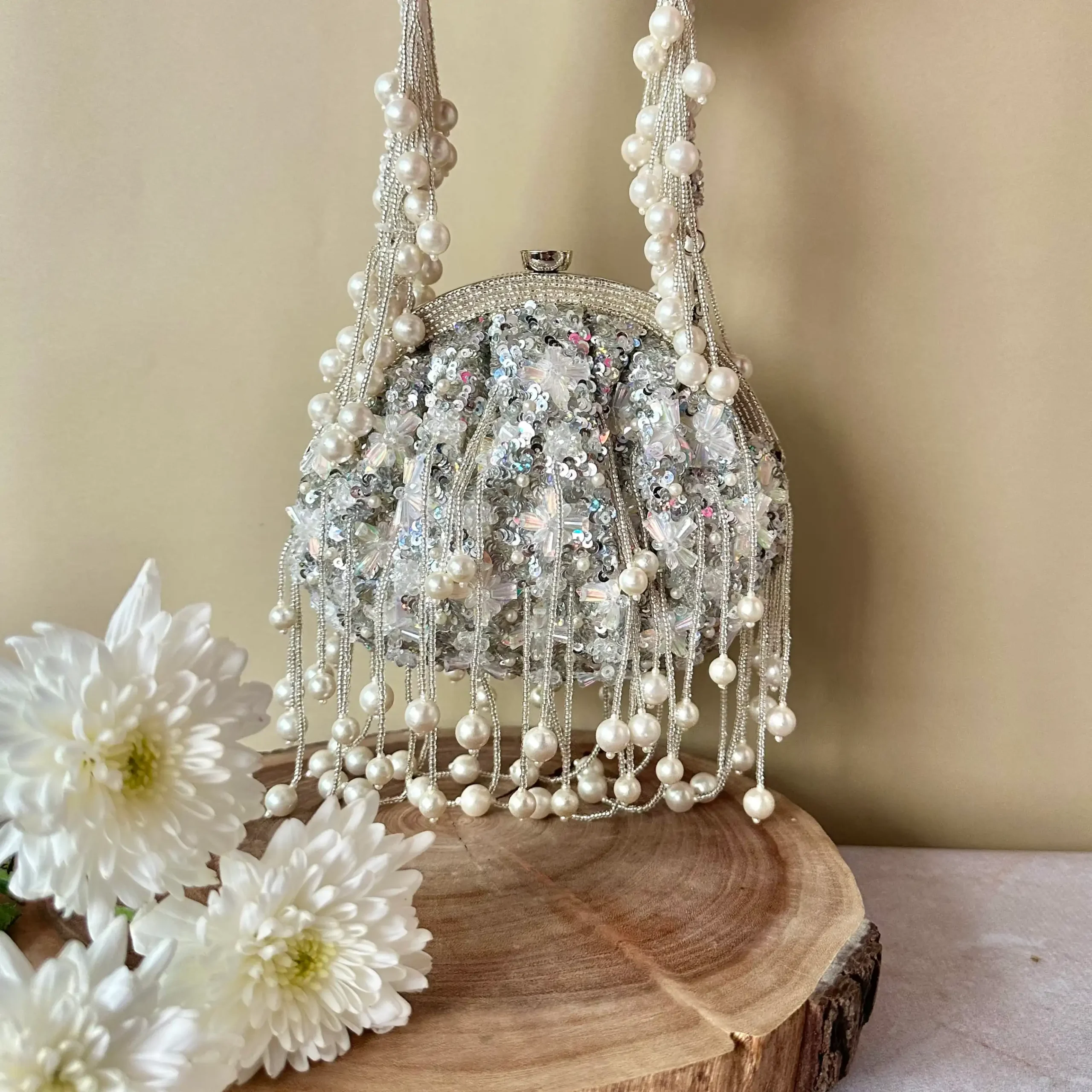 Introducing a voguish clutch adorned with shimmering silver sequinned jewel embellishments that dangle gracefully for a refined touch of glamour. Finished with a subtle sequinned frame, this elegant accessory blends contemporary sparkle with timeless sophistication, making it perfect for weddings, celebrations, and evening occasions.