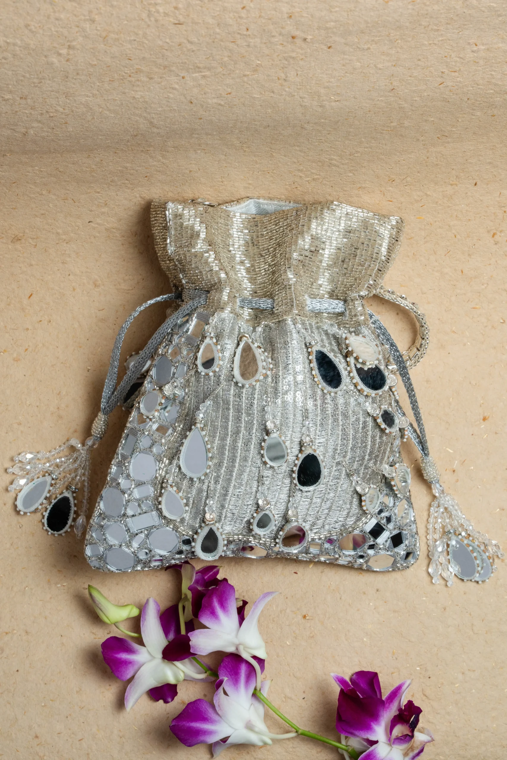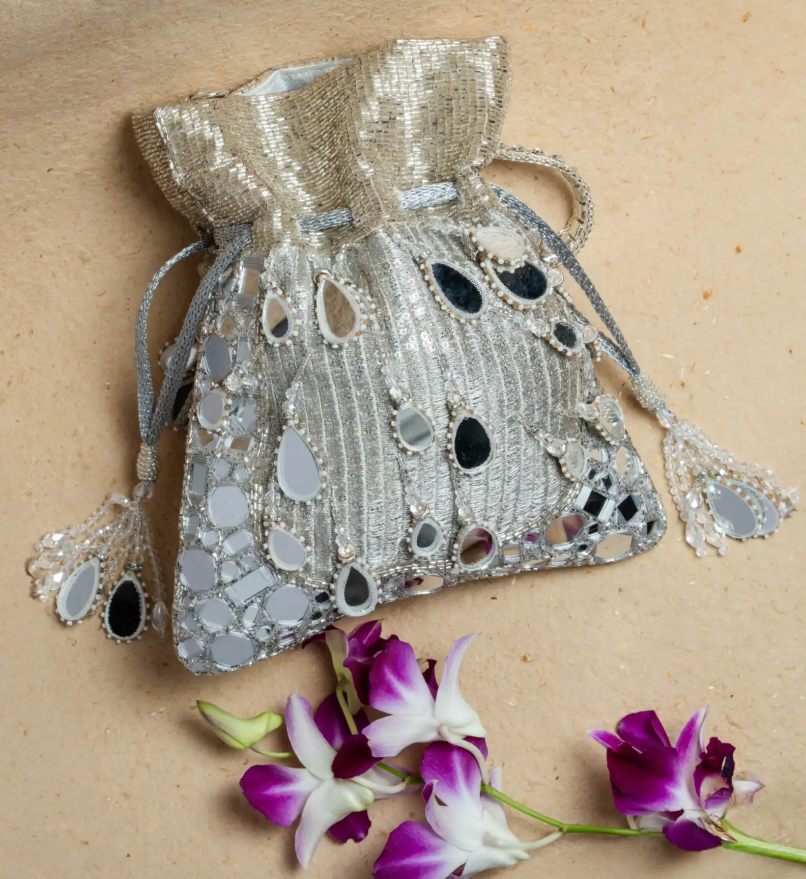 Silver Mirror & Abla Work Potli with Pearl Tassels and Beaded Detailing