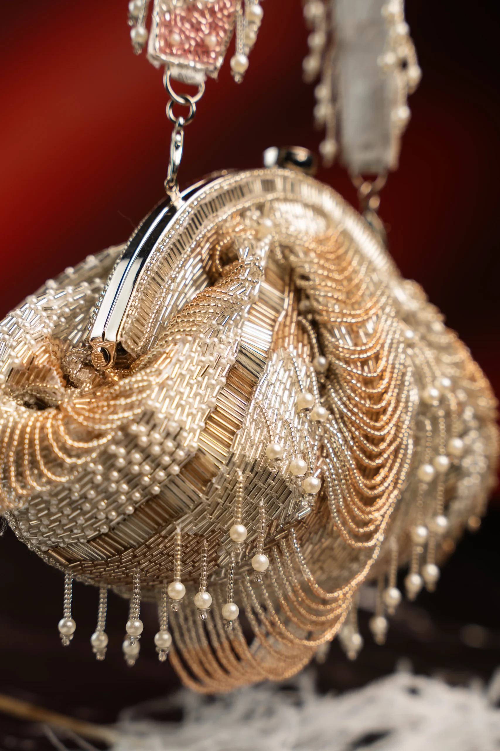 Introducing the Silver & Rose Gold Scallop Beaded Clutch, an elegant accessory designed to add a hint of shimmer to your evening look. Featuring delicate scallop detailing in luminous silver accented with soft rose gold tones, it is adorned with subtle beaded tassels and pearls for a graceful finish. The removable pearly beaded handle allows versatile styling as a clutch or potli. Finished with intricate sequin and beadwork, this piece is perfect for weddings, celebrations, and stylish night outings.