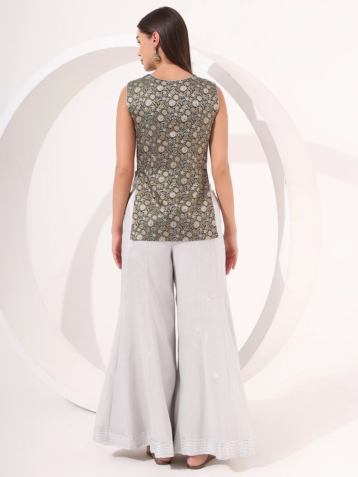 Silver Sharara Set with Brocade Side-Cut Tie-Up Jacket for Festive Wear