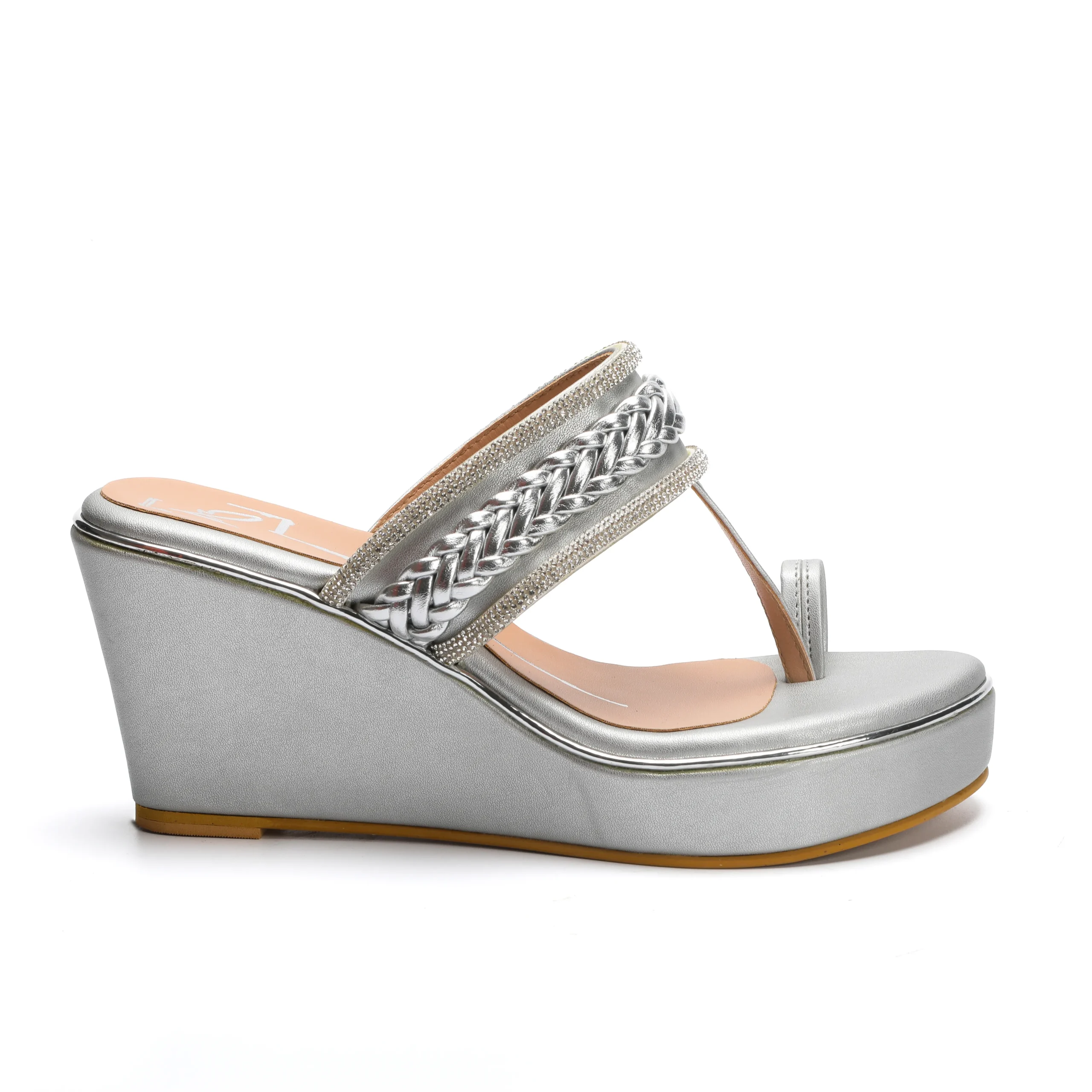 Featuring a pair of silver wedges in faux leather base with swarovski detailing. It has a faux leather lining and 3-inch heels. Pair it with any outfit to elevate your look for any special occasion.