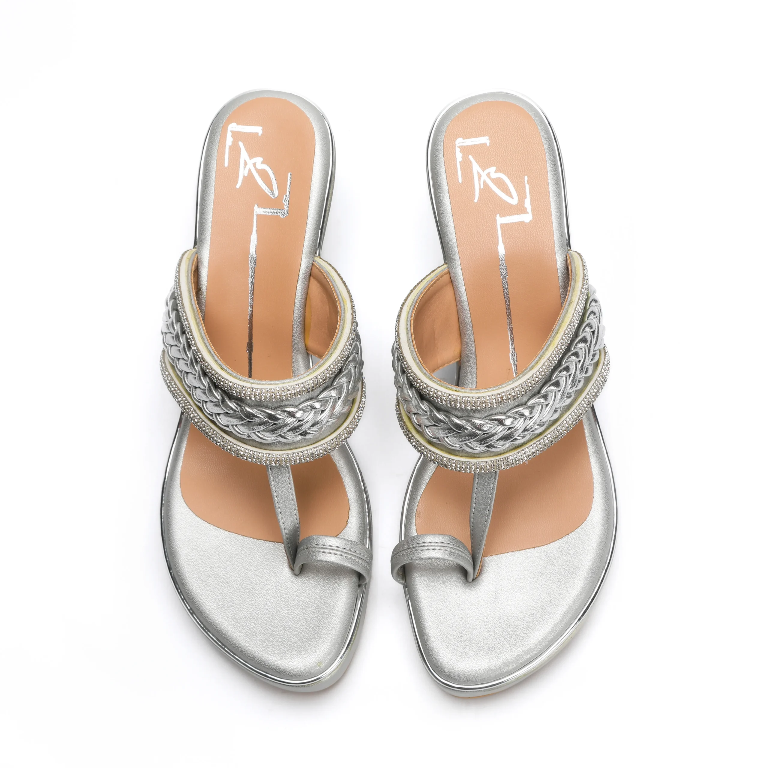 Pair these silver Swarovski wedge sandals with festive lehengas, sarees, or embellished anarkalis for weddings and celebrations. They also complement contemporary fusion outfits and evening dresses, adding a sleek and glamorous metallic accent to your look.