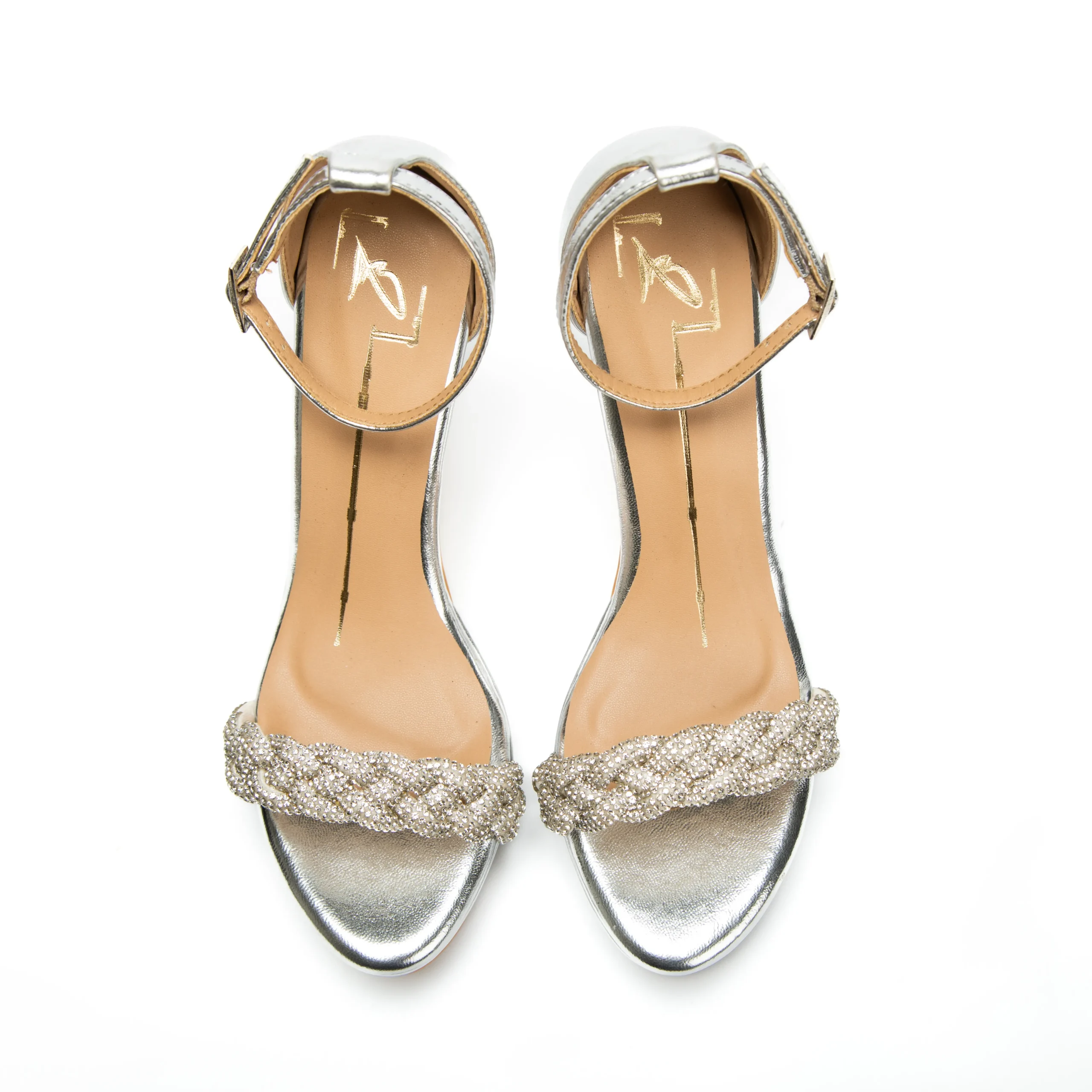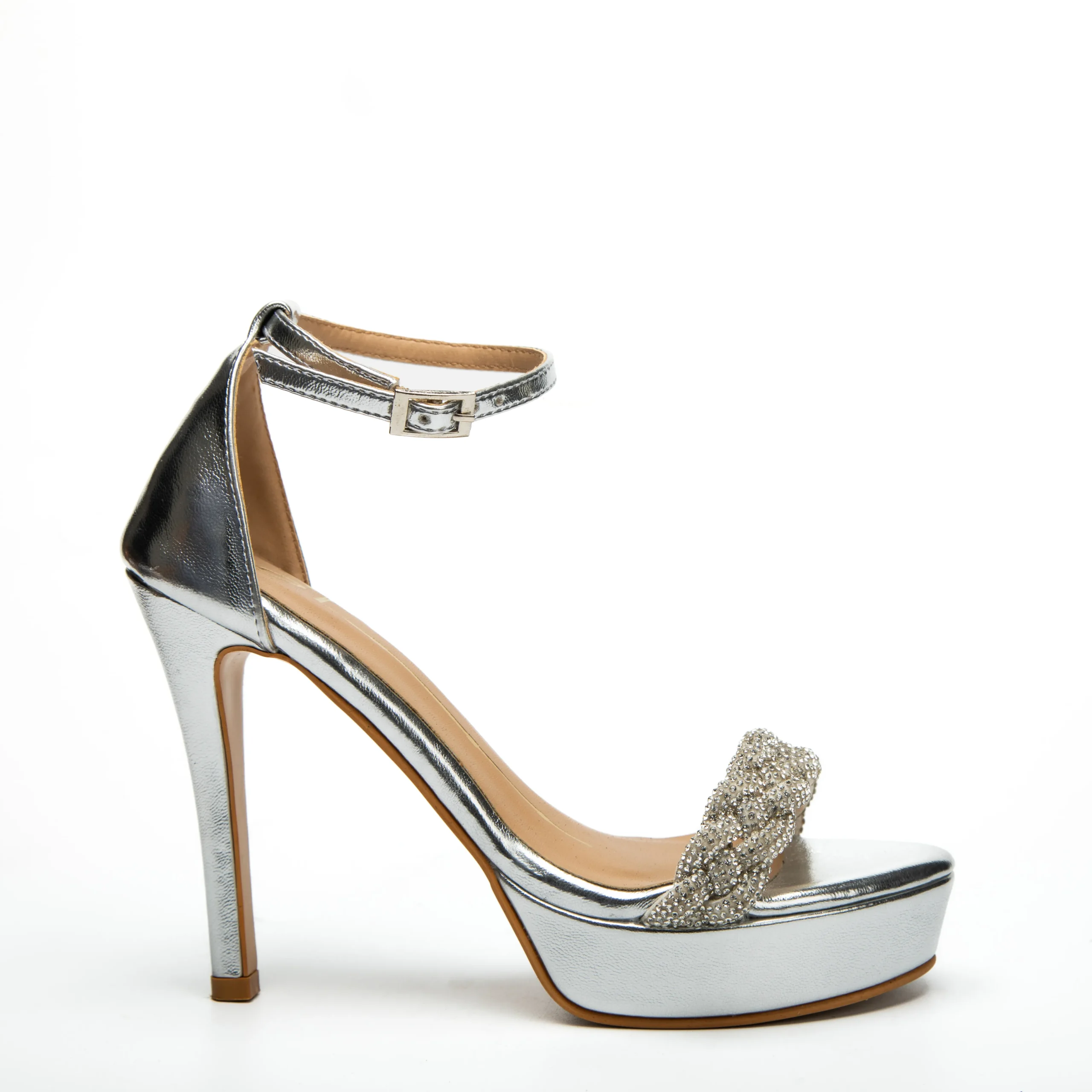 Featuring a pair of silver heels in faux leather base with swarovski detailings. It has a faux leather underlining, gel cushioning, and 5 inch heels.