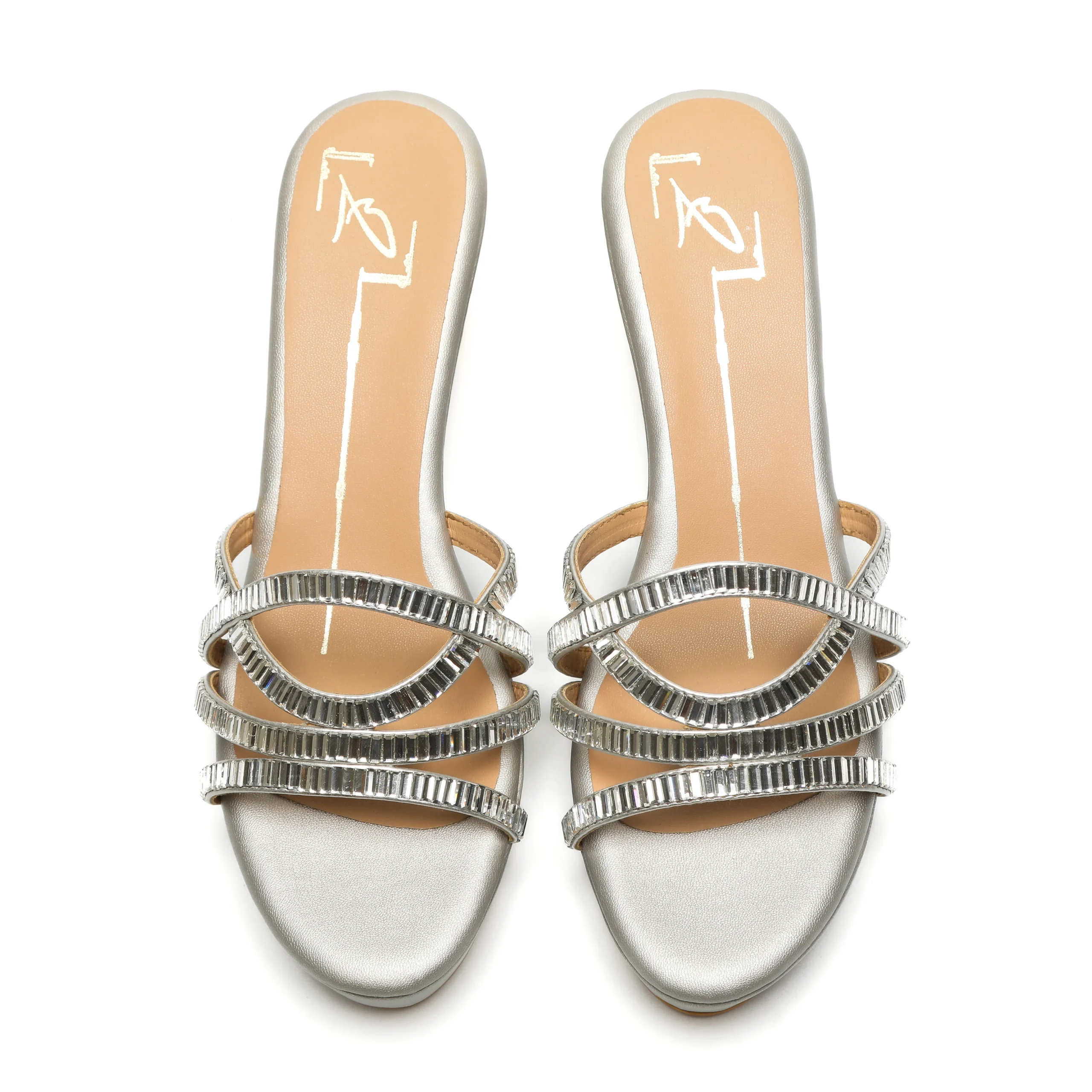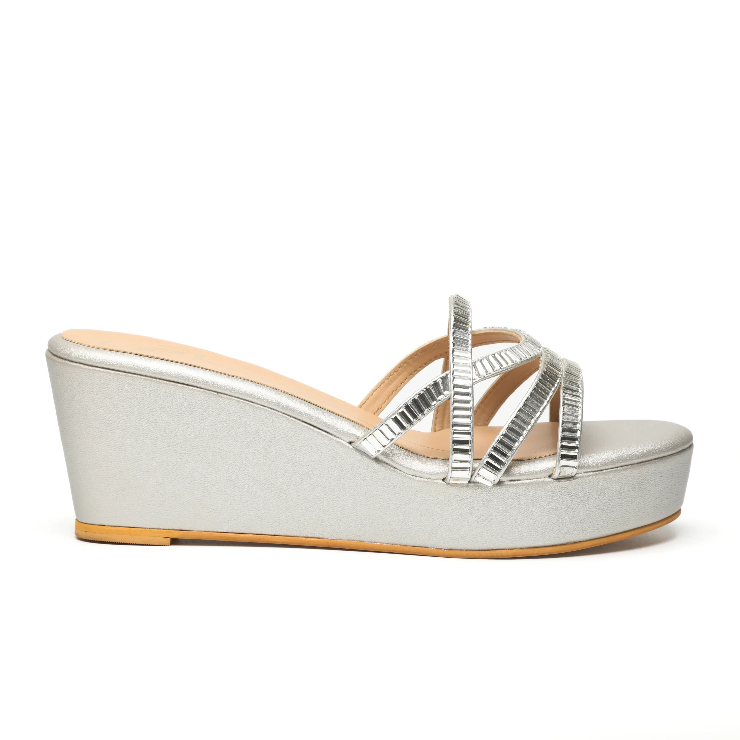 Featuring a silver wedges in faux leather base with swarovski detailing. It has a faux leather underlining, gel cushioning and 2.5 inch heels.