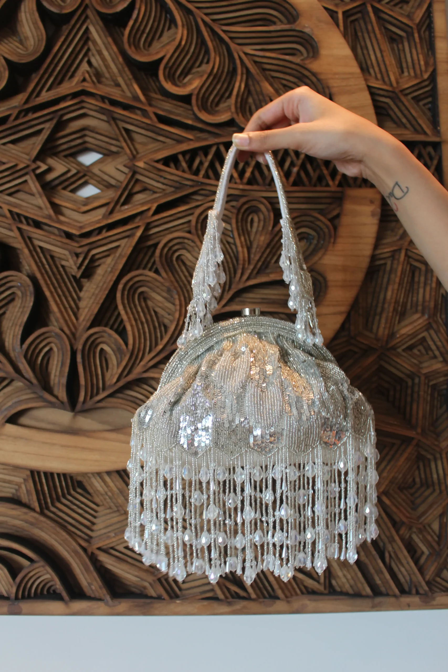 Introducing the Silver White Beaded Ball Clutch with Shimmering Tassel Embellishment, a graceful accessory adorned with intricate beadwork and delicate shimmering tassels. Crafted in a unique ball-shaped silhouette, this clutch beautifully blends traditional artistry with modern sophistication, making it perfect for weddings, festive celebrations, and special occasions.