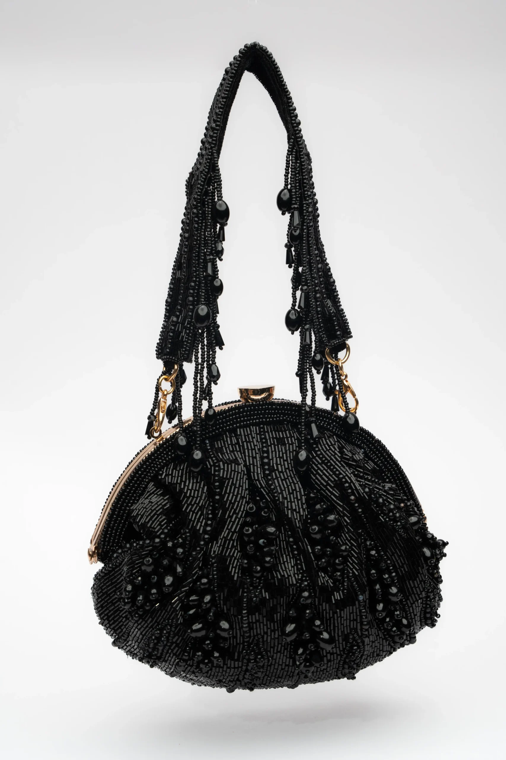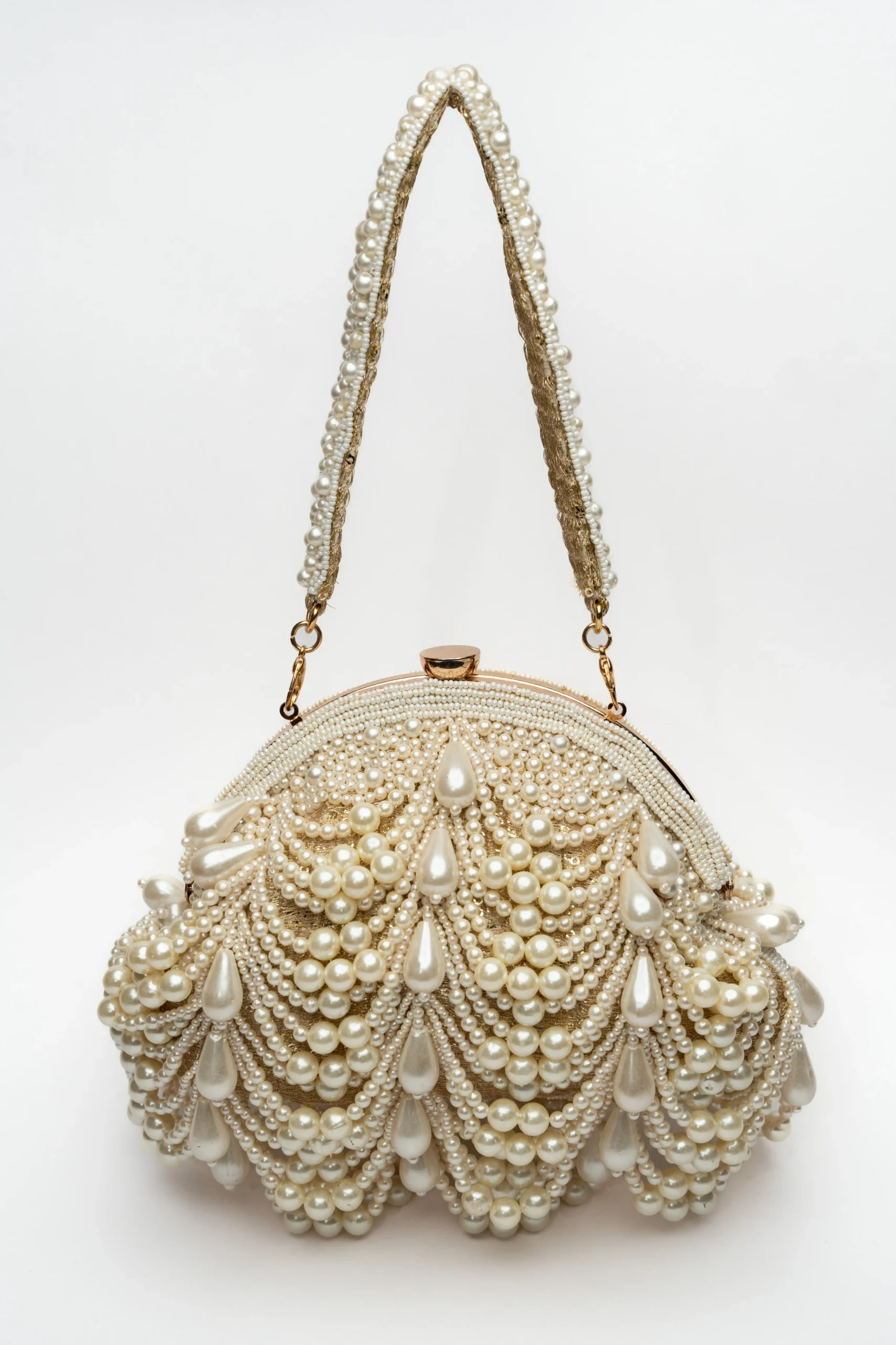 Introducing the Silver White Beaded Ball Clutch with Shimmering Tassel Embellishment, a graceful accessory adorned with intricate beadwork and delicate shimmering tassels. Crafted in a unique ball-shaped silhouette, this clutch beautifully blends traditional artistry with modern sophistication, making it perfect for weddings, festive celebrations, and special occasions.