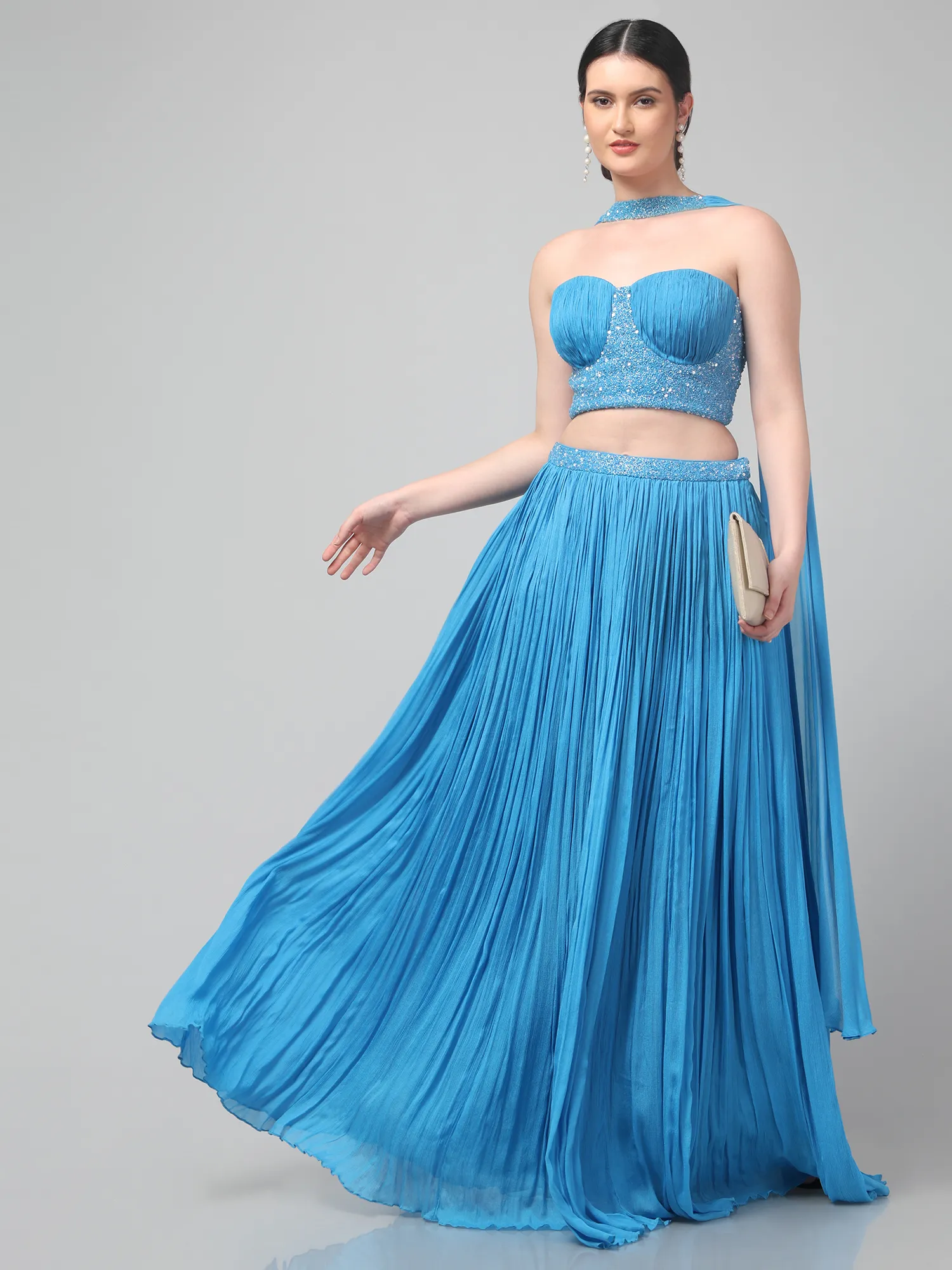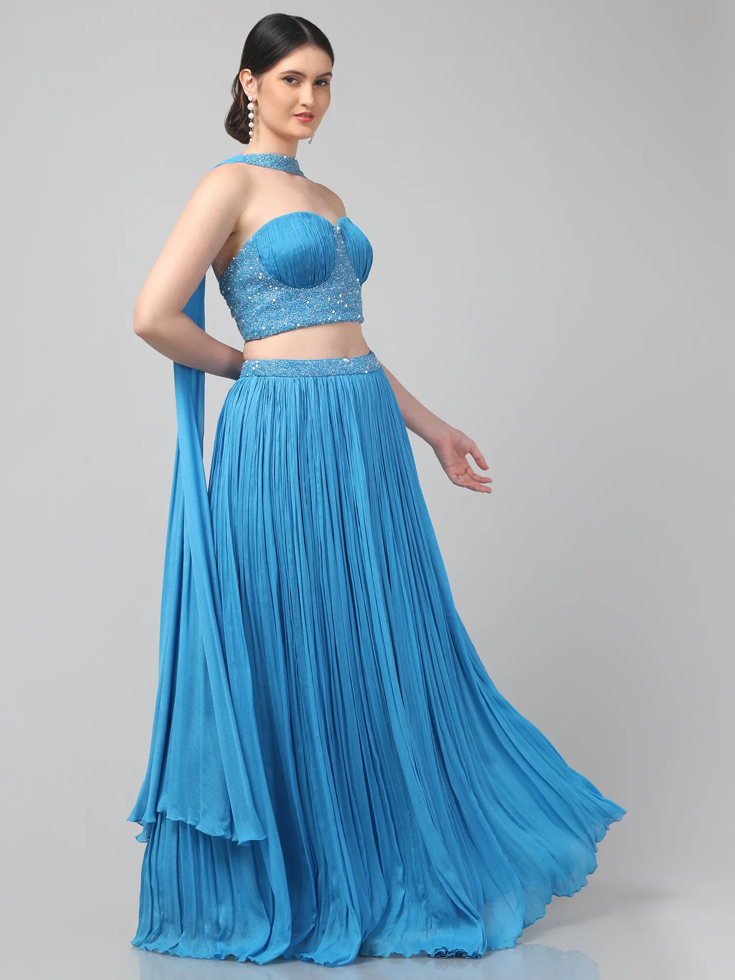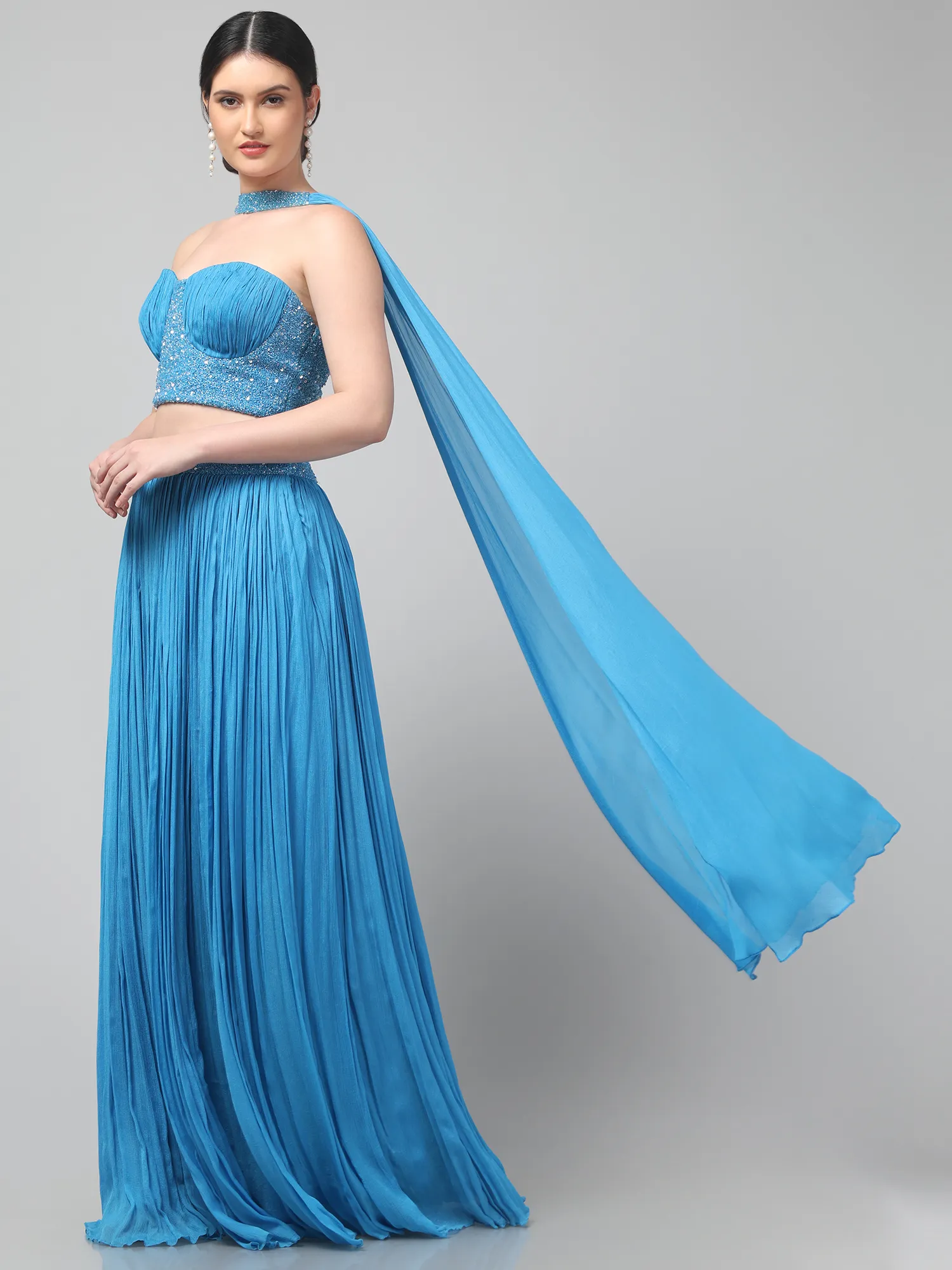 Sky Blue Corset Set with Pleated Skirt and Attached Drape Dupatta