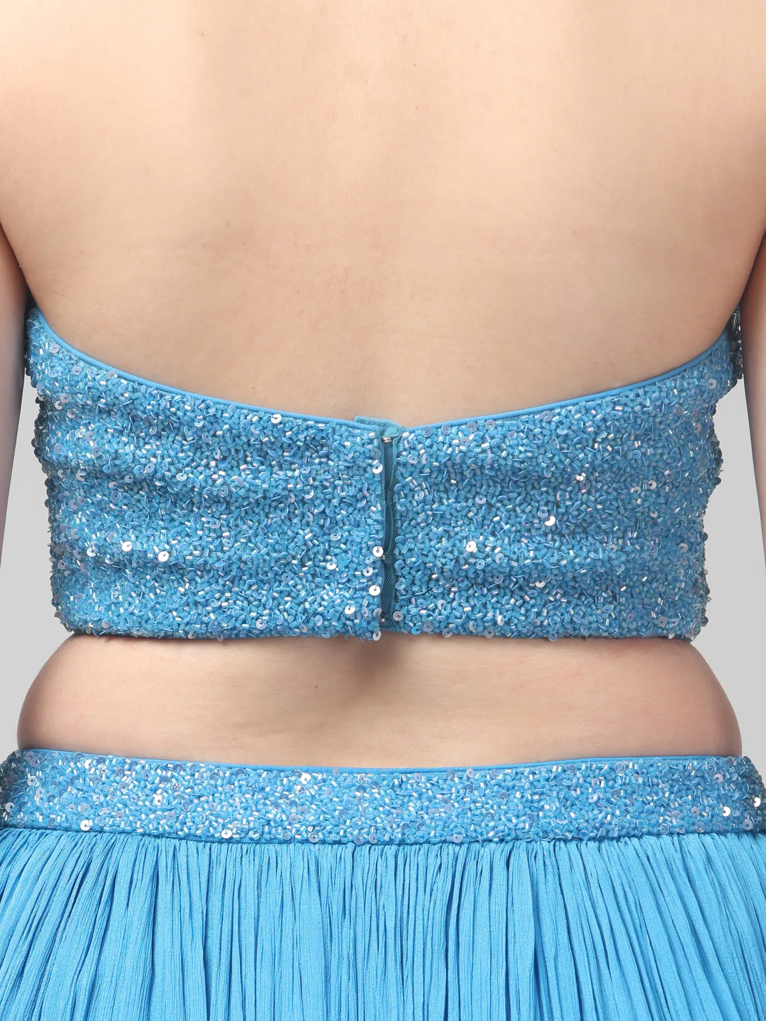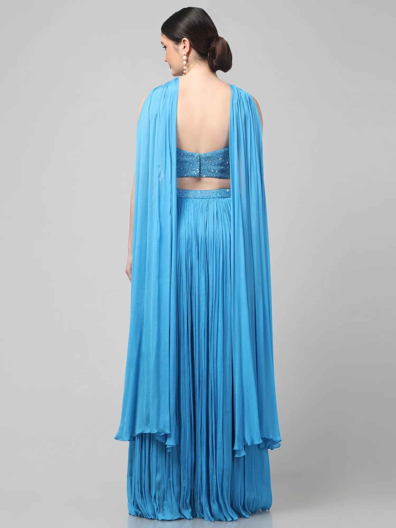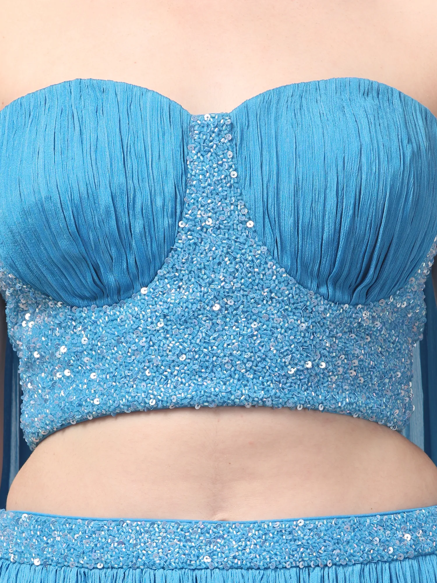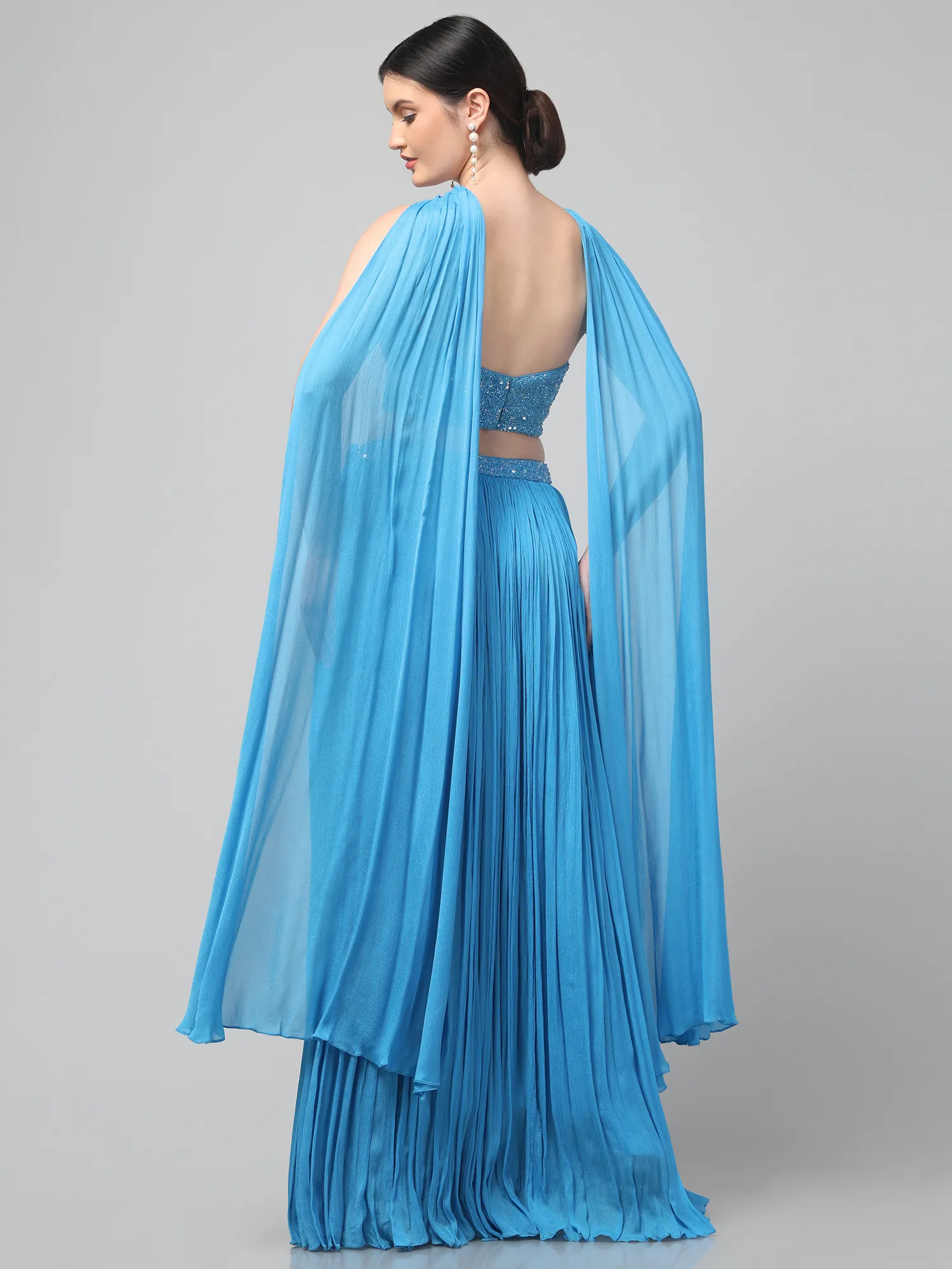 Sky Blue Corset Set with Pleated Skirt and Attached Drape Dupatta