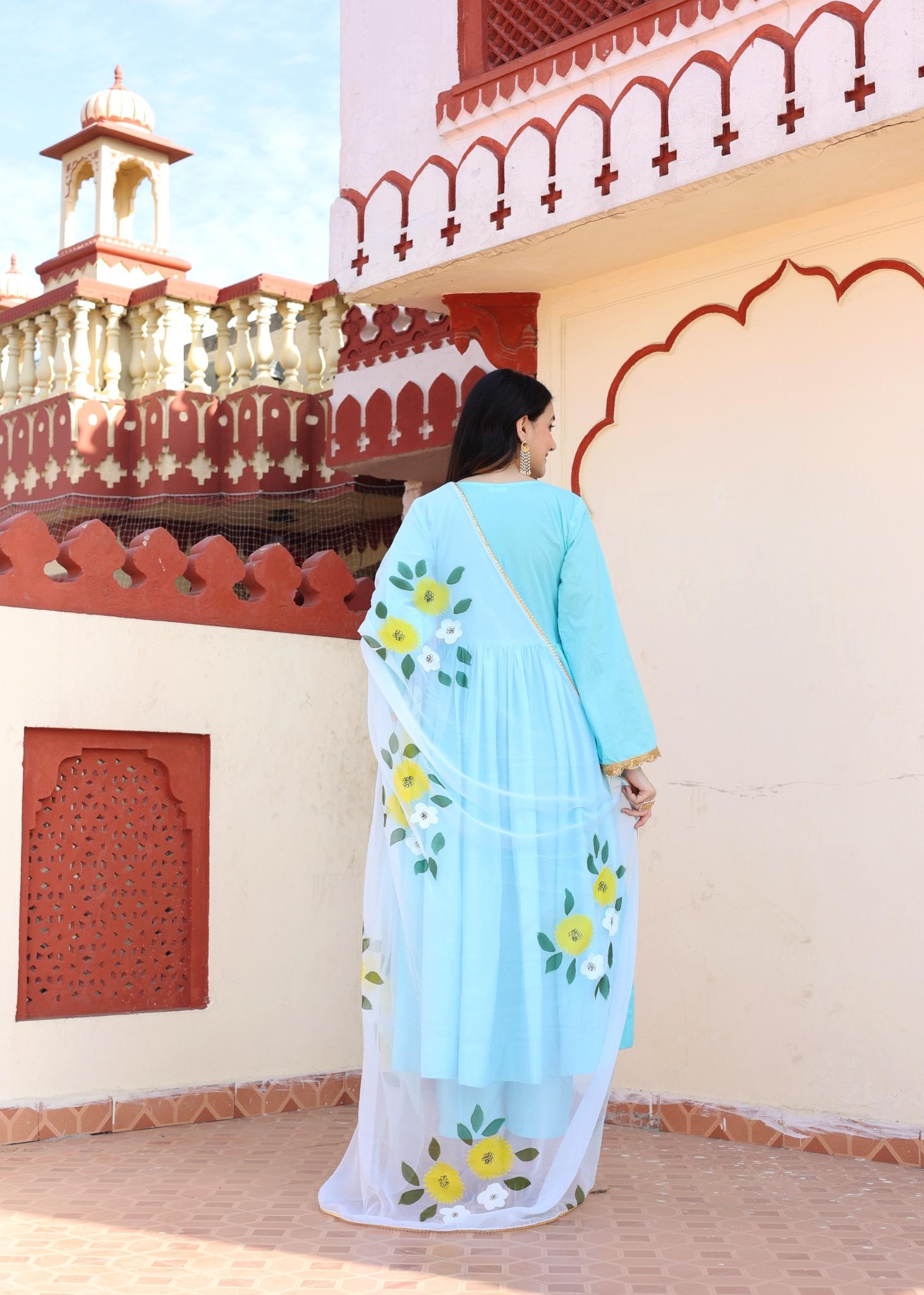 Sky Blue Cotton Anarkali Set with Hand-Painted Georgette Dupatta