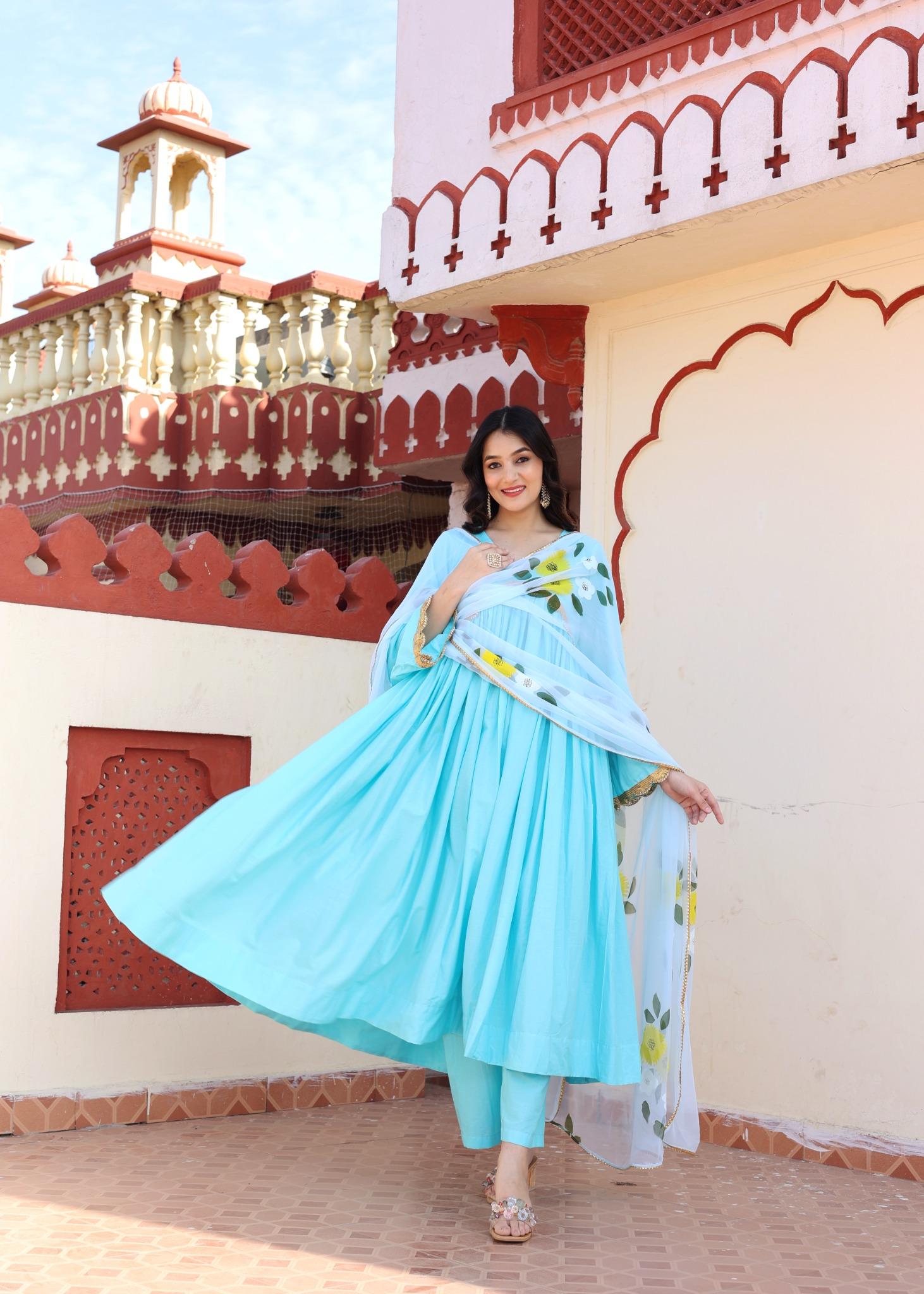 Introducing a sky blue cotton Anarkali set that blends breathable comfort with timeless artisanal charm. Crafted in premium-quality cotton, the Anarkali features a graceful flare and fluid movement, making it ideal for effortless festive dressing. Paired with a hand-painted georgette dupatta that adds a touch of artistic elegance and visual depth, this ensemble is perfect for daytime celebrations and refined festive gatherings.